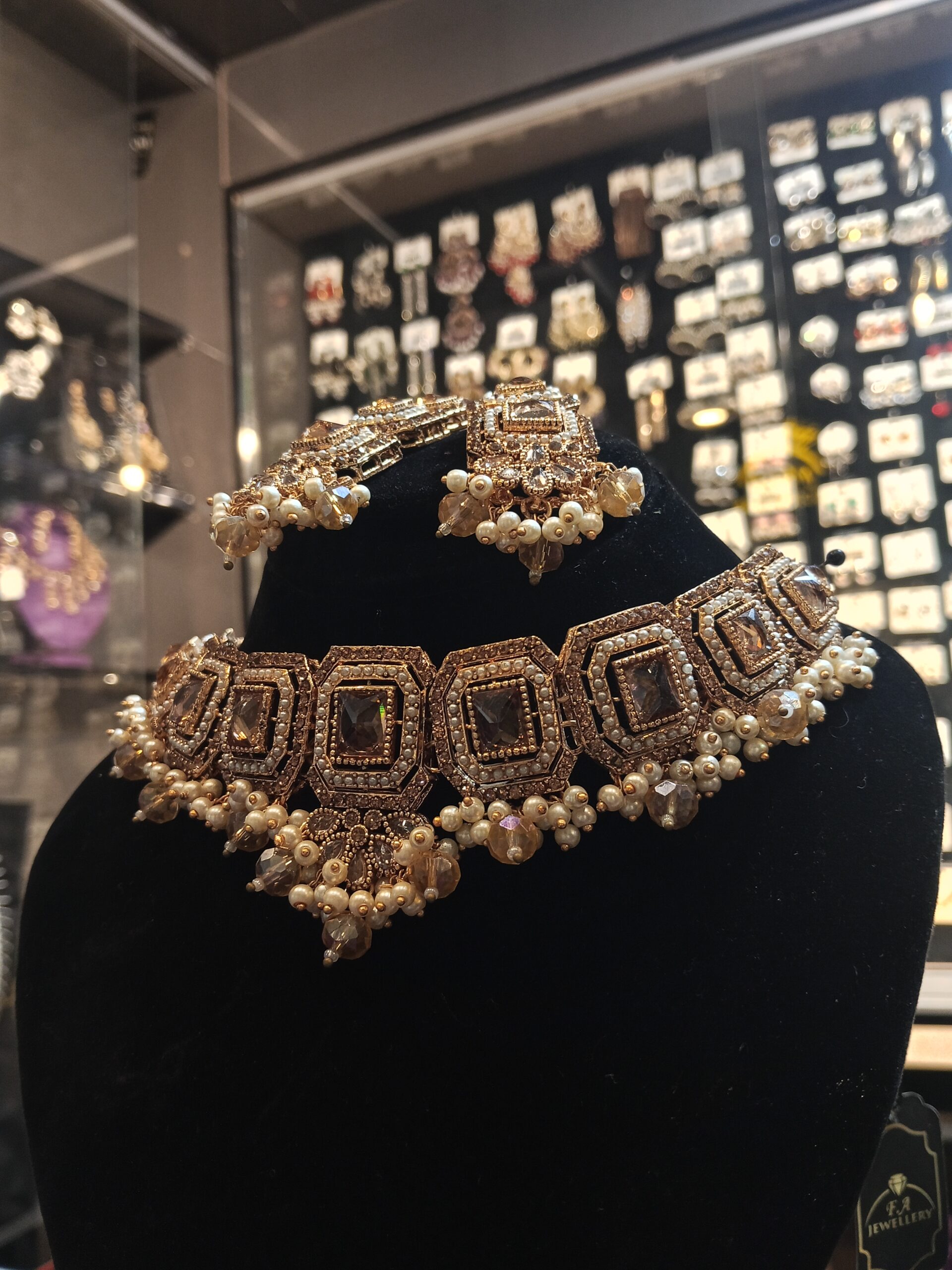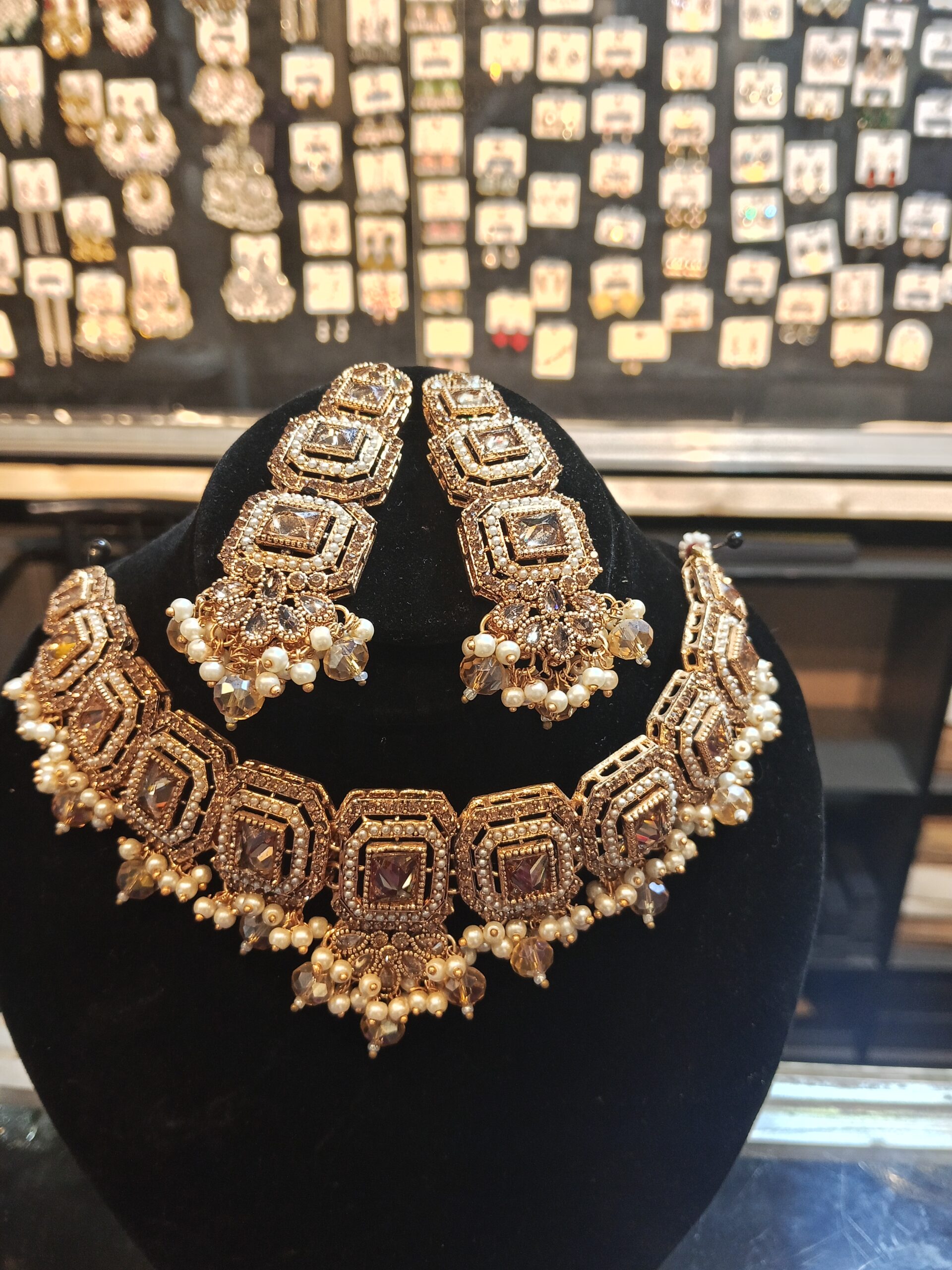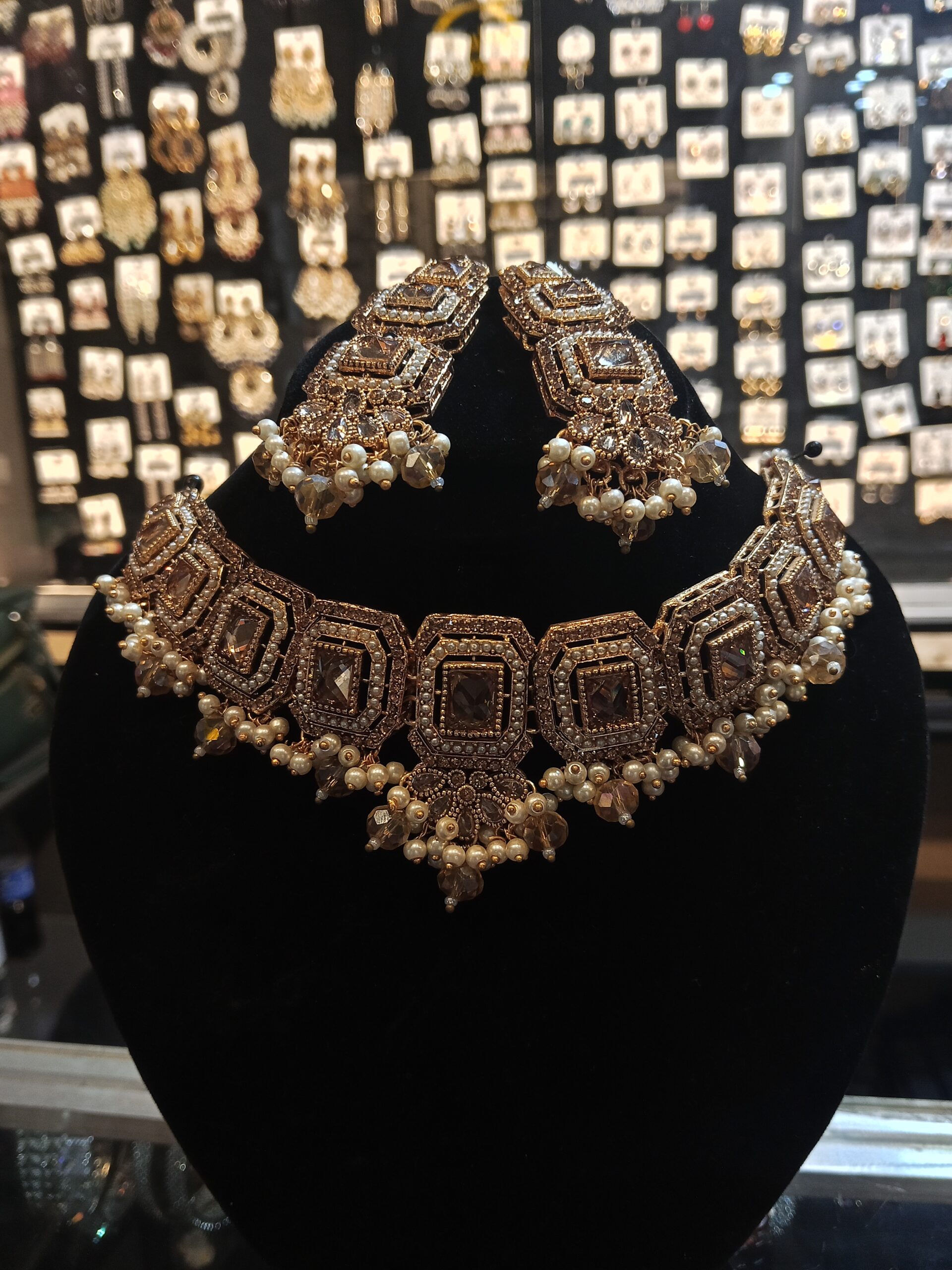 Exude royal charm with this magnificent Antique Gold Choker Set. Inspired by classic Kundan and traditional South Asian jewelry, this set features a striking collar necklace and matching drop earrings (Jhumki style). The choker is comprised of ornate linked segments, each featuring a captivating mocha or champagne square-cut gemstone framed by a halo of clear crystals. The entire piece is finished in a rich, aged antique gold tone and beautifully accented with dangling clusters of luminous white and light brown (or champagne) pearls/beads. This is the perfect statement piece for a bride, a wedding guest, or anyone desiring an opulent, heritage-inspired look.