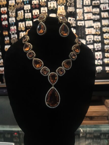 - Gemstone Detail: Features square, faceted mocha or light brown/champagne crystals set in an ornate frame.