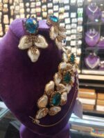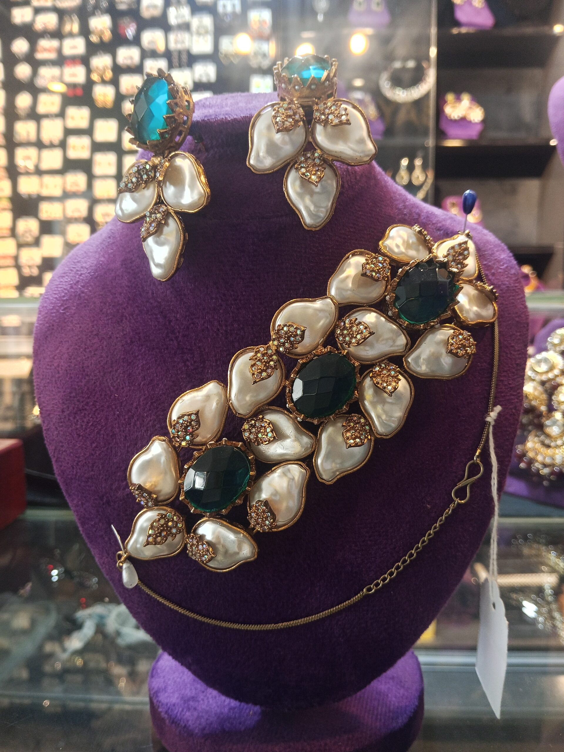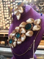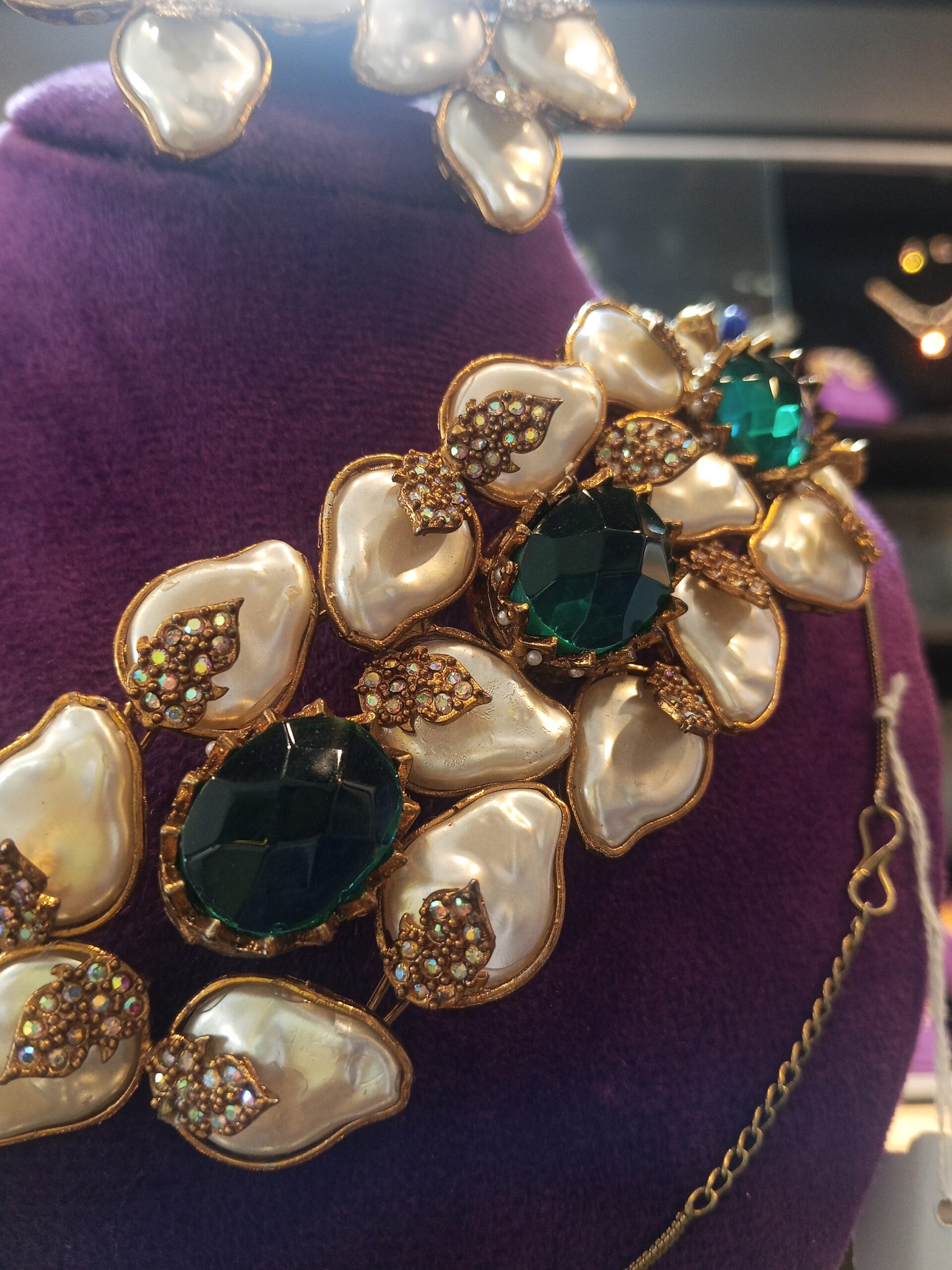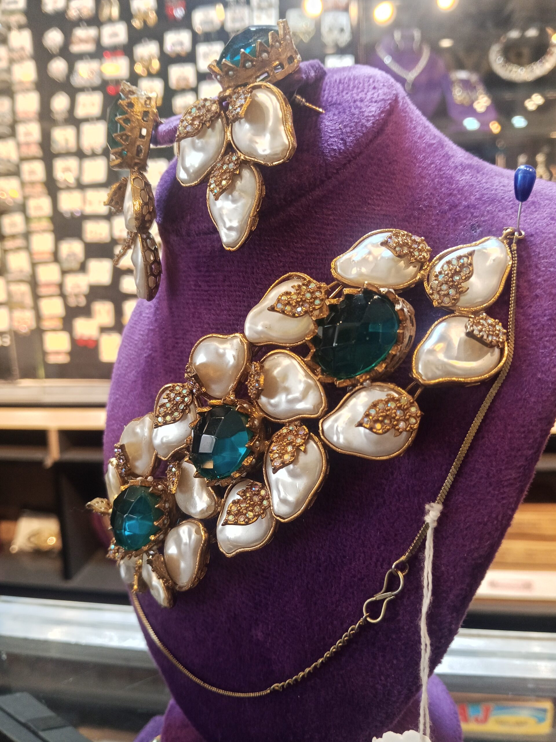 Embrace vintage glamour with this stunning Baroque Pearl and Emerald Crystal Jewelry Set. This distinctive pairing features a wide cuff bracelet and matching statement earrings, perfect for elevating any formal or festive attire. The design beautifully combines organic-shaped, creamy Baroque pearls with captivating, deep Emerald Green oval crystals. Each element is set in a rich gold-toned metal and accented with tiny, sparkling clear rhinestones, giving it an heirloom quality and truly luxurious appeal. It’s a spectacular choice for wedding guests, mehndi, or any grand celebration.