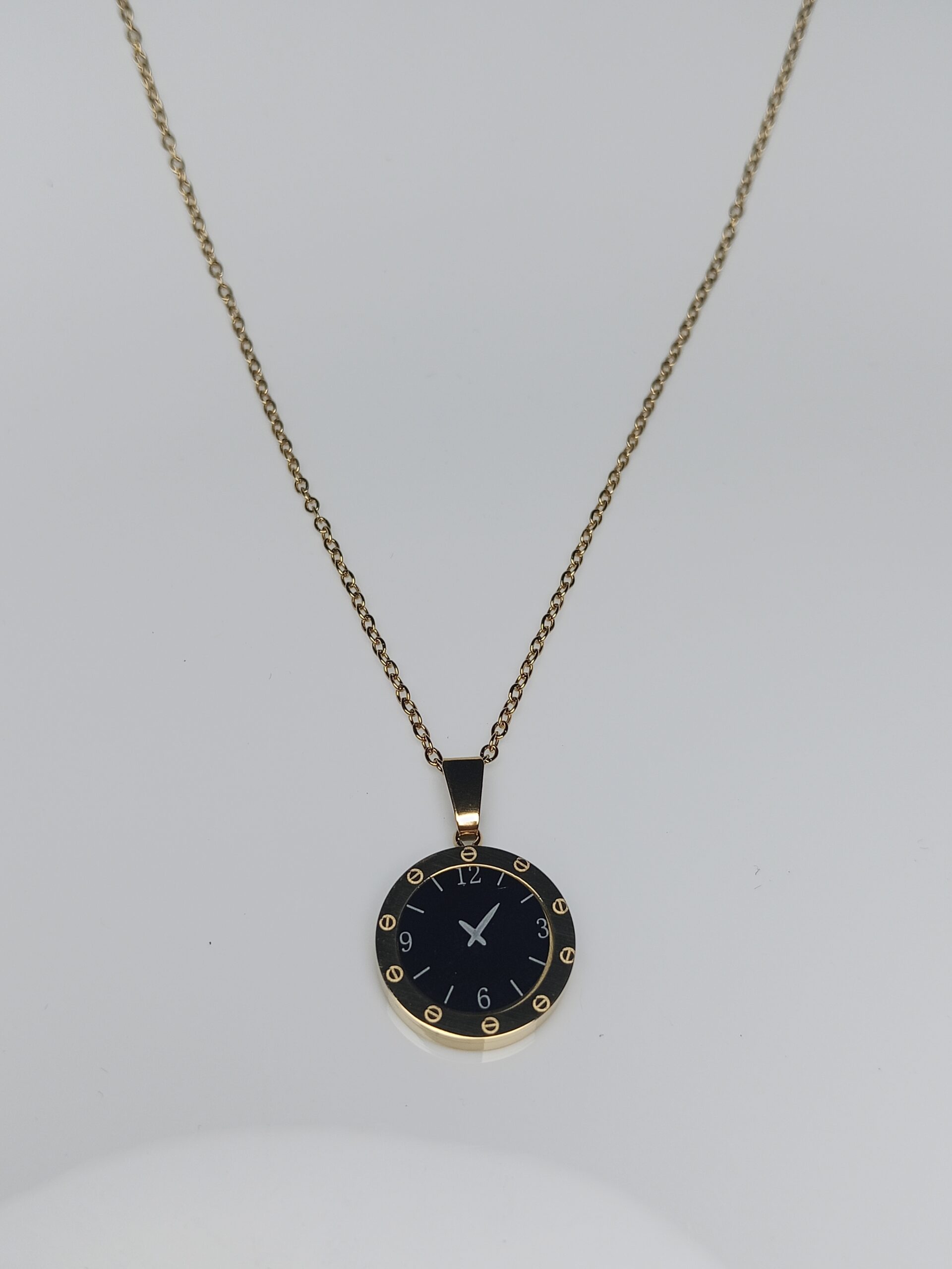 Add a touch of timeless sophistication to your accessories collection with this unique watch-face pendant necklace. This piece features a striking black dial with classic markers set in a polished gold frame, merging the elegance of a timepiece with modern jewelry design. It’s a chic and intriguing accessory for both casual and semi-formal wear.
