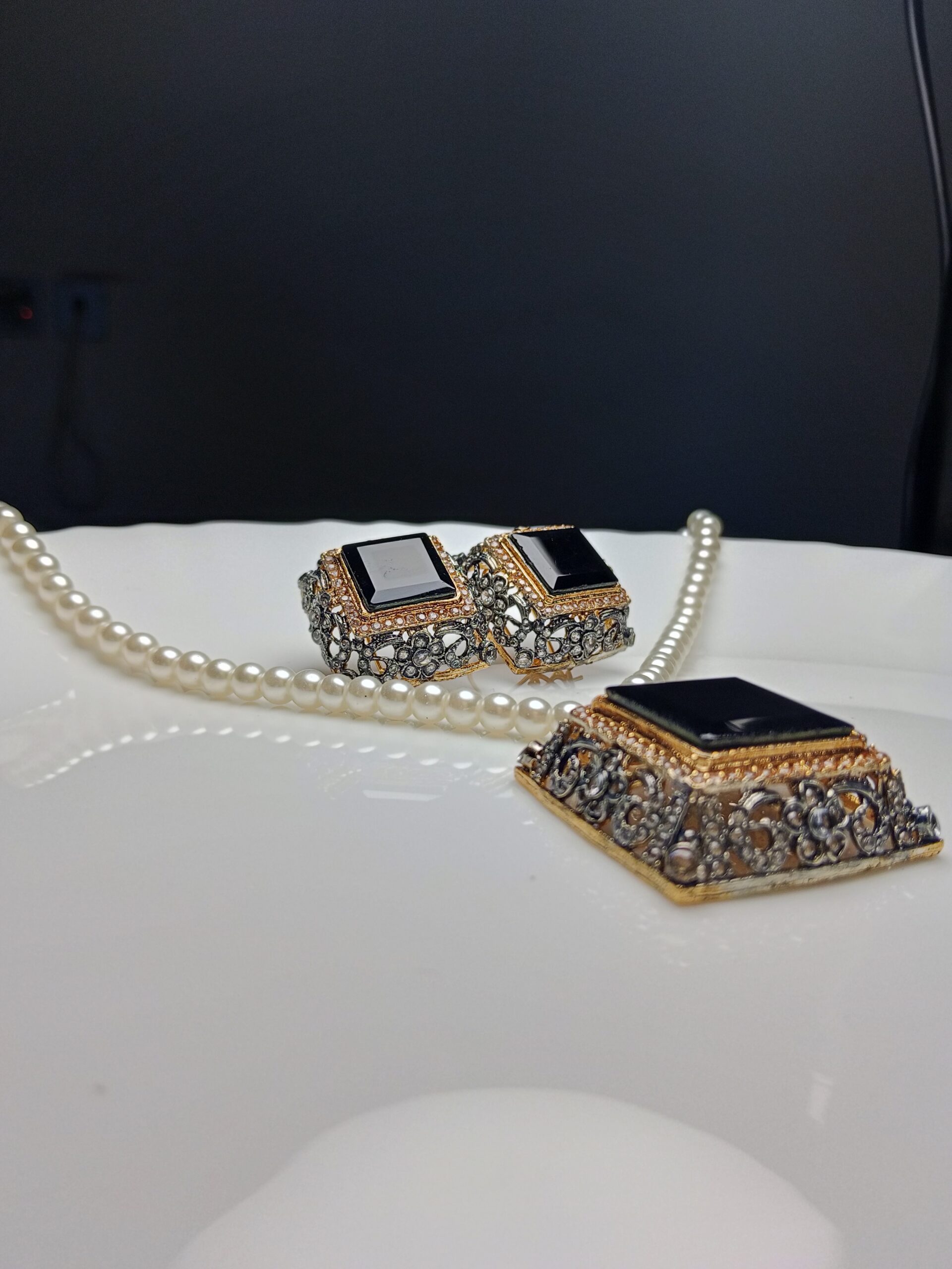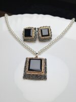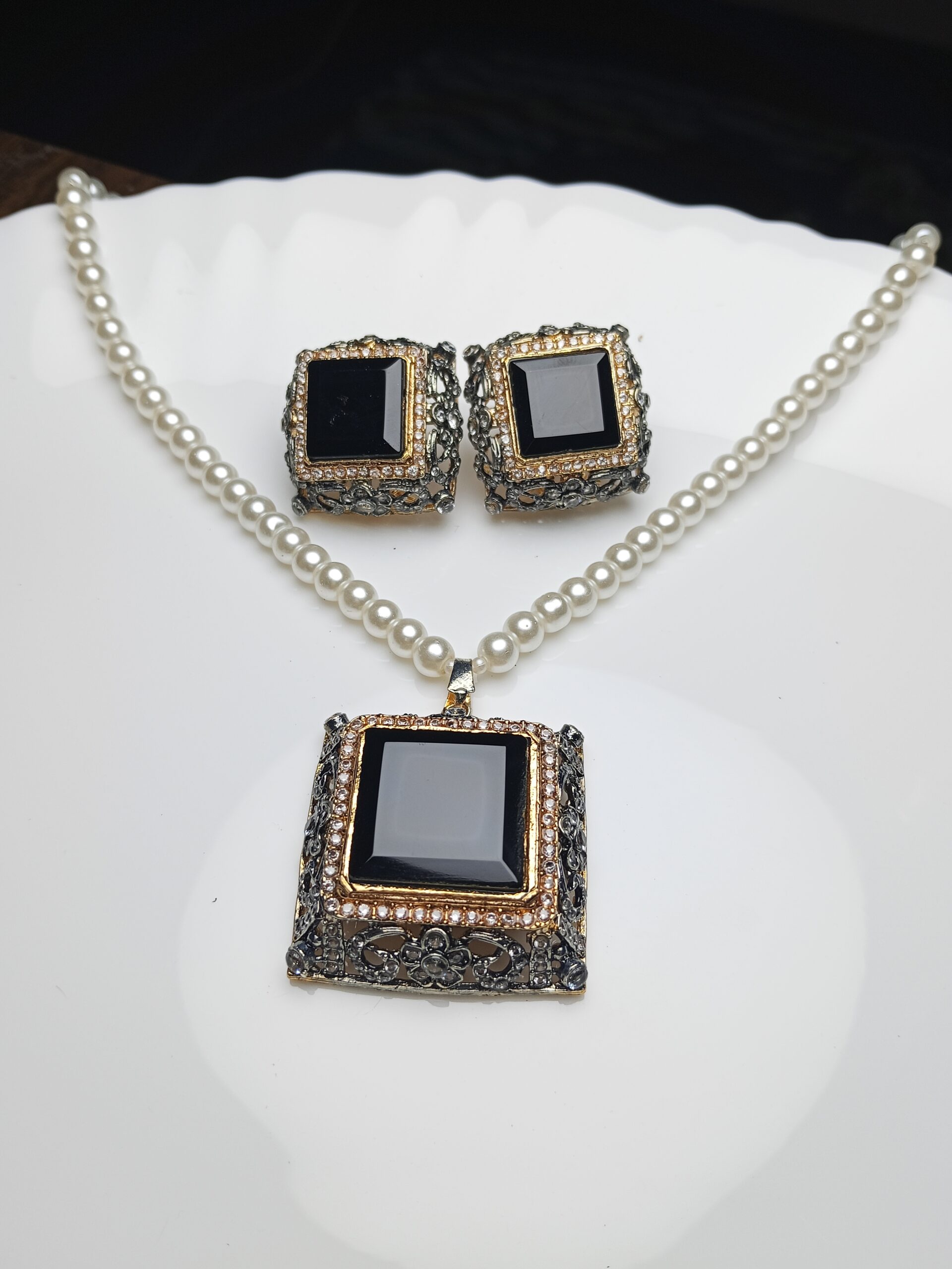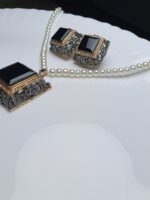 Achieve a look of understated glamour with this striking necklace and earring set. Featuring bold, geometric black stones set within an intricate vintage-style metal casing, the dark centers provide a powerful contrast to the classic, delicate pearl chain. This set is perfect for a refined and powerful look.