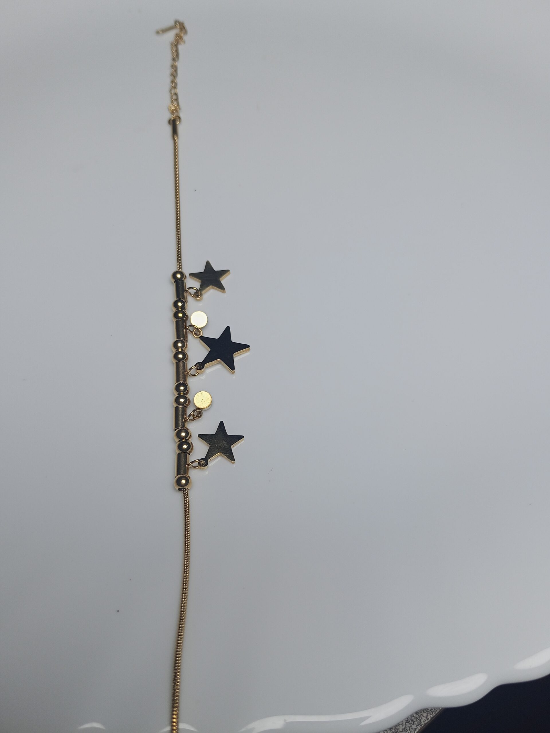 • Charms: Three glossy, enamel-filled (or solid high-polish) star pendants that drop from the chain.