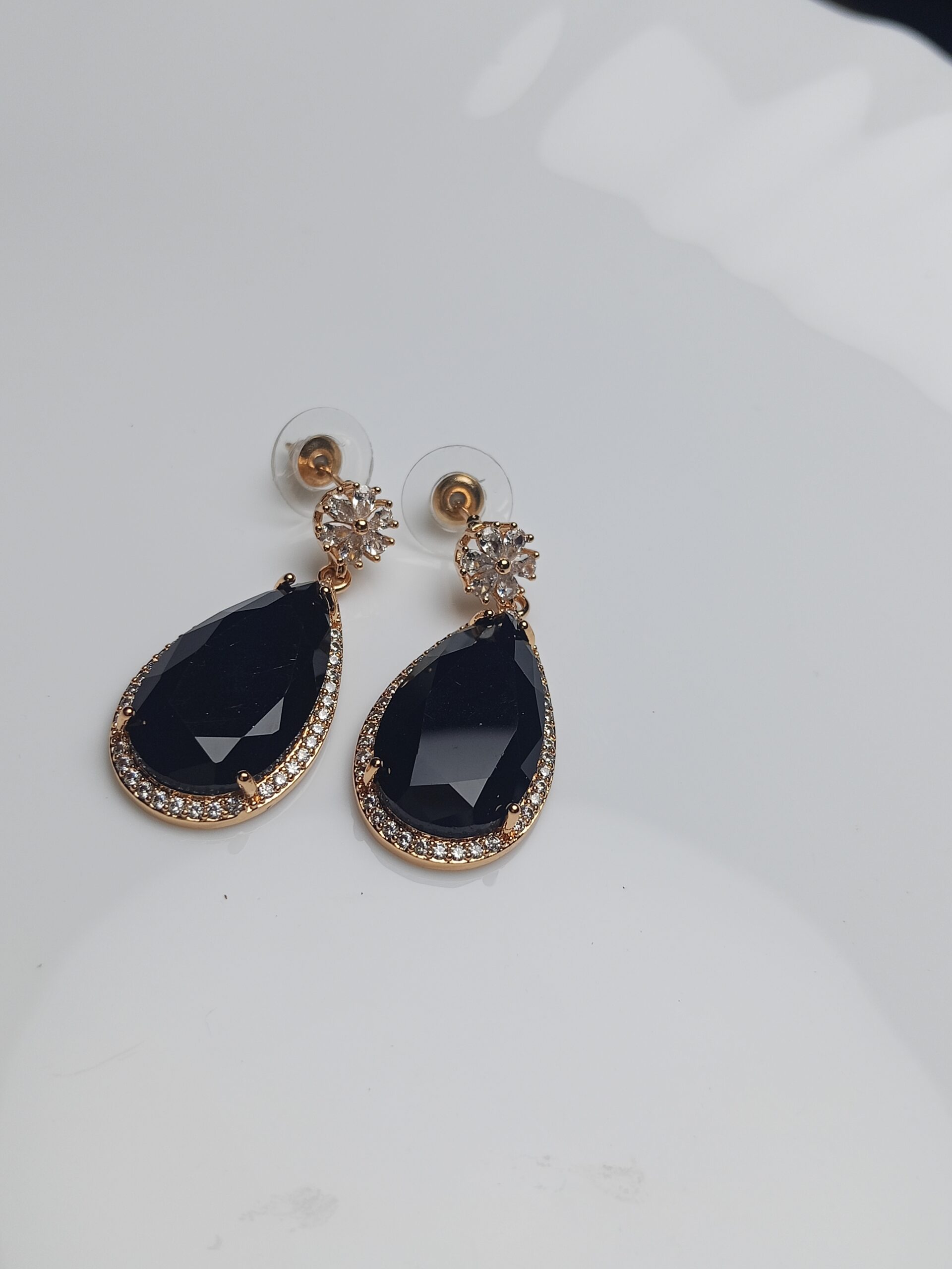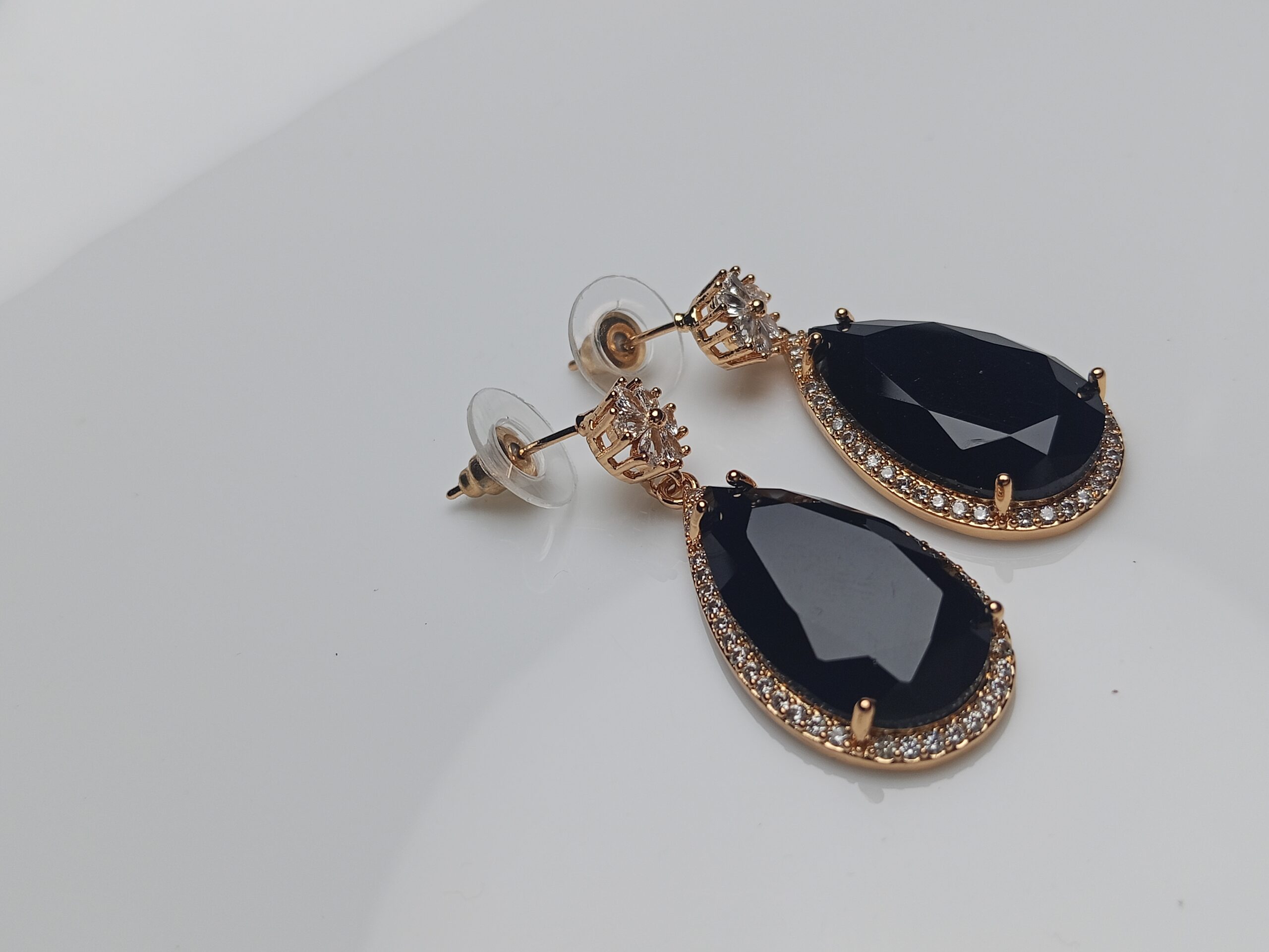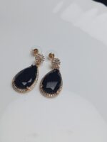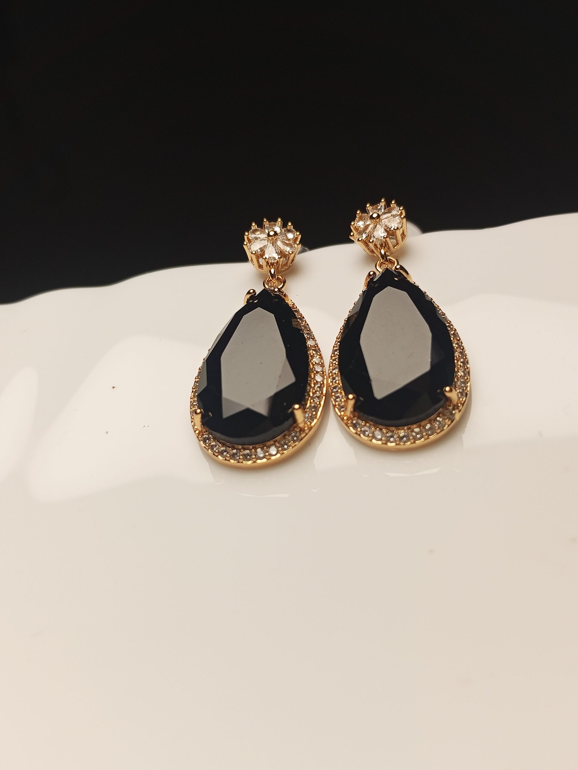 Chic Black Onyx Look Teardrop Dangle Earrings | Gold Plated CZ Evening Wear