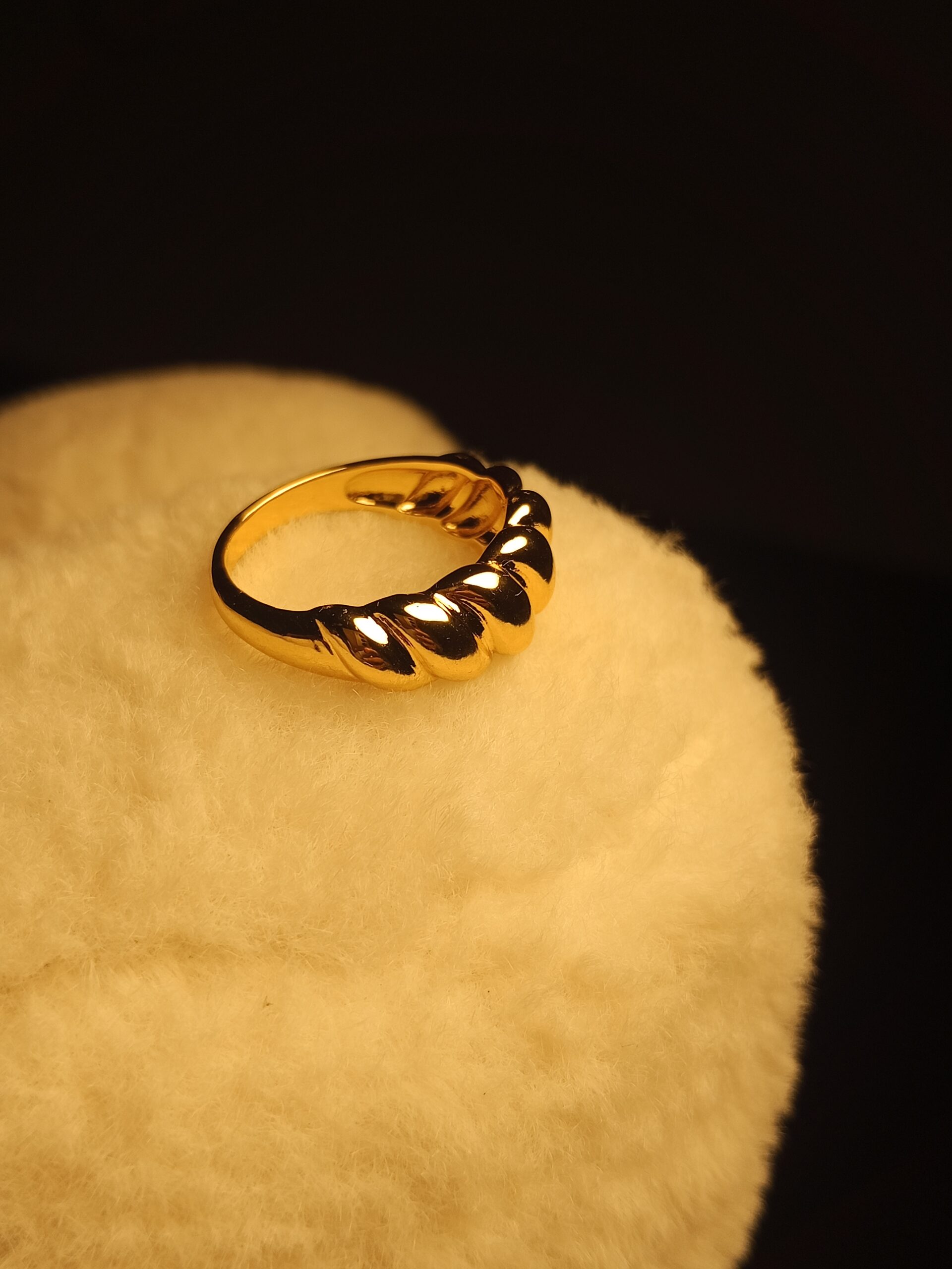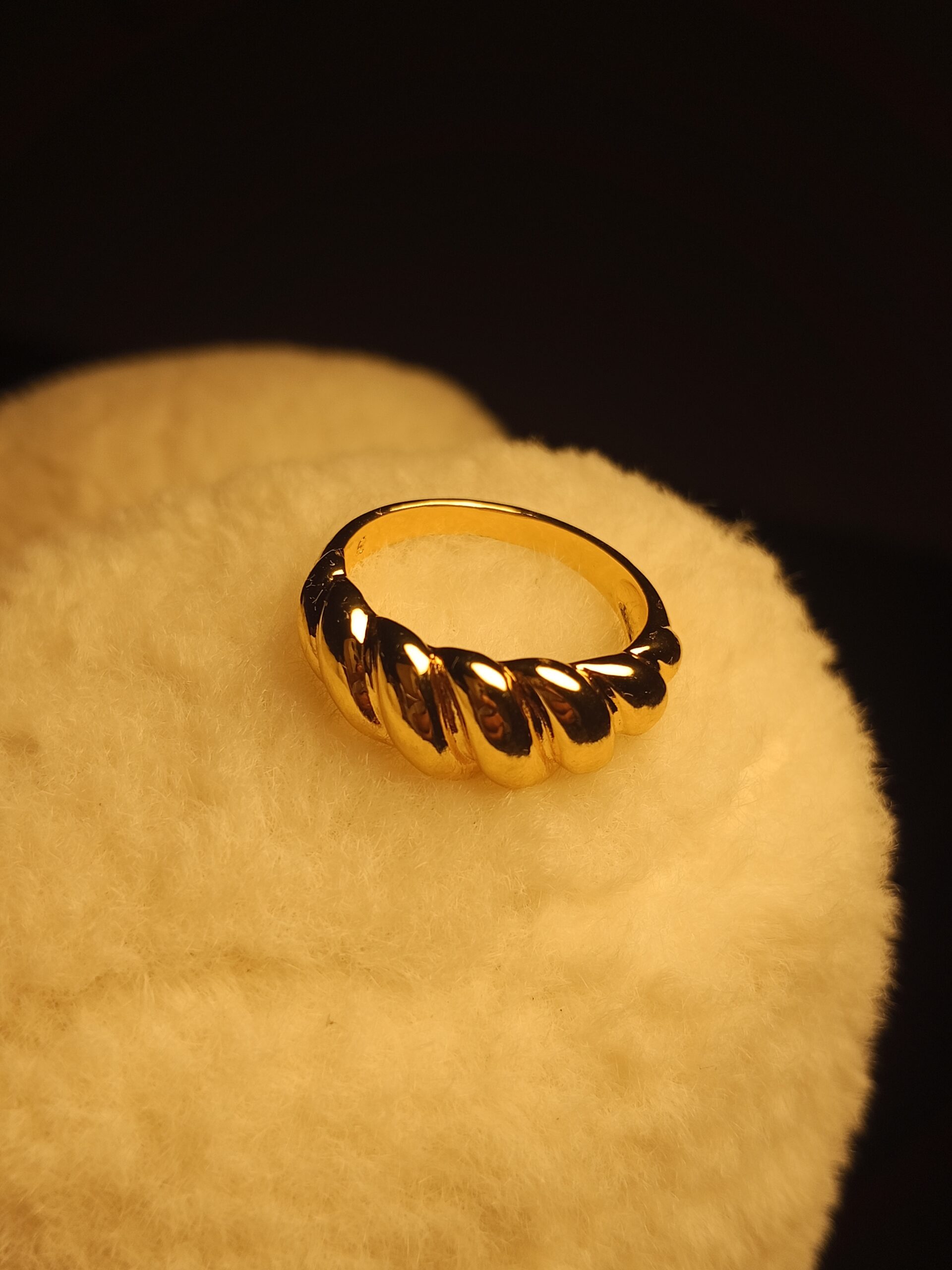 Introduce a touch of contemporary elegance with this stylish Croissant Dome Ring. Inspired by the trending “croissant” jewelry design, this ring features a beautifully twisted and ribbed texture that gives it a sophisticated, sculptural look.
