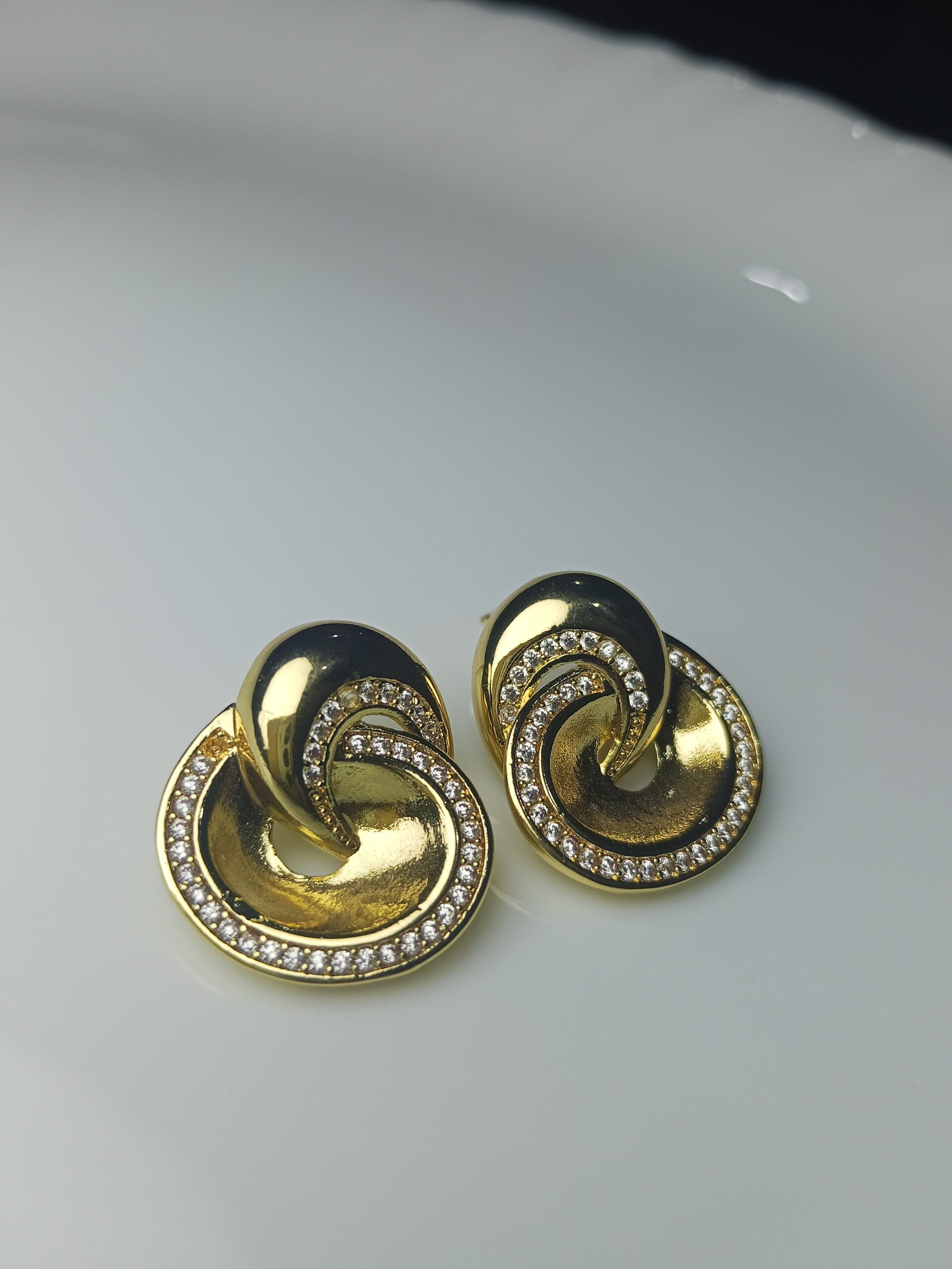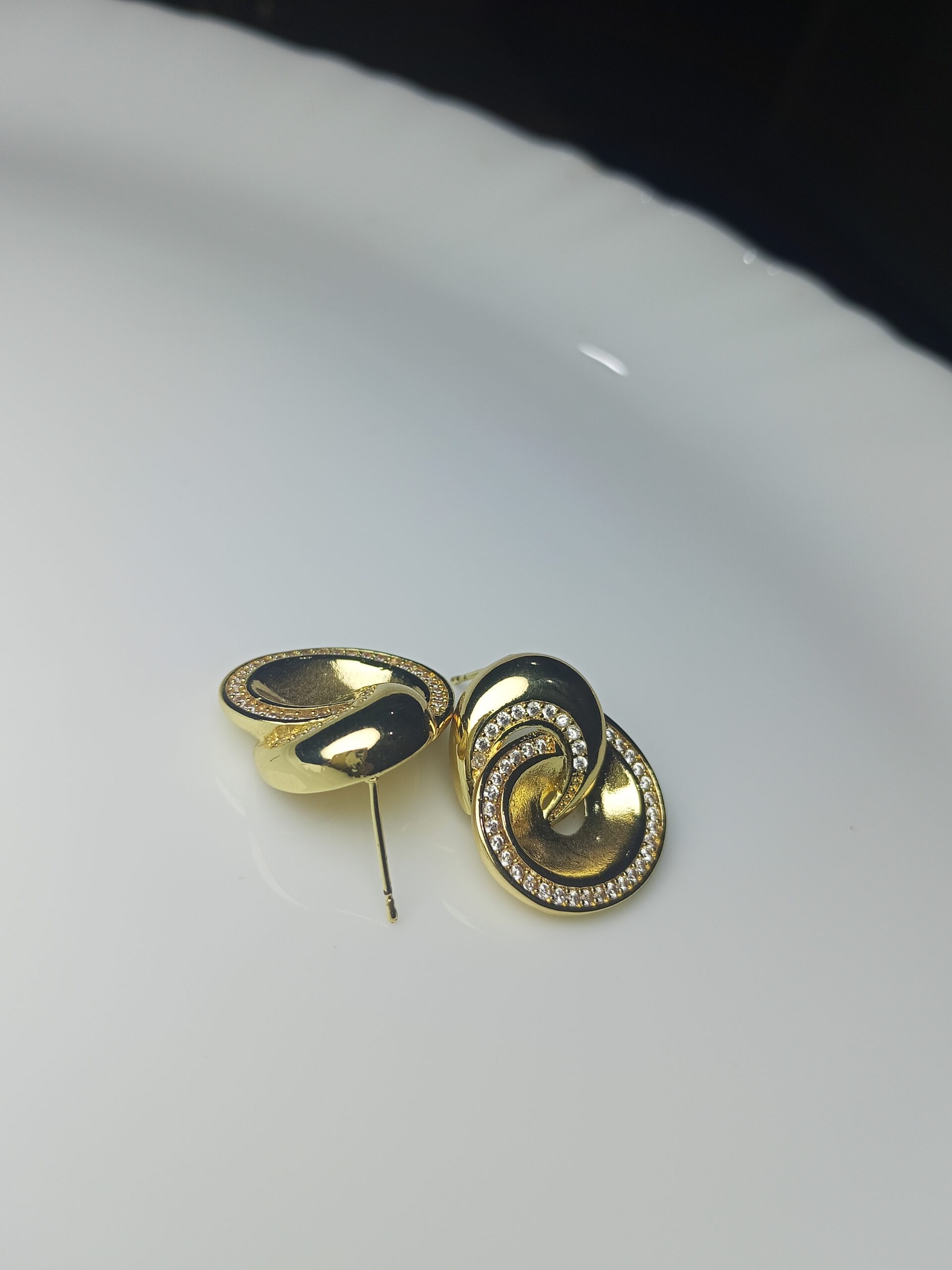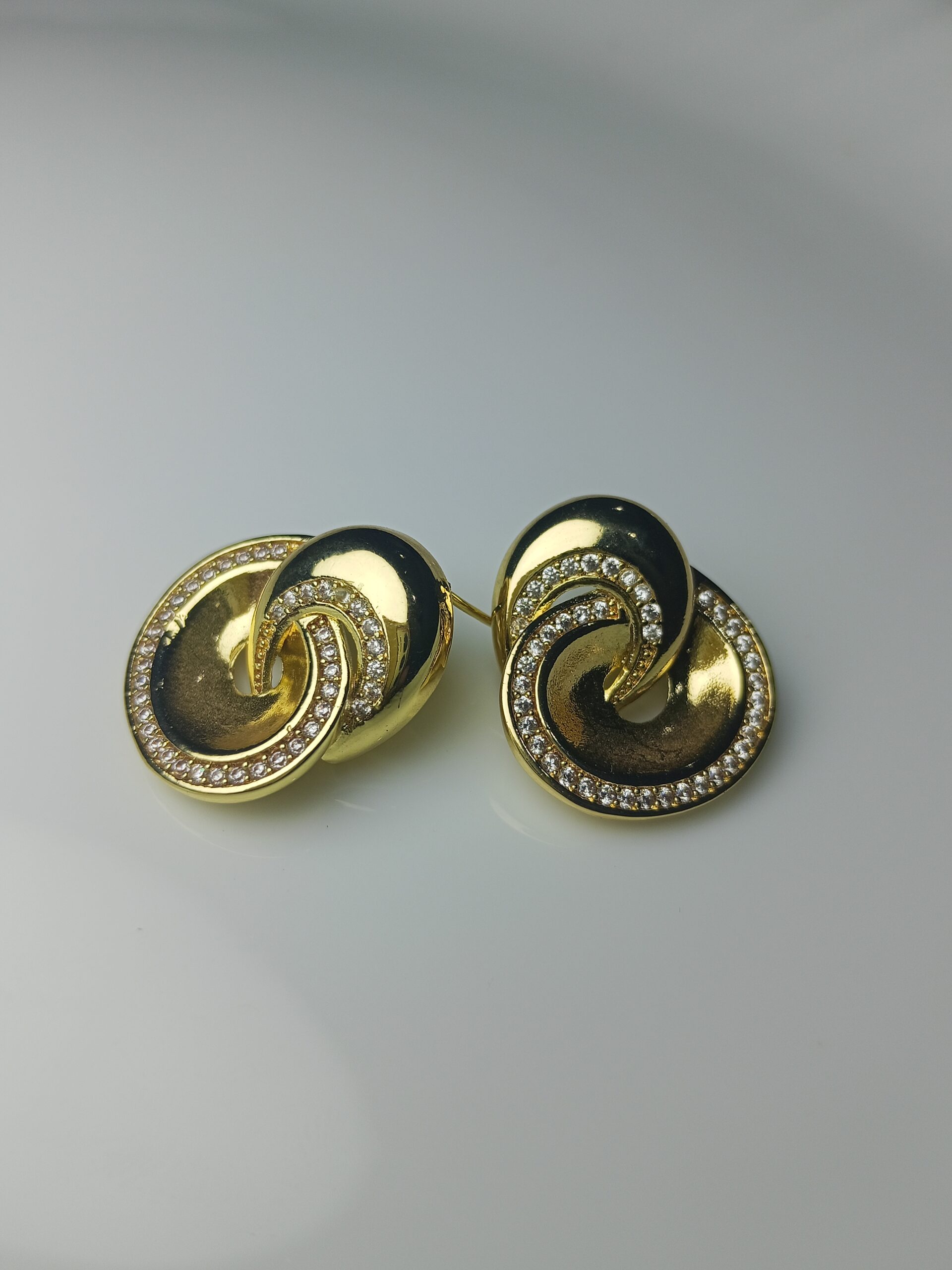 Achieve effortless glamour with our Chunky Interlocking Gold Circle Stud Earrings. These magnificent earrings feature a bold design of two interlinked circles, creating a striking, dimensional knot effect. One circle is finished in a smooth, high-shine gold polish, while the second circle is elegantly outlined with a continuous border of dazzling white pavé crystals. This combination of rich gold and brilliant sparkle gives these earrings a high-end, luxury feel. Perfect for adding a substantial touch of shine to an evening outfit, a wedding guest look, or simply elevating your everyday style. They are a true statement piece that perfectly blends classic shape with modern sparkle.