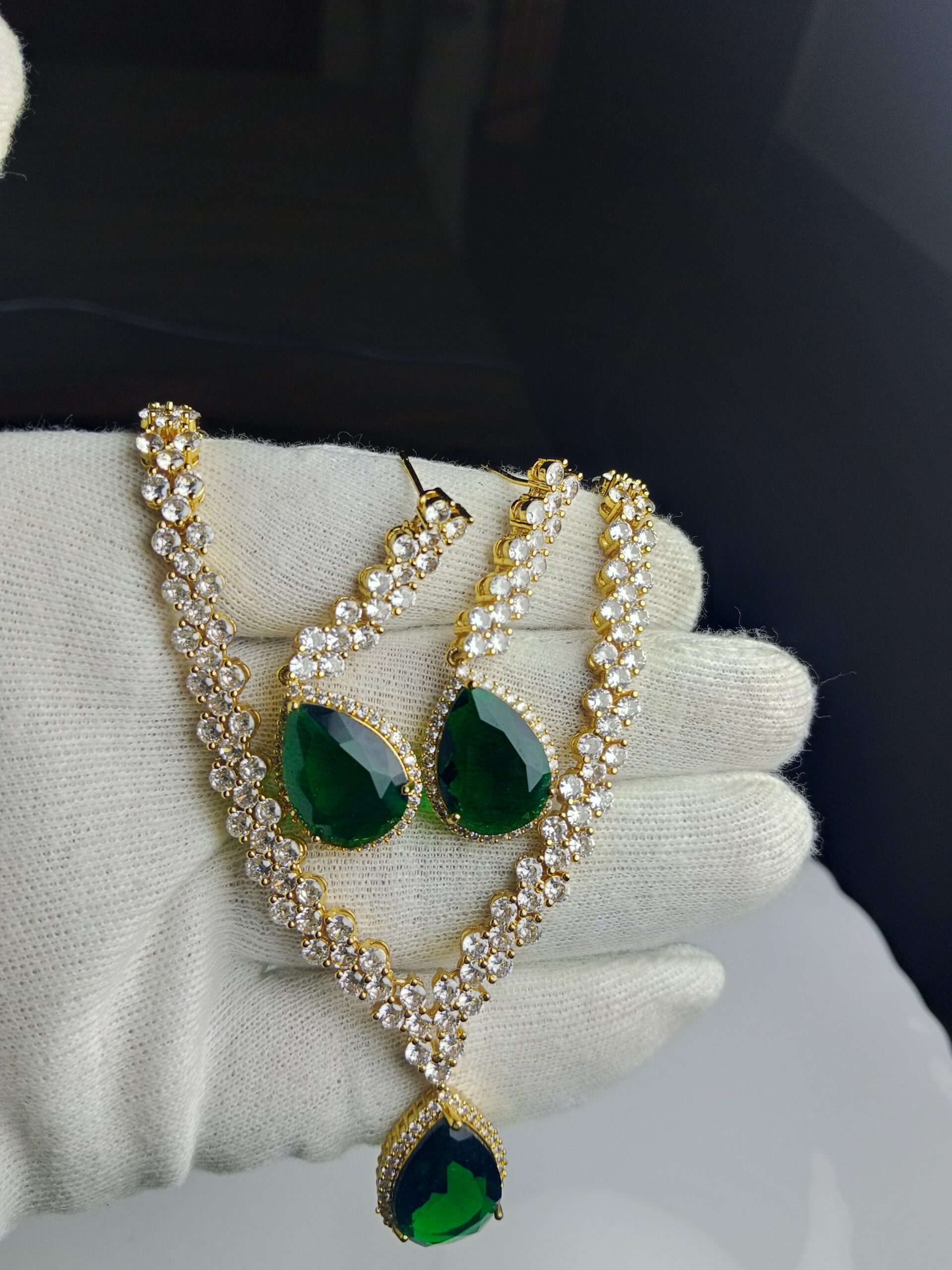 Classic Emerald Green Tear Drop Necklace & Earring Set | Gold Plated Party Wear