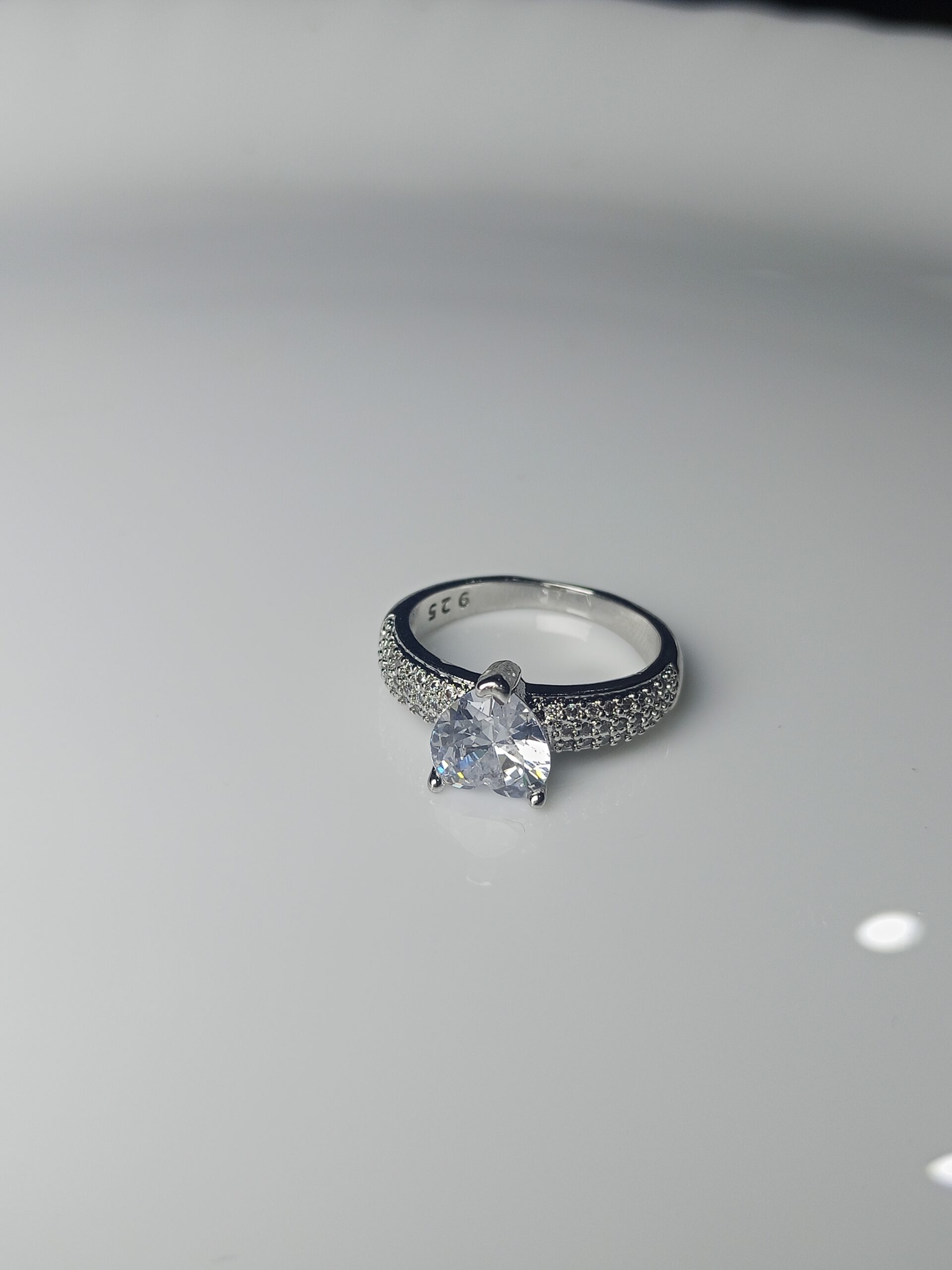 - Band Detail: Wide, tapered shoulders fully covered in shimmering pave-set CZ stones.