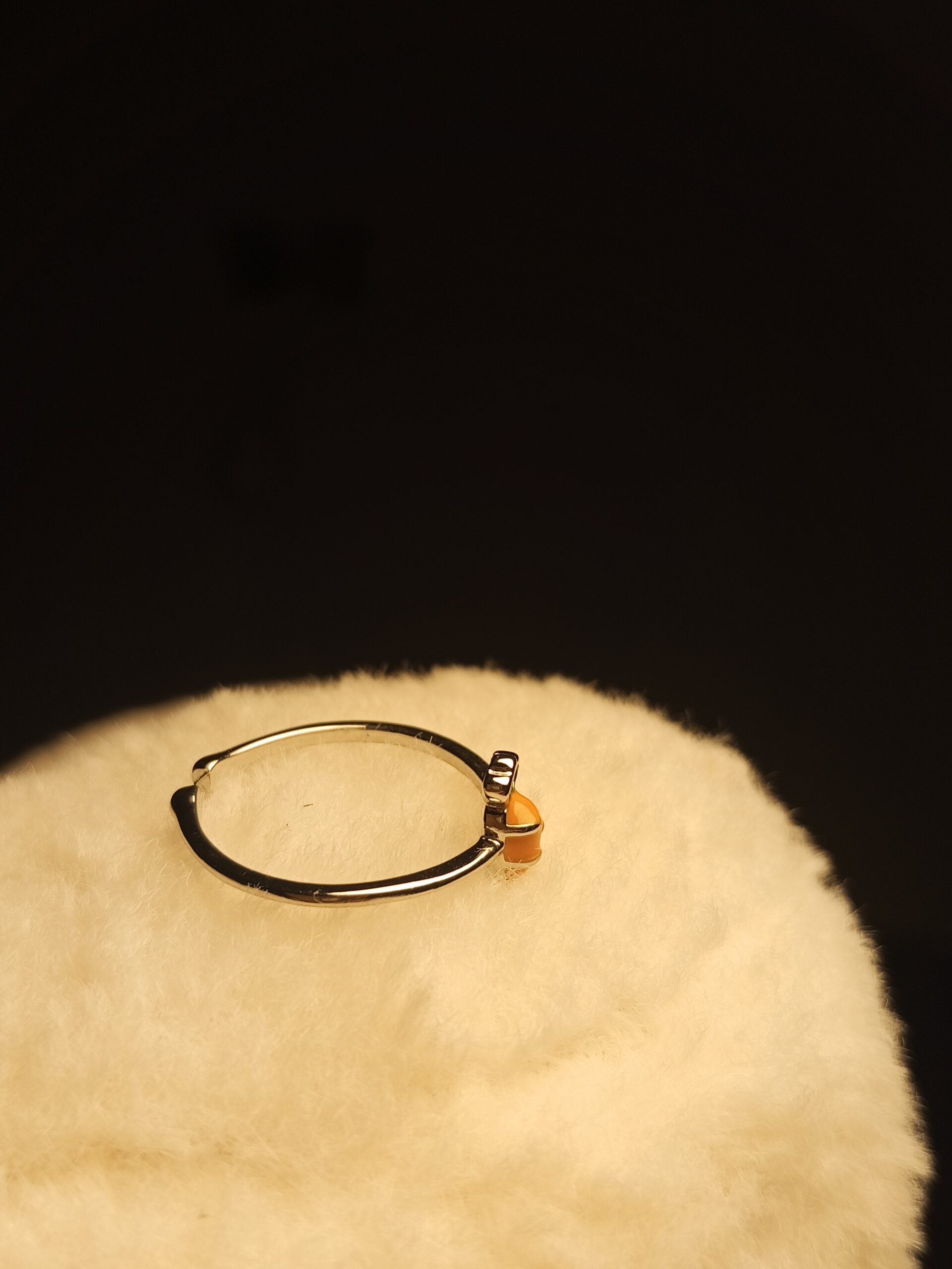 Add a playful and whimsical touch to your collection with this sweet Carrot Charm Ring. This unique piece features a miniature, brightly colored enamel carrot charm suspended from a slender, polished band.