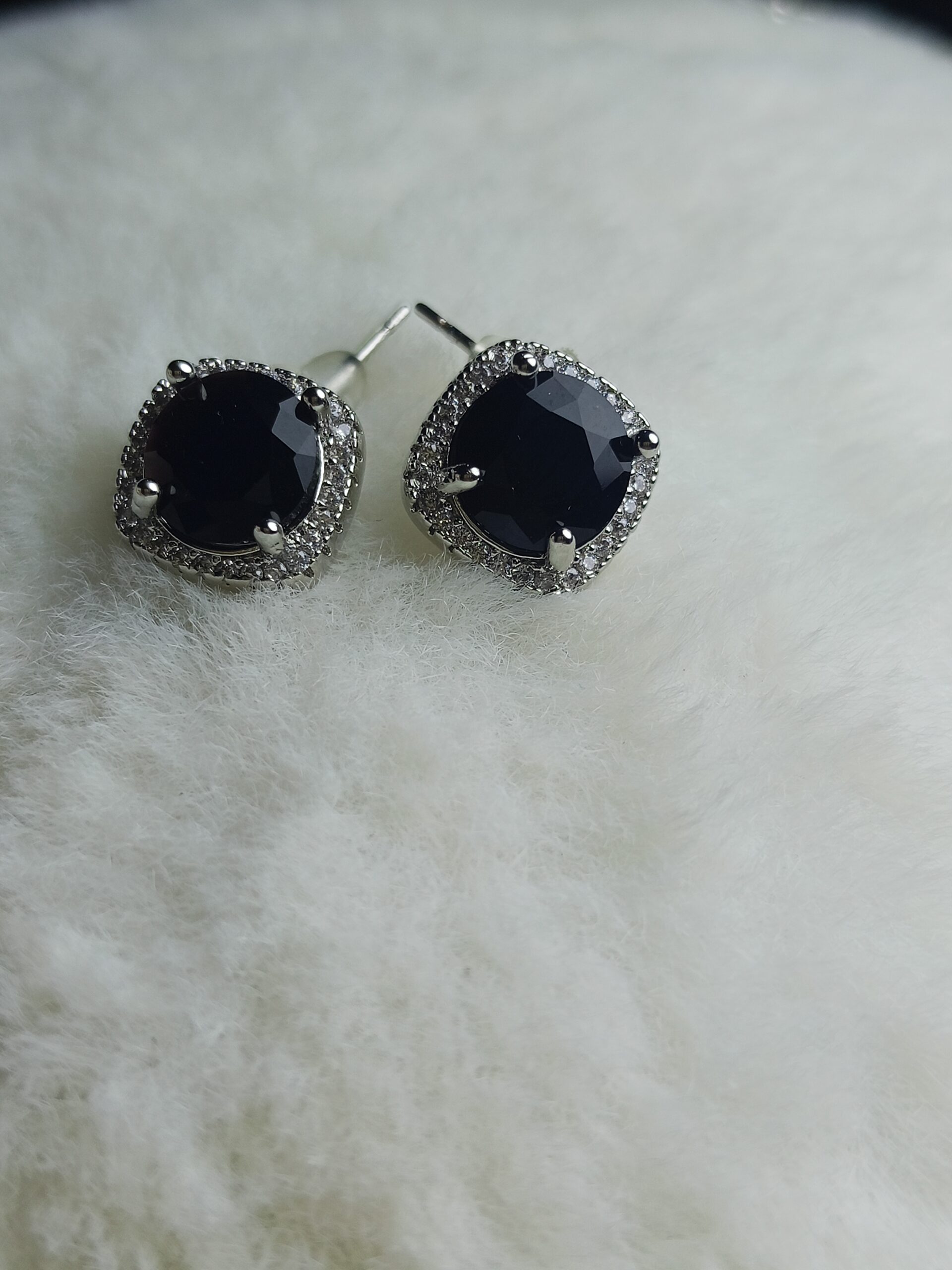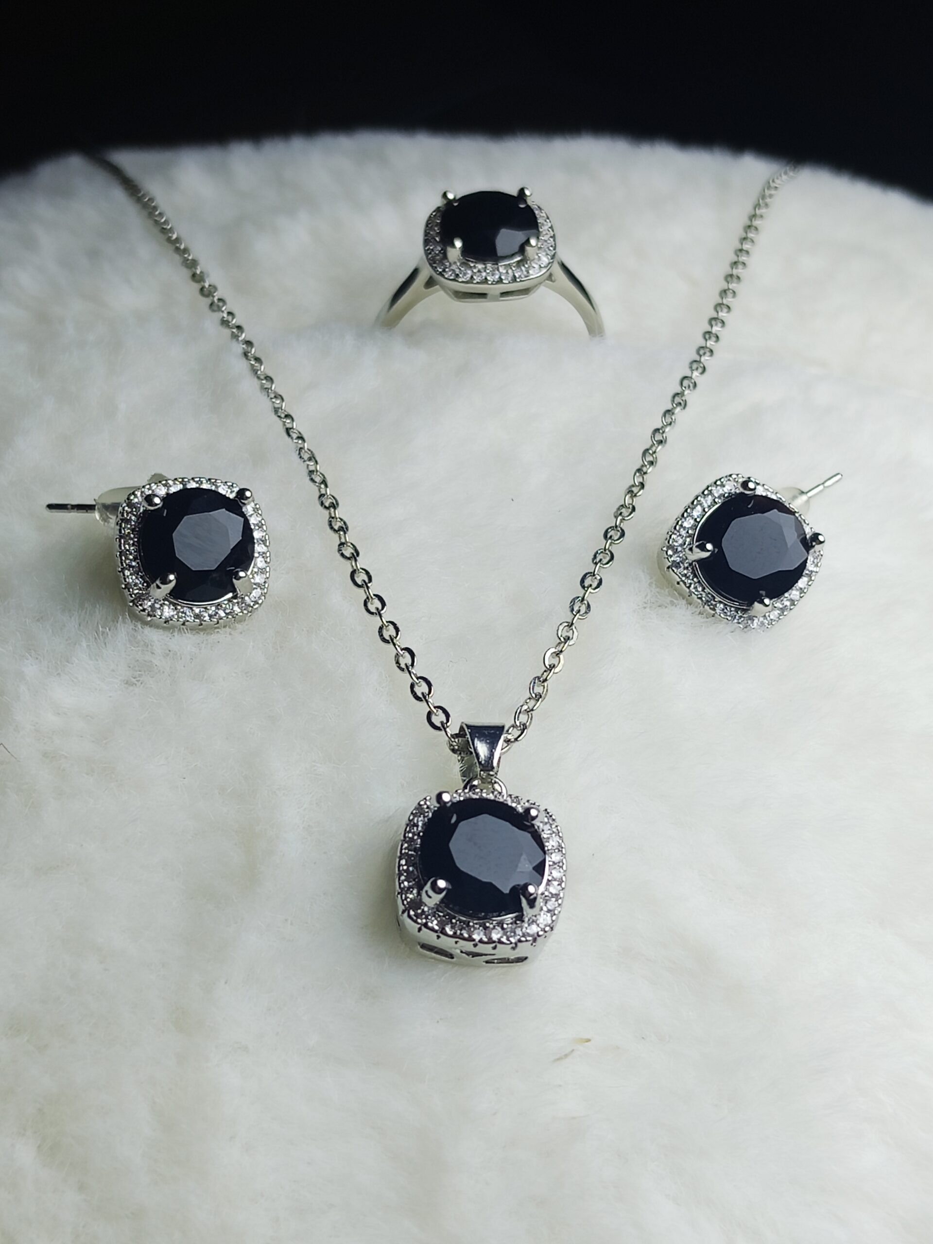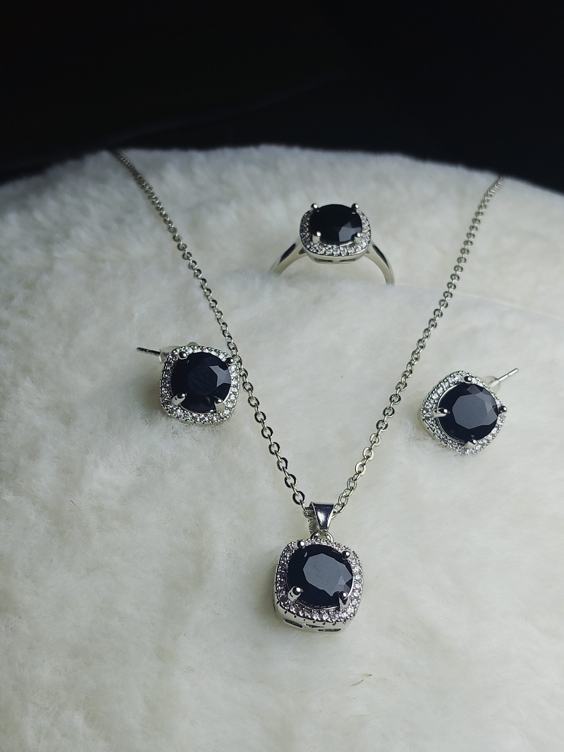 The centerpiece is a stunning cushion-cut black zirconia, surrounded by a halo of tiny, shimmering white accent stones that catch the light beautifully. Whether you’re dressing up for a special evening or looking to add a luxurious edge to your everyday wear, this set is designed to turn heads.