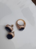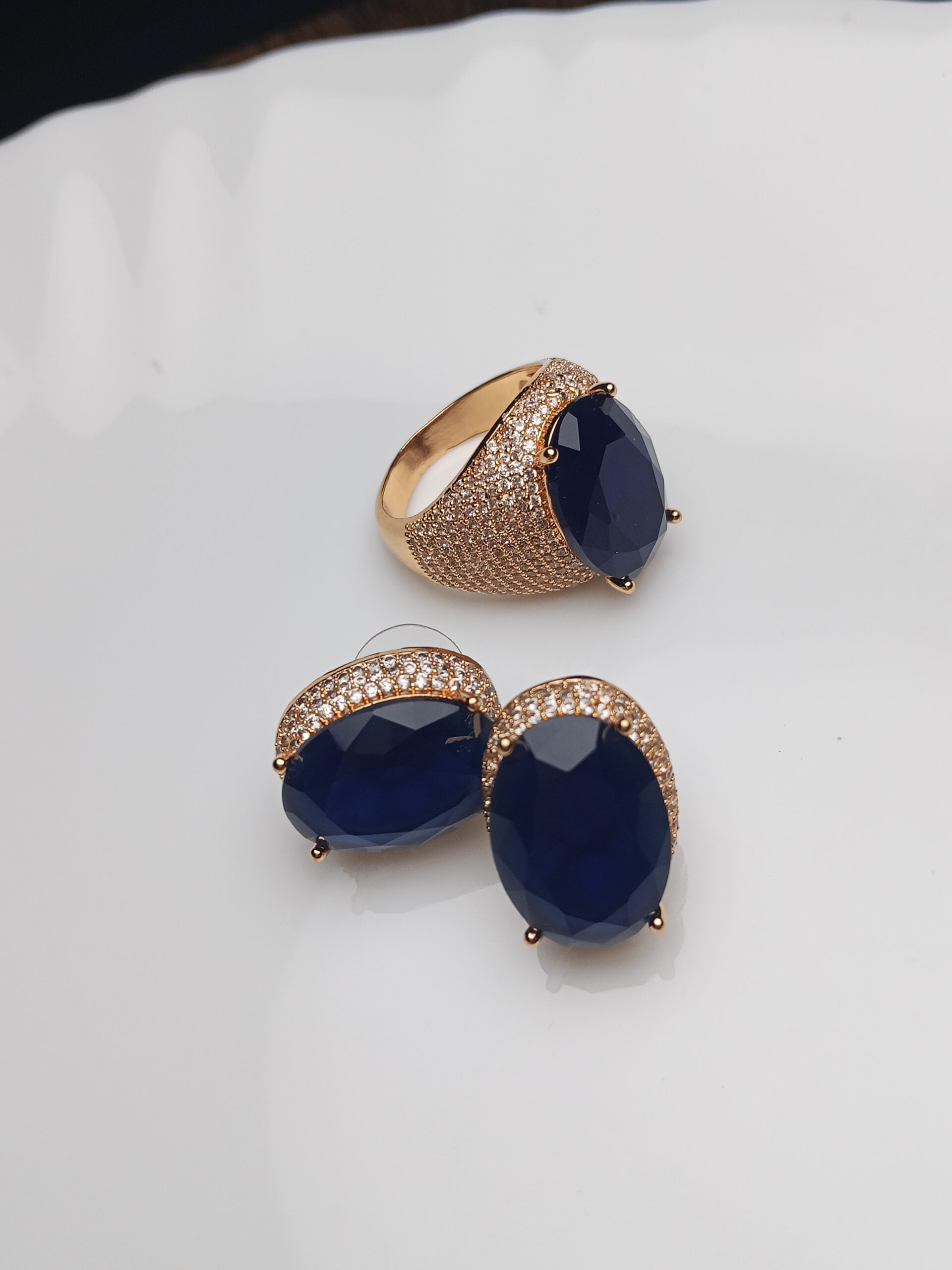 Elevate your style instantly with the Rose Gold & Midnight Sapphire Set, a truly luxurious pairing of stud earrings and a statement ring. This set features stunning, large oval-cut deep blue zircons that beautifully mimic the rich, mysterious color of a midnight sapphire.