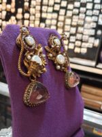 Celebrate natural beauty with these intricately designed drop earrings. The stunning composition features bold floral and leaf motifs, accented with luminous flat and round imitation pearls. A twisted gold-toned rope detail adds texture to the setting. The drop is completed by a large, faceted triangular stone with an attractive amethyst-pink/smoky quartz hue, framed by delicate gold beading. Finished in a rich antique gold tone, these earrings are a true statement of craftsmanship, ideal for those seeking unique, designer-inspired jewelry for Sangeet nights, garden parties, or fusion ensembles.
