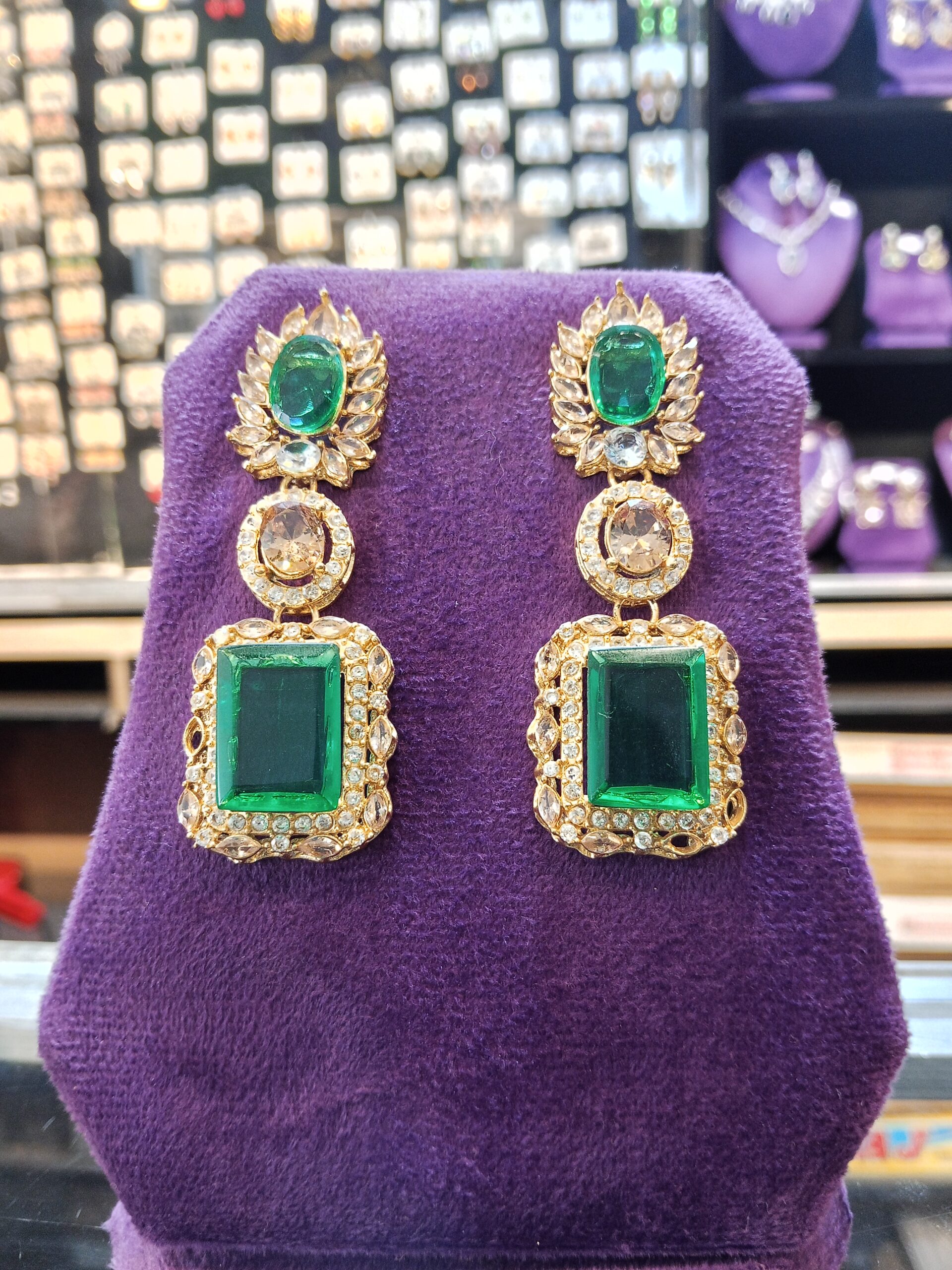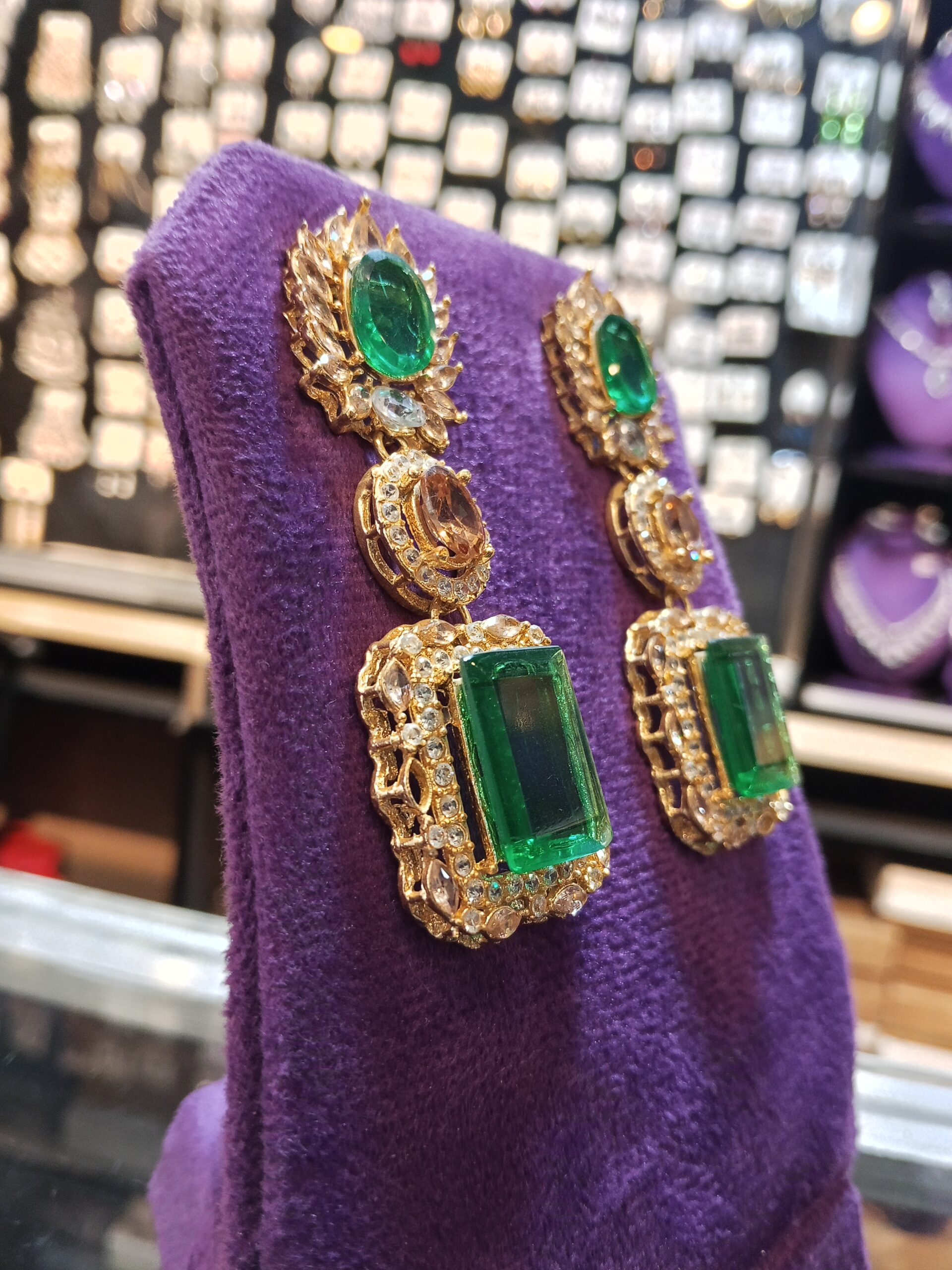 Make a glamorous entrance with these breathtaking statement drop earrings. The design features large, stunning Emerald-cut green stones paired with elegant oval and round champagne-hued stones, all meticulously set in a detailed antique gold-toned frame. The tiered, angular shape offers a modern yet regal look, combining the richness of traditional jewelry with a contemporary silhouette. These magnificent earrings are the perfect accessory to elevate any formal attire, whether it’s a wedding reception, a black-tie event, or a festive celebration.