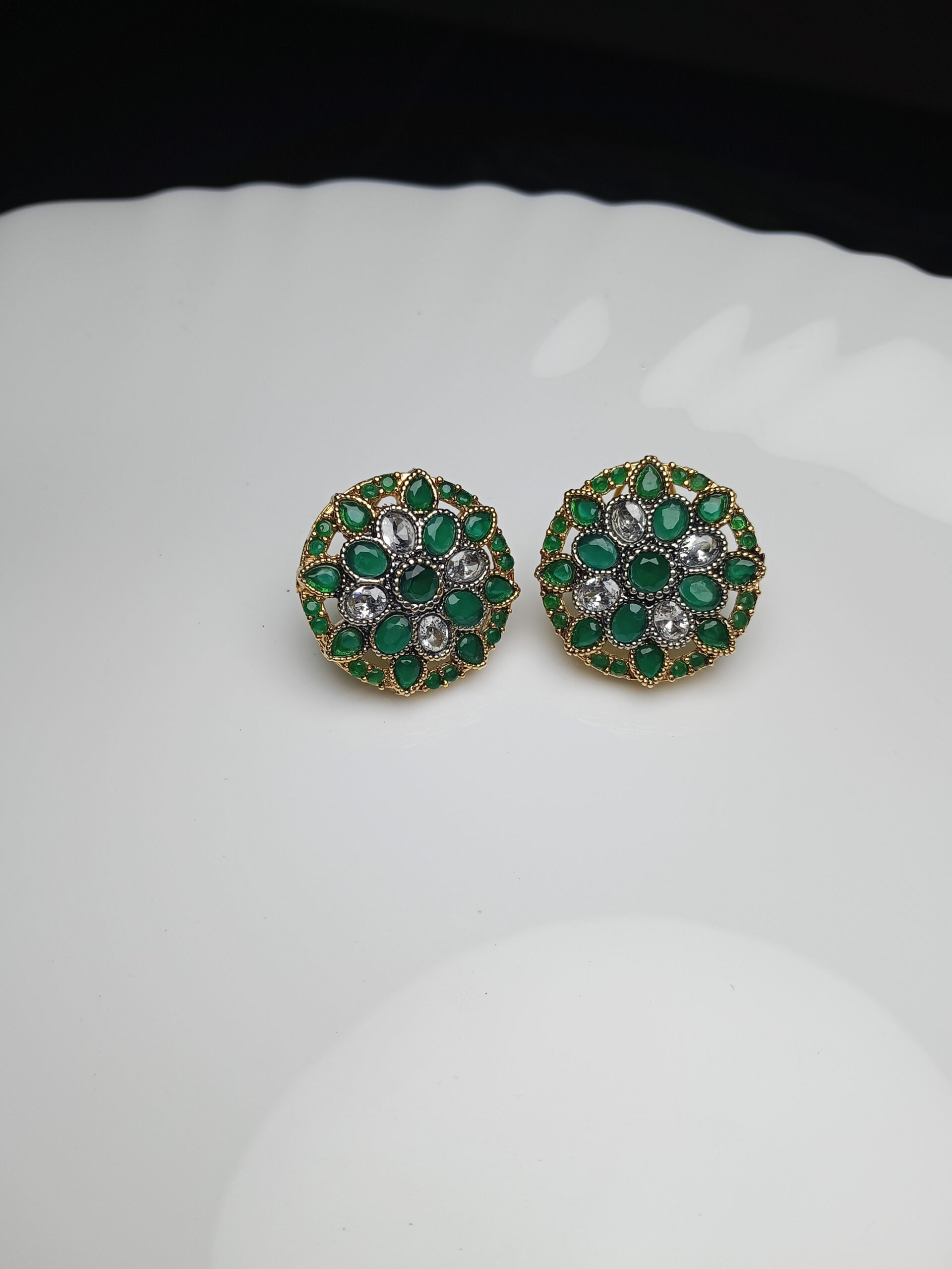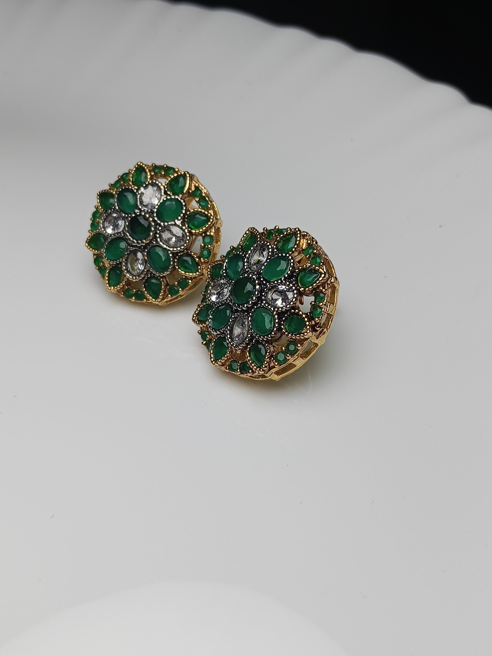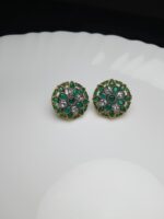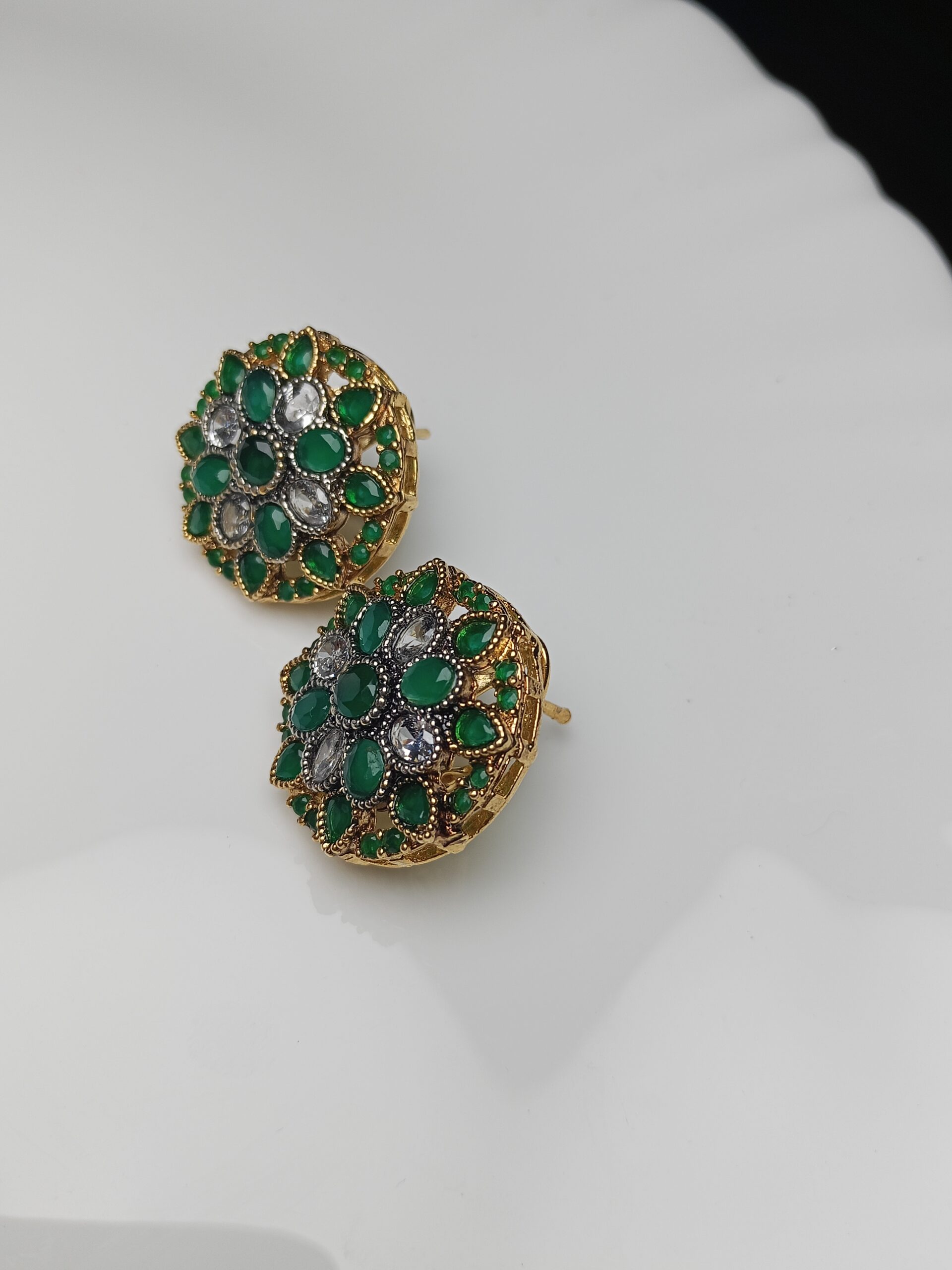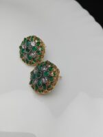 Add a vibrant pop of color and elegance with these exquisite floral stud earrings. Featuring a rich combination of deep emerald green and sparkling clear stones set in a detailed gold base, these studs are a perfect blend of traditional allure and wearable style. They are ideal for everyday luxury or dressing up a festive outfit.