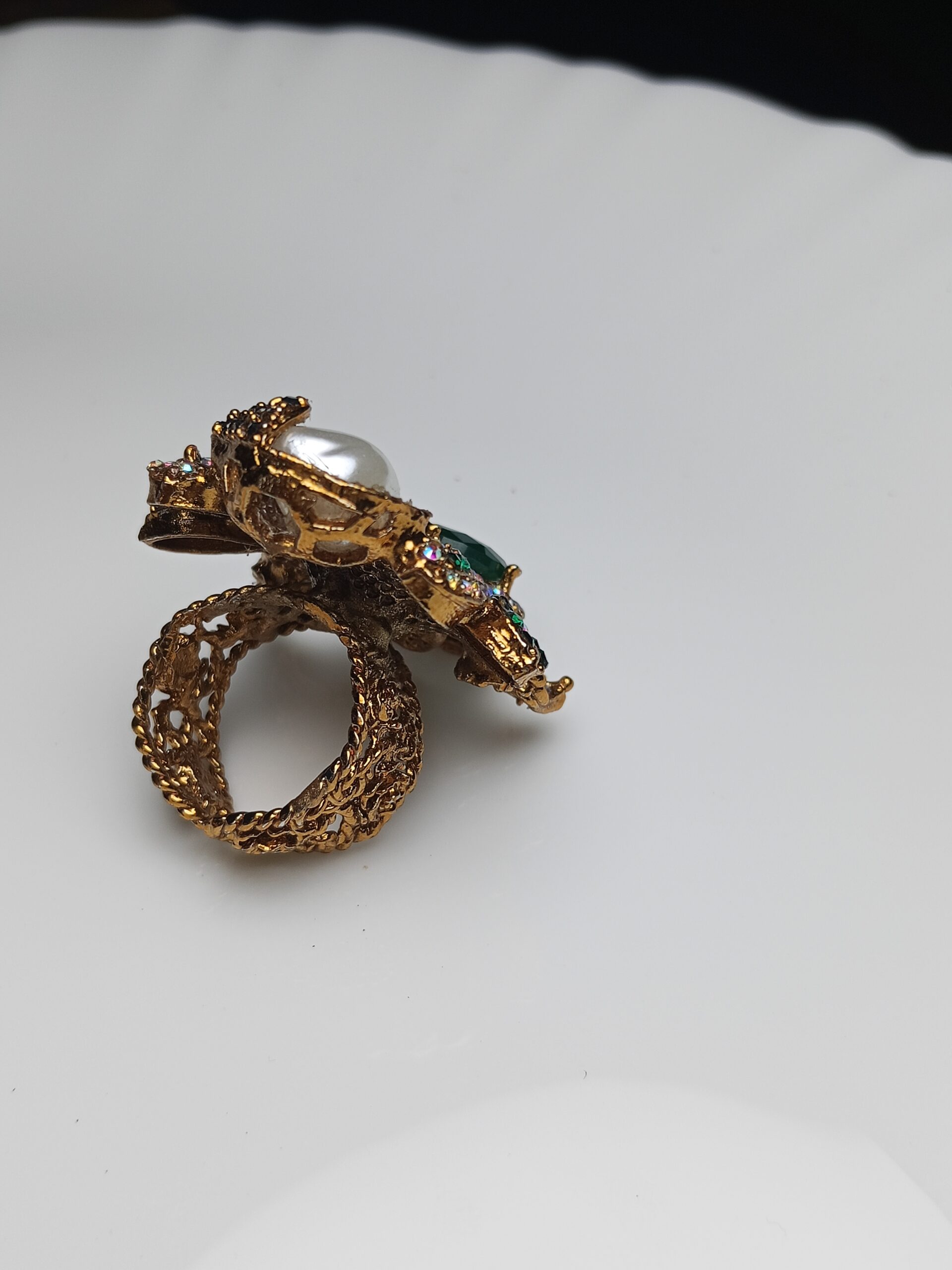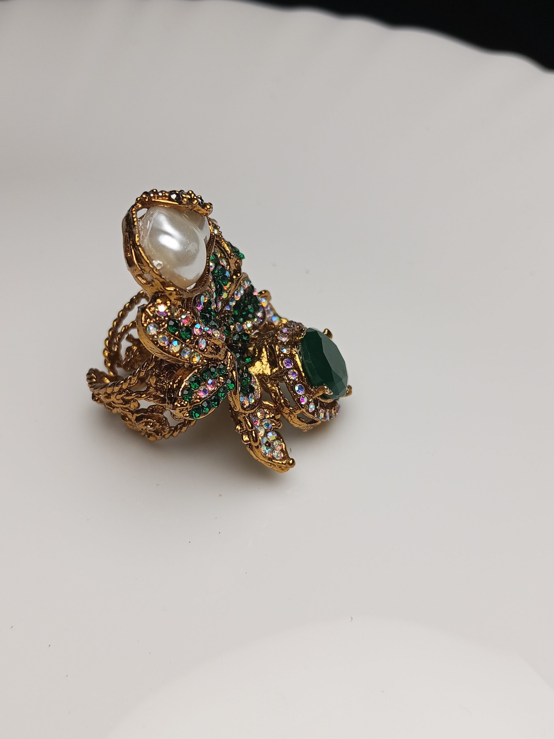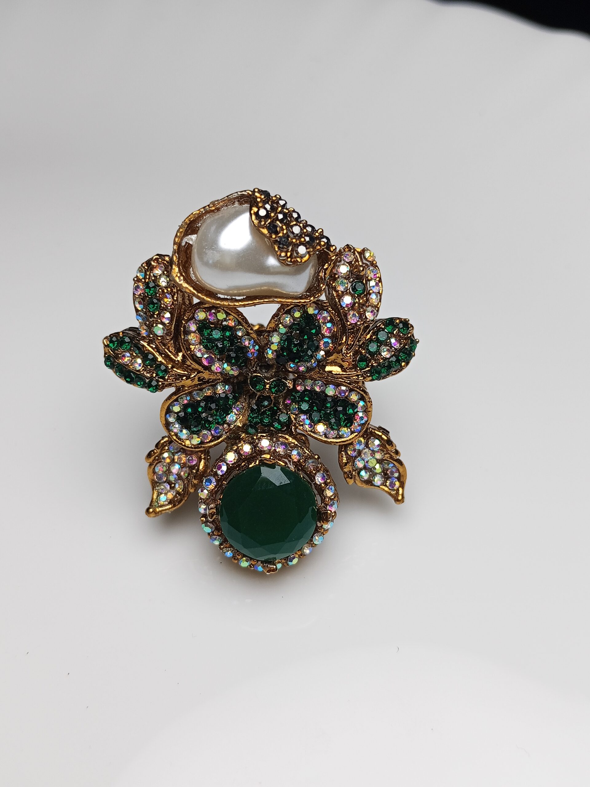 Make an unforgettable statement with this magnificent floral-inspired cocktail ring. This bold piece features a dramatic combination of deep emerald green stones and a lustrous baroque pearl, set in a rich gold-tone finish. It’s the perfect accessory to elevate any traditional outfit, from formal dinner wear to wedding ensembles.