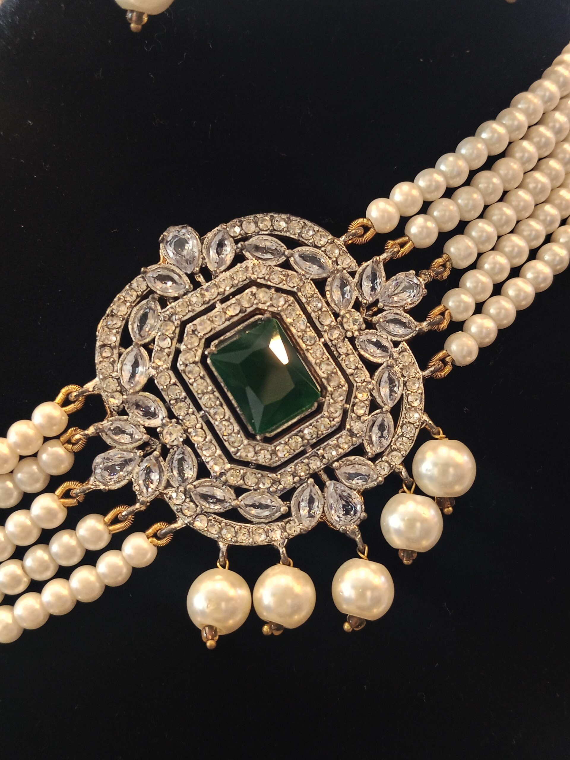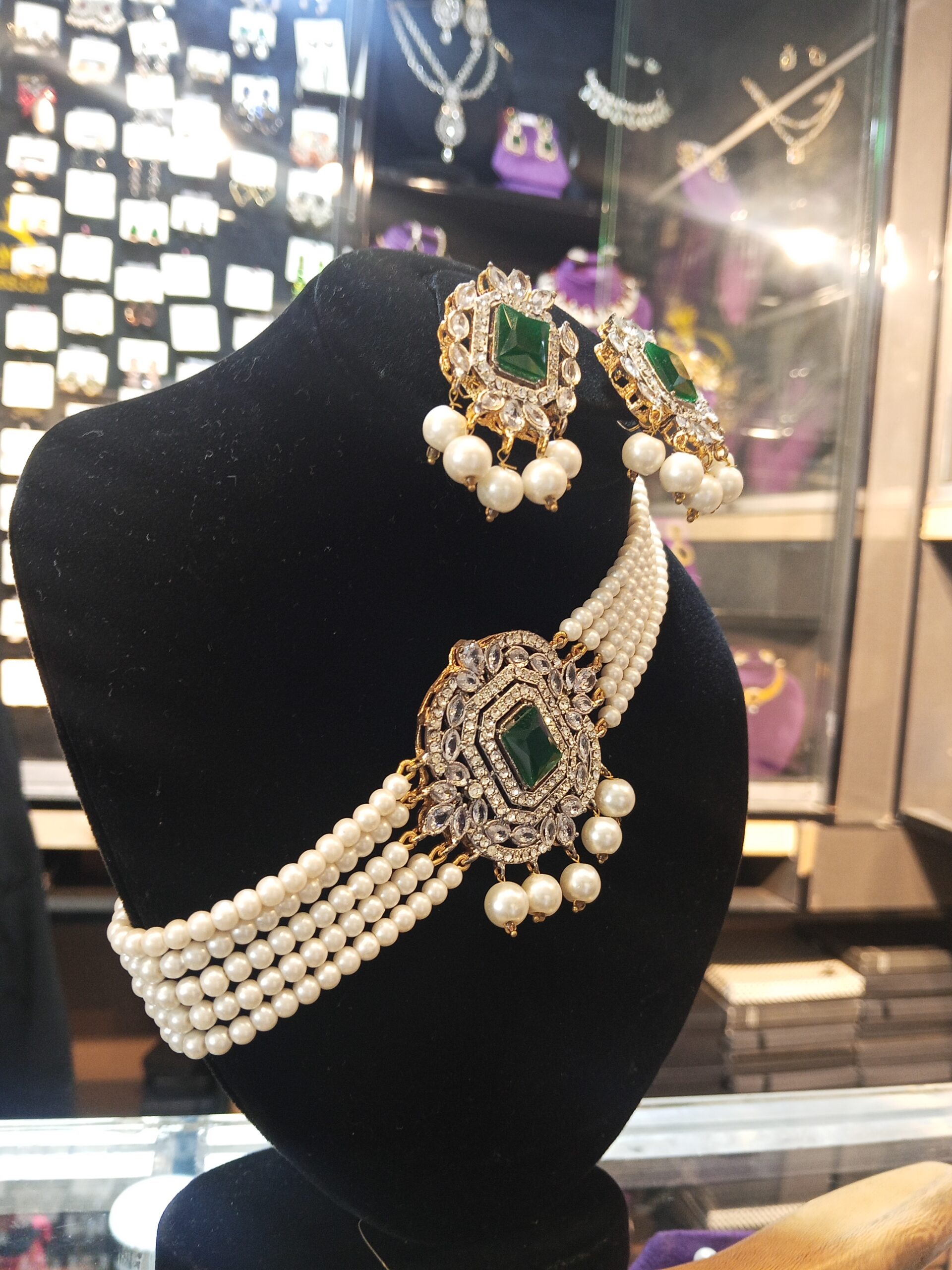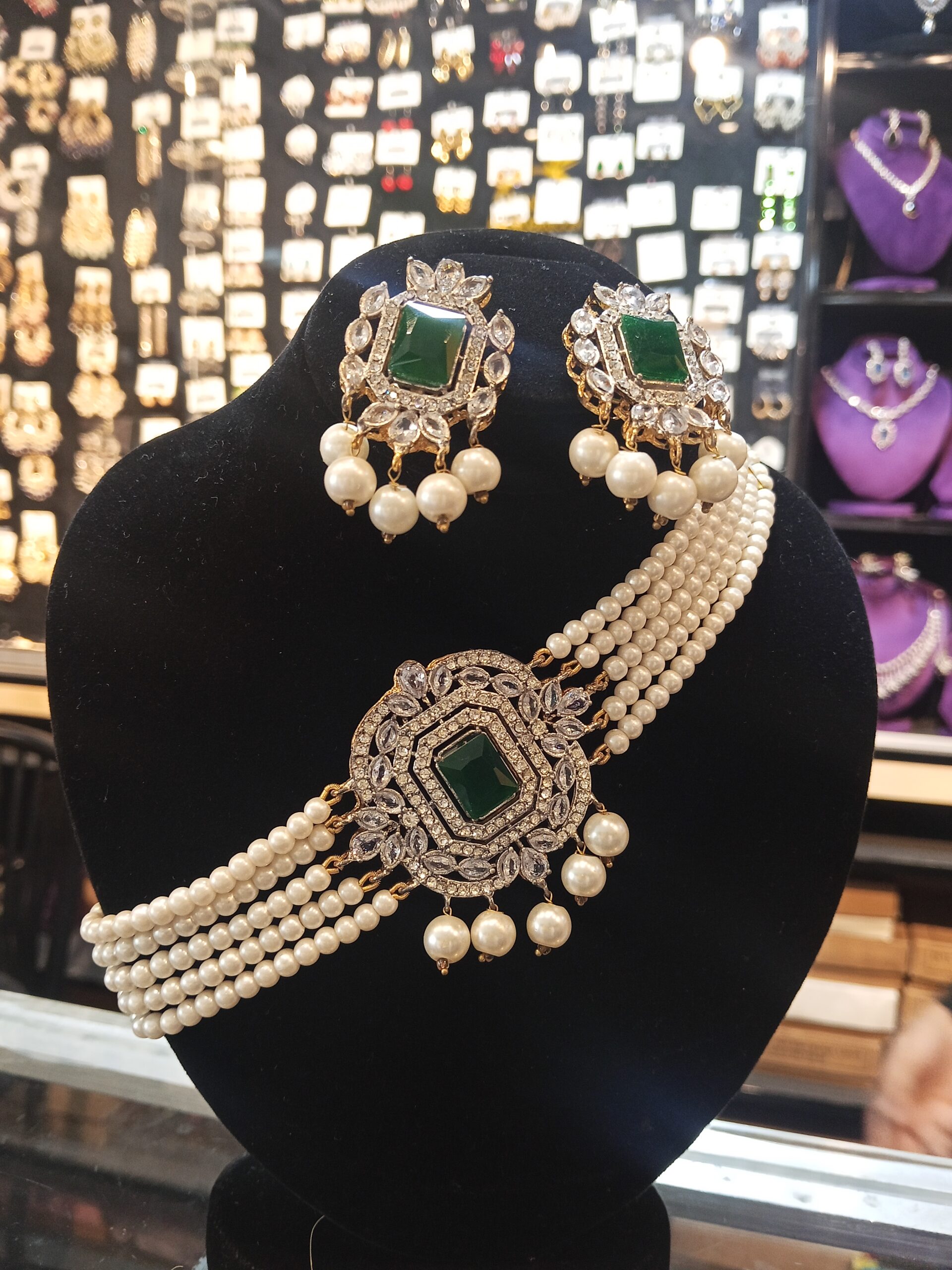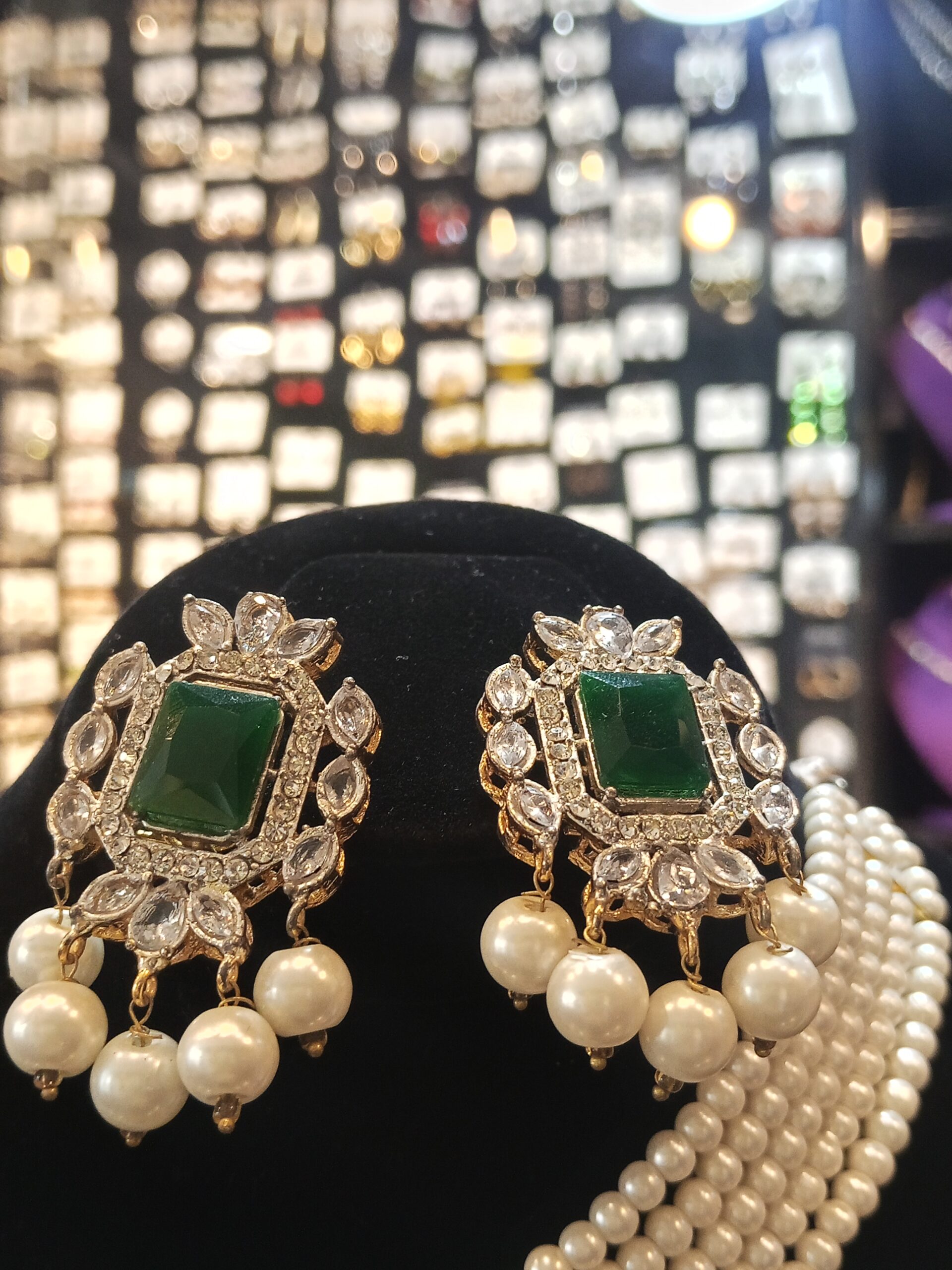 Step into timeless elegance with this magnificent Emerald Green and Pearl Choker Set. This exquisite ensemble features a multi-layered necklace of creamy white pearls that culminates in a stunning centerpiece. The focal point is a rich Emerald Green square-cut gemstone, intricately framed by brilliant clear stones in a dazzling Kundan/Polki inspired pattern. The matching drop earrings perfectly complement the choker with the same central stone and delicate pearl drops. This set is the epitome of sophistication, making it the perfect accessory for a bride, a wedding guest, or any grand festive celebration.