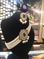 Emerald Green Stone Choker Necklace & Pearl Drop Earring Set – Kundan Style Bridal Jewelry