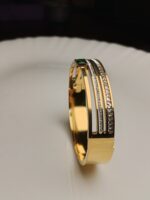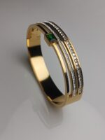 Adorn your wrist with the sophisticated shine of our Gold Plated Emerald Accent Bangle. This elegant piece combines timeless design with a vibrant touch of color. The bracelet features a gleaming 24K gold-plated finish on a durable stainless steel base.