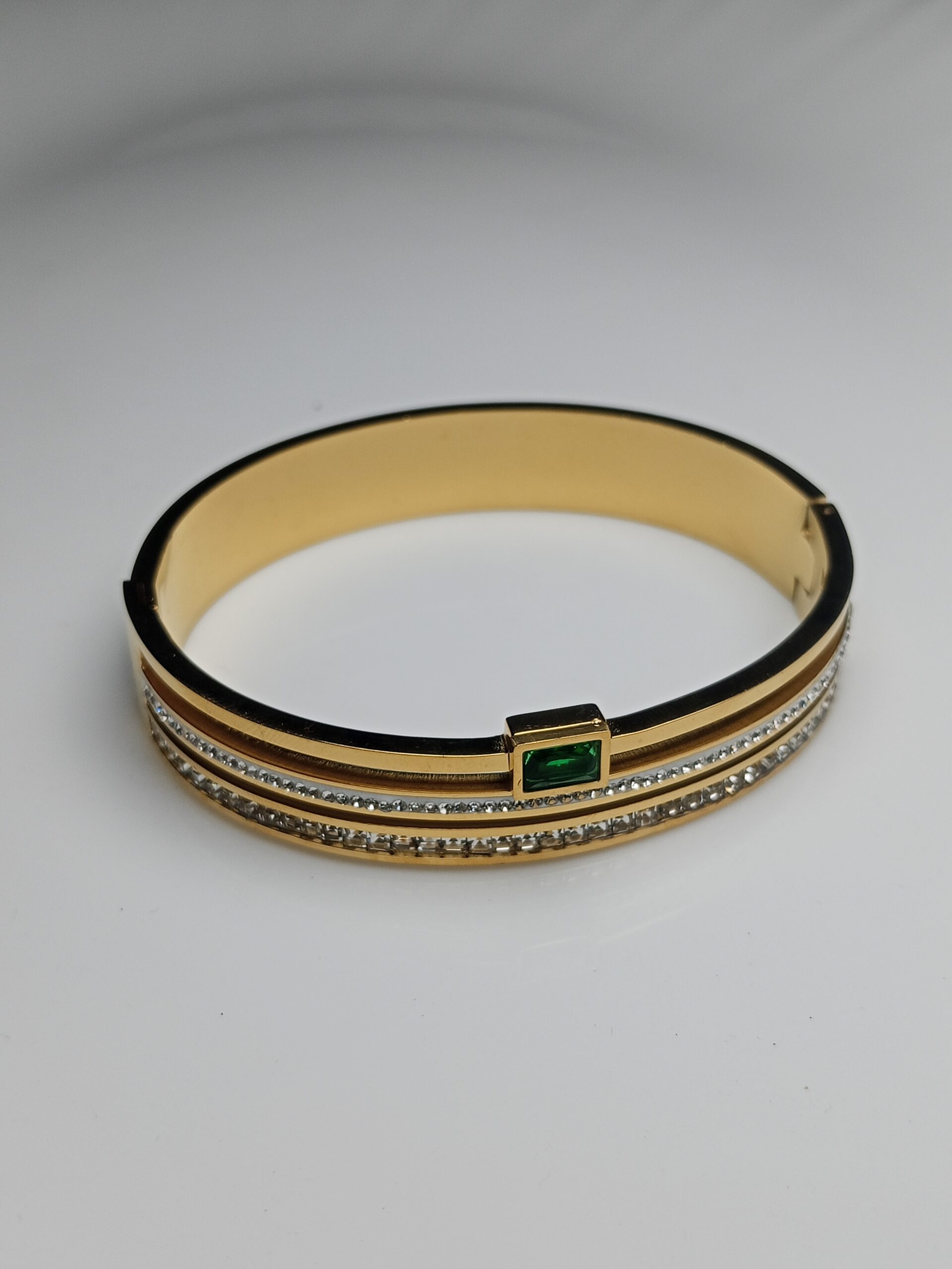 Gold Plated Double Row Crystal Bangle with Emerald-Cut Green Accent Stone | Minimalist Jewelry