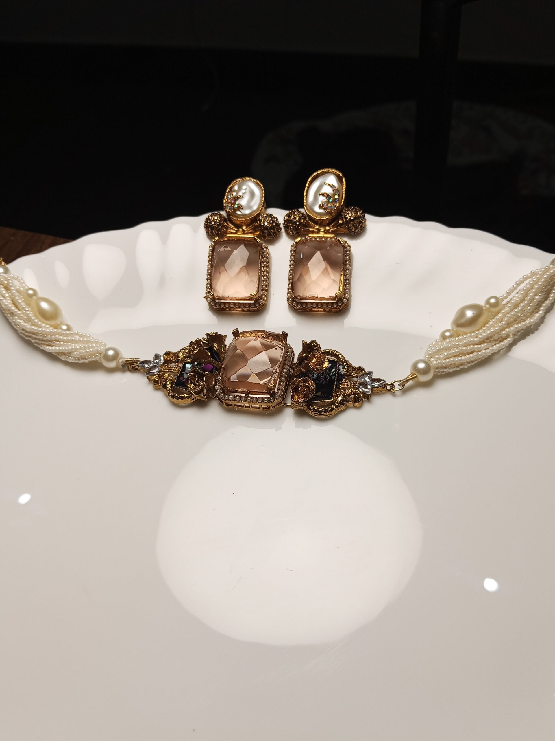 Gold & White Pearl Choker Set with Blush Pink Polki Style Stone