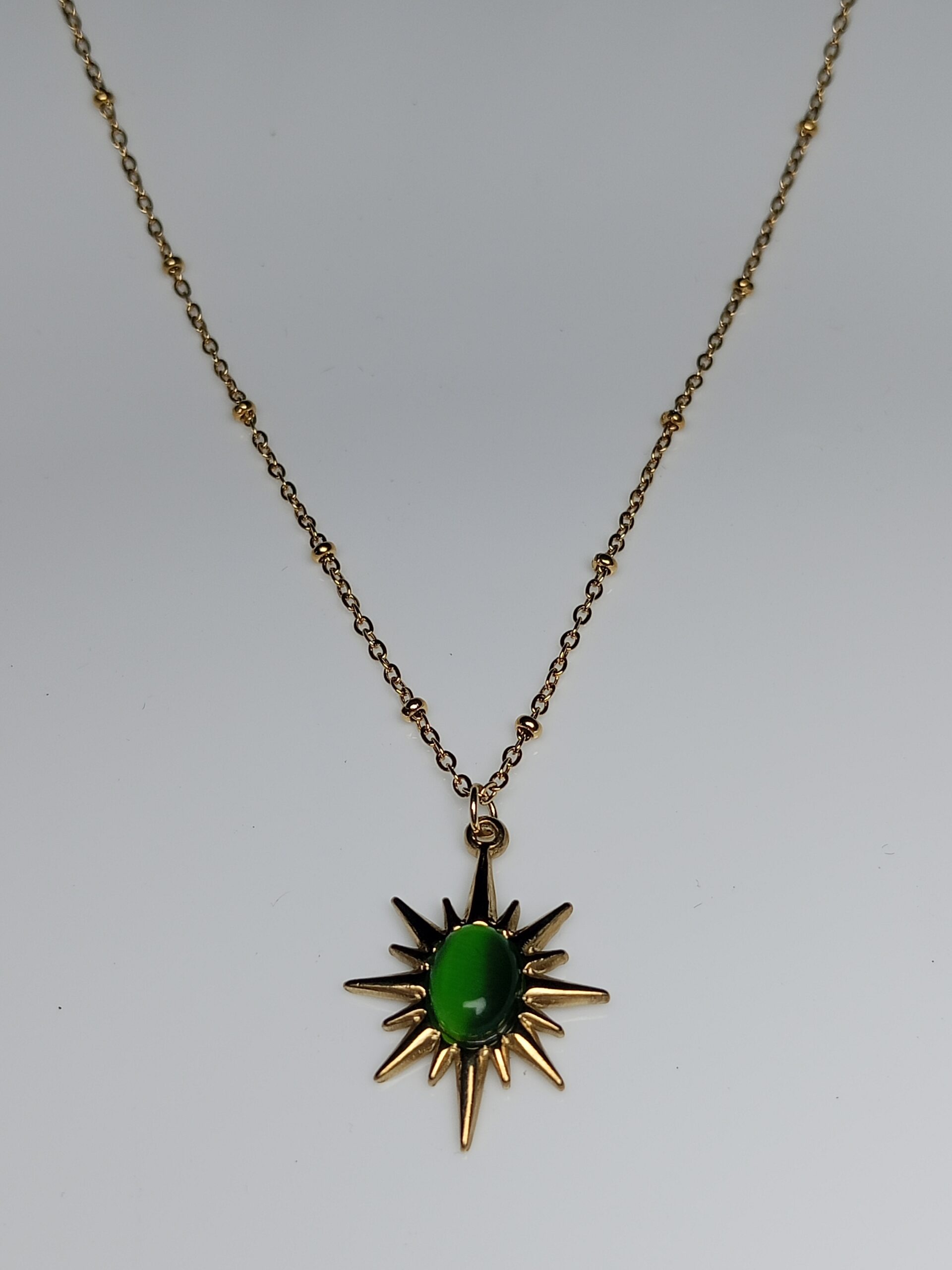 Add a touch of contemporary celestial charm to your look with this chic pendant necklace. It features a glossy green cabochon stone set within a sharp starburst design, suspended from a delicate gold-tone chain. This piece is perfect for everyday wear and layering, offering a subtle pop of color and trend-forward style.
