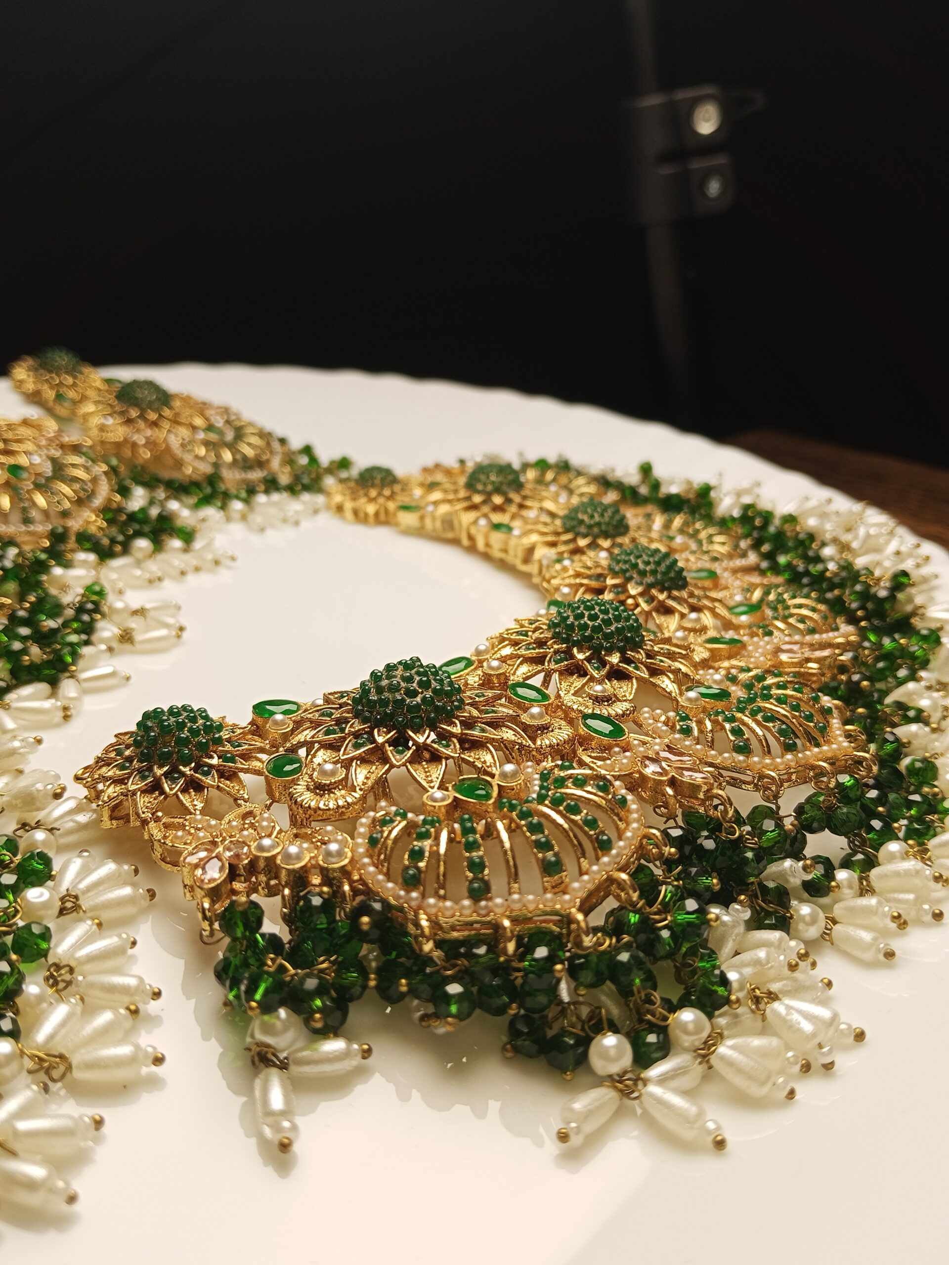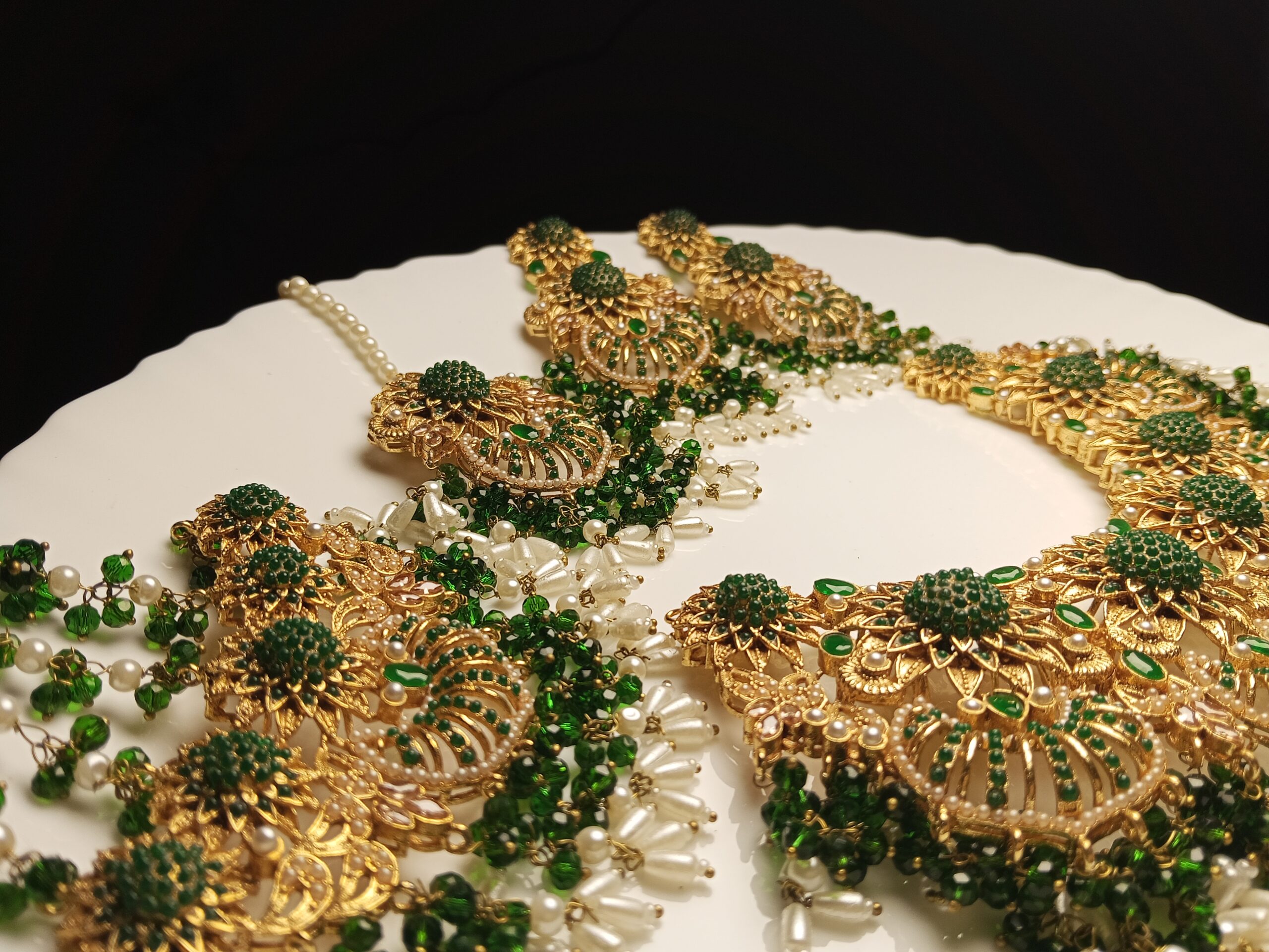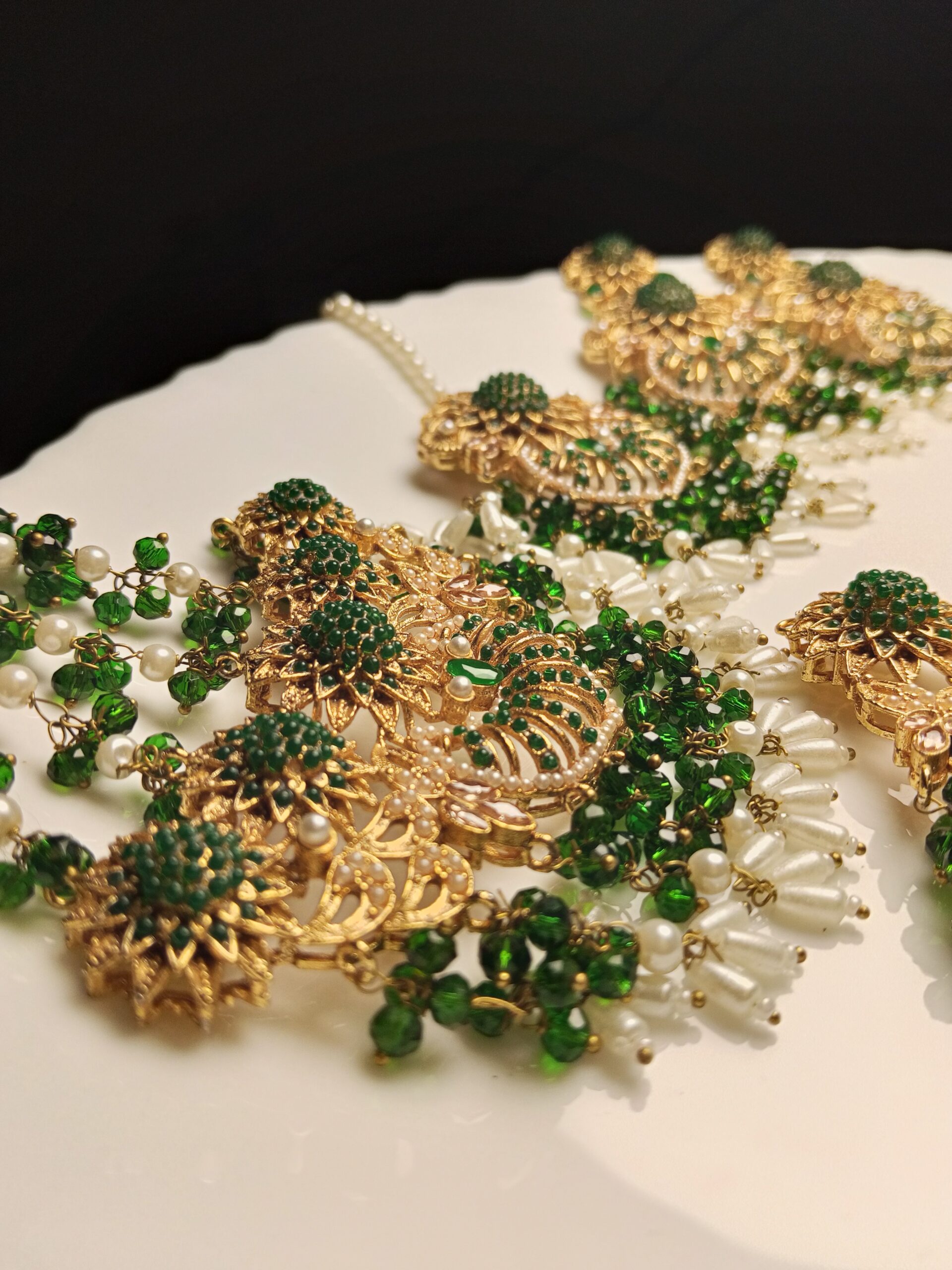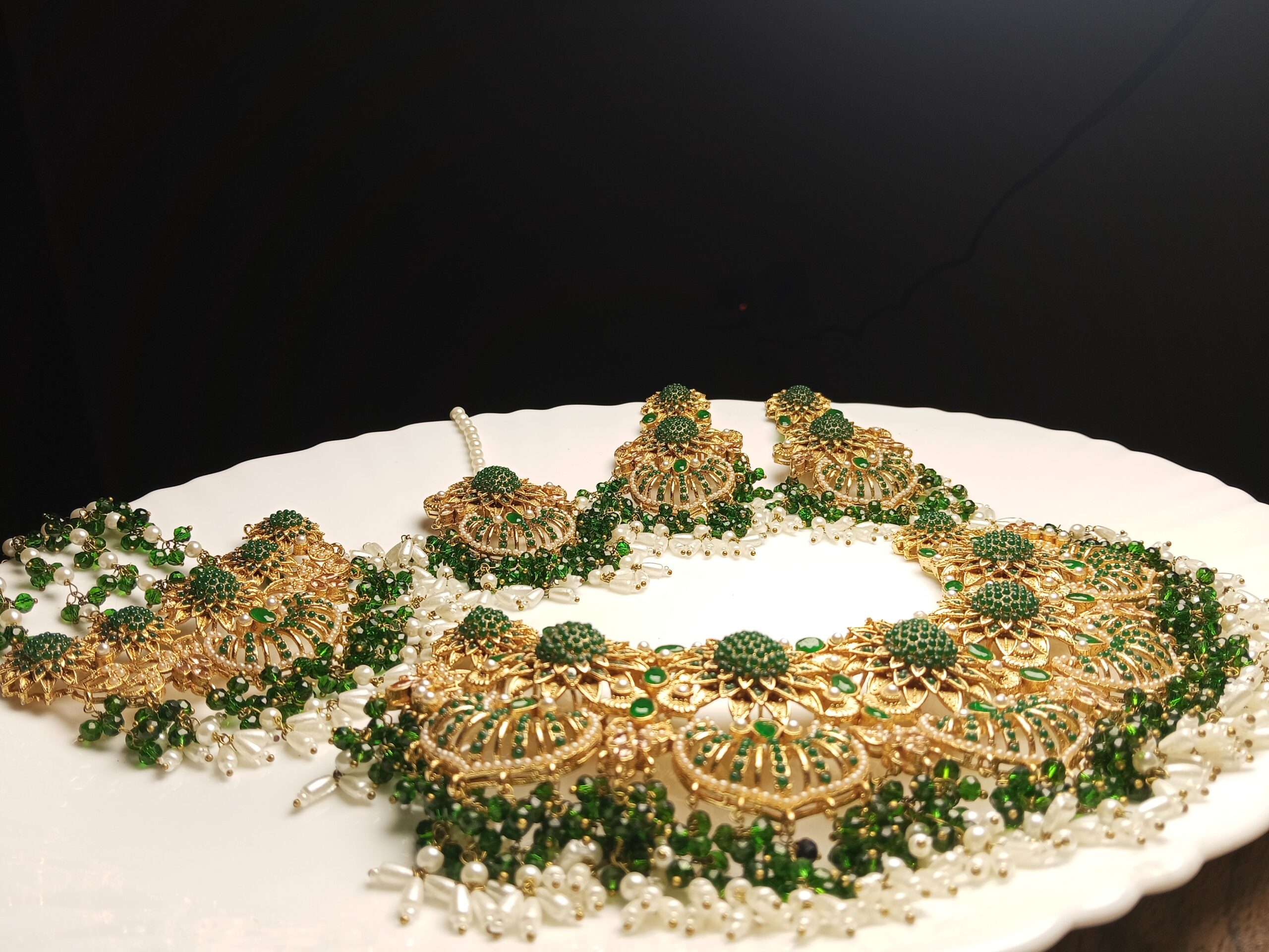 Step into timeless beauty with this opulent heavy-set jewelry ensemble, radiating traditional glamour. This set features a magnificent choker designed with intricate gold filigree work and rich dark green Meenakari (enamel) detailing, inspired by historical royal designs. Cascading white and green beads provide dramatic movement and volume, making it an undeniable focal point for a major bridal event like the Nikkah, Baraat, or Valima.