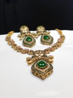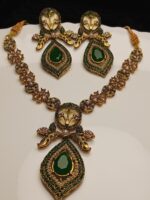 Elevate your look with this complete, exquisite necklace and earring set, featuring a harmonious blend of traditional artistry and vibrant color. The striking emerald green stones and intricate gold work make this set a centerpiece accessory for any grand event or celebration.