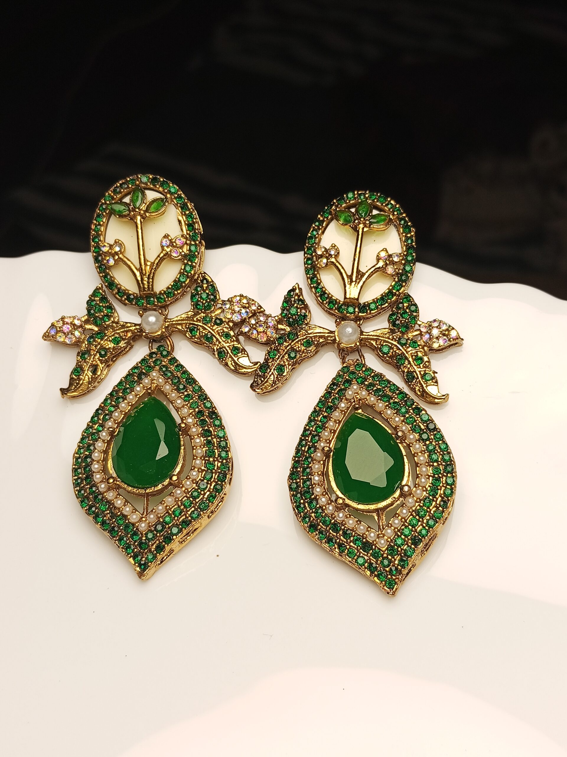 - Pendant: The large central pendant showcases a bold, faceted Emerald Green teardrop stone surrounded by pave-set green rhinestones and small seed pearls.
