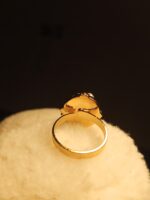 Adding a touch of nature-inspired beauty, a small cluster of gold-toned leaves, accented with vibrant green and a subtle sparkle, nestles charmingly on the side. The ring is finished with a polished, comfortable gold-toned band. It’s a truly unique statement piece that blends classic luxury with playful charm.