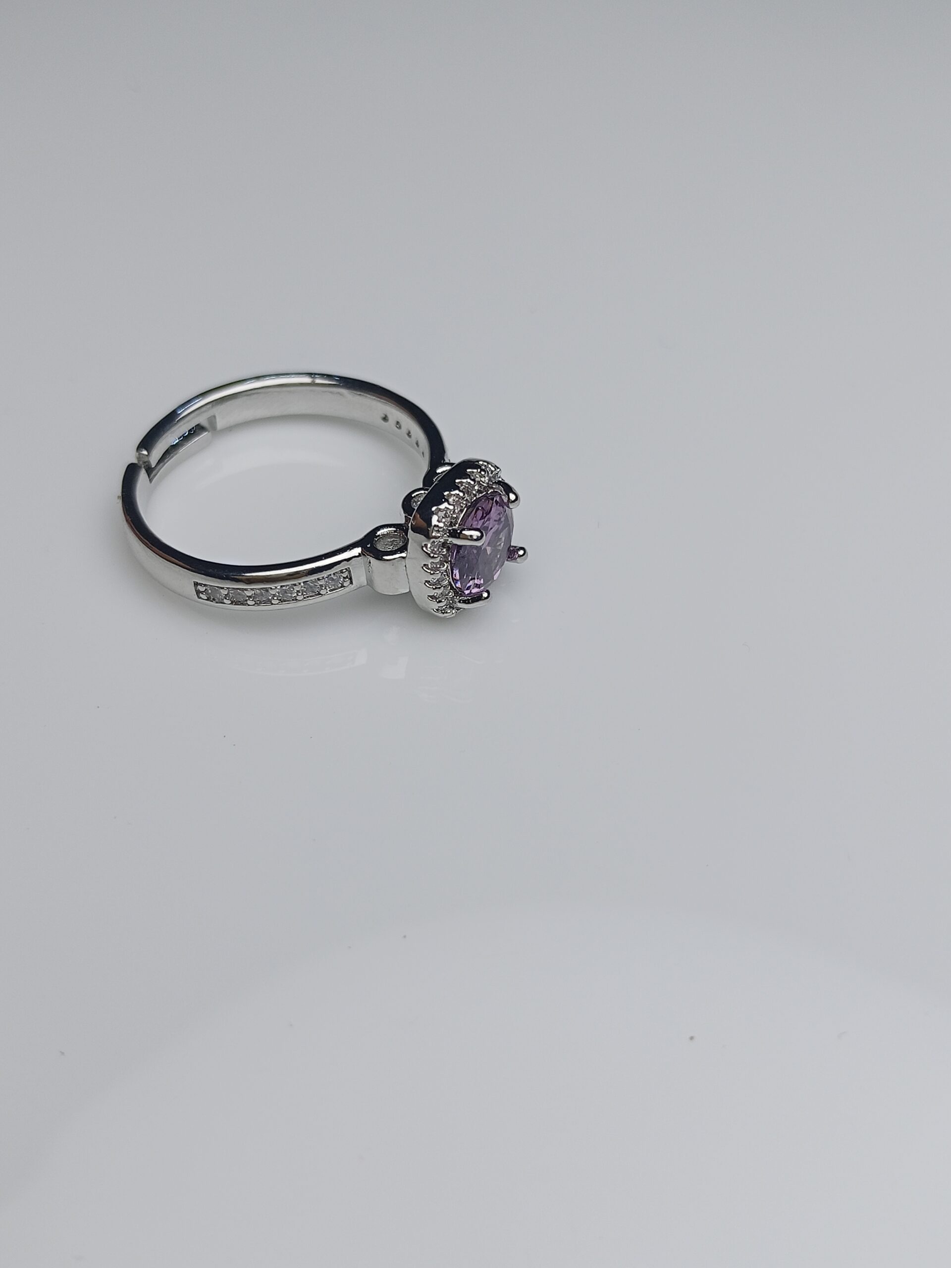Lavender Amethyst Halo Adjustable Silver Ring - Elegant Zircon Band