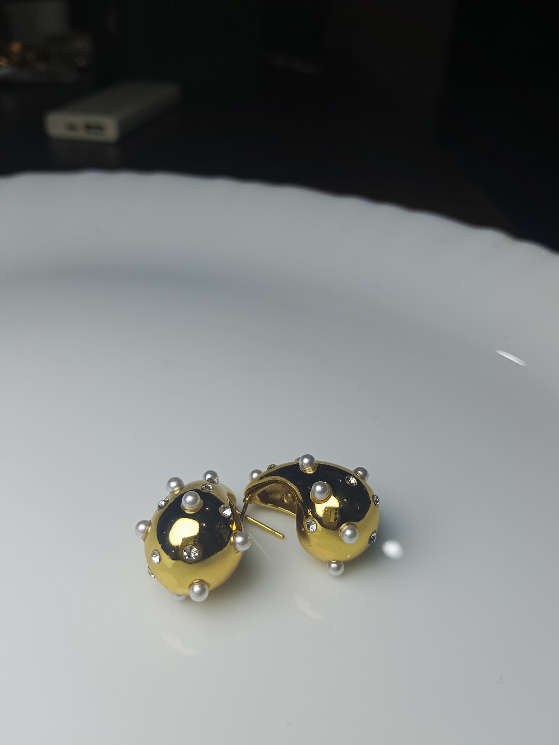 Step into the spotlight with our Lustrous Gold Dome & Pearl Drop Stud Earrings. These striking pieces perfectly blend contemporary design with classic elegance, making them the ultimate statement accessory for any occasion. Featuring a high-polish, rich gold finish in a modern dome or teardrop shape, they are beautifully adorned with small, delicate faux pearls and sparkling crystal accents. They offer a bold look while remaining comfortable and lightweight enough for all-day wear. Perfect for dressing up a simple outfit or adding a final touch of glamour to your evening wear.