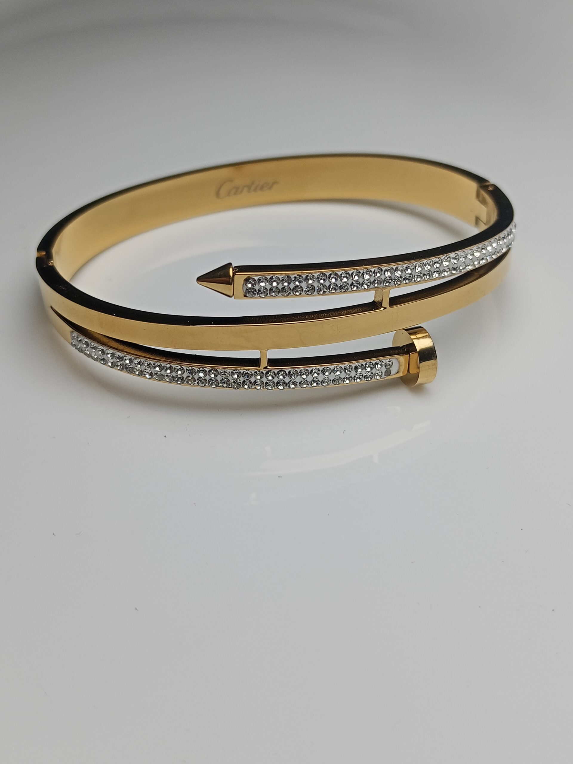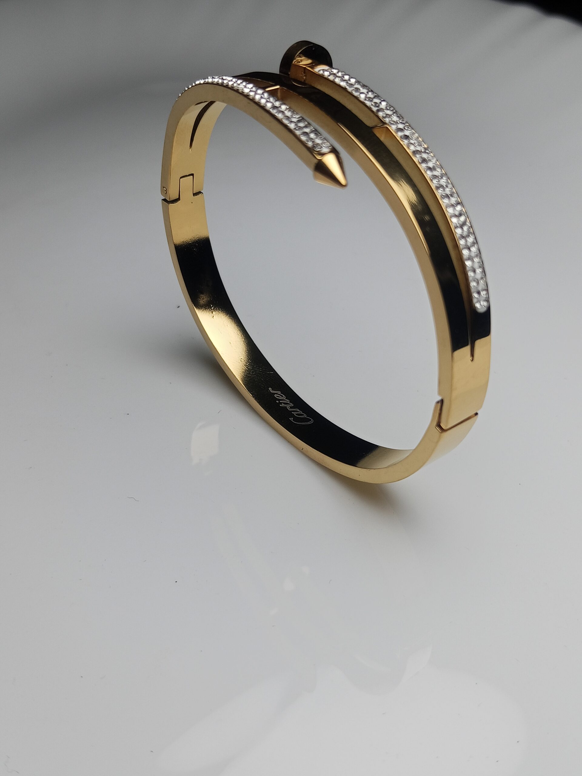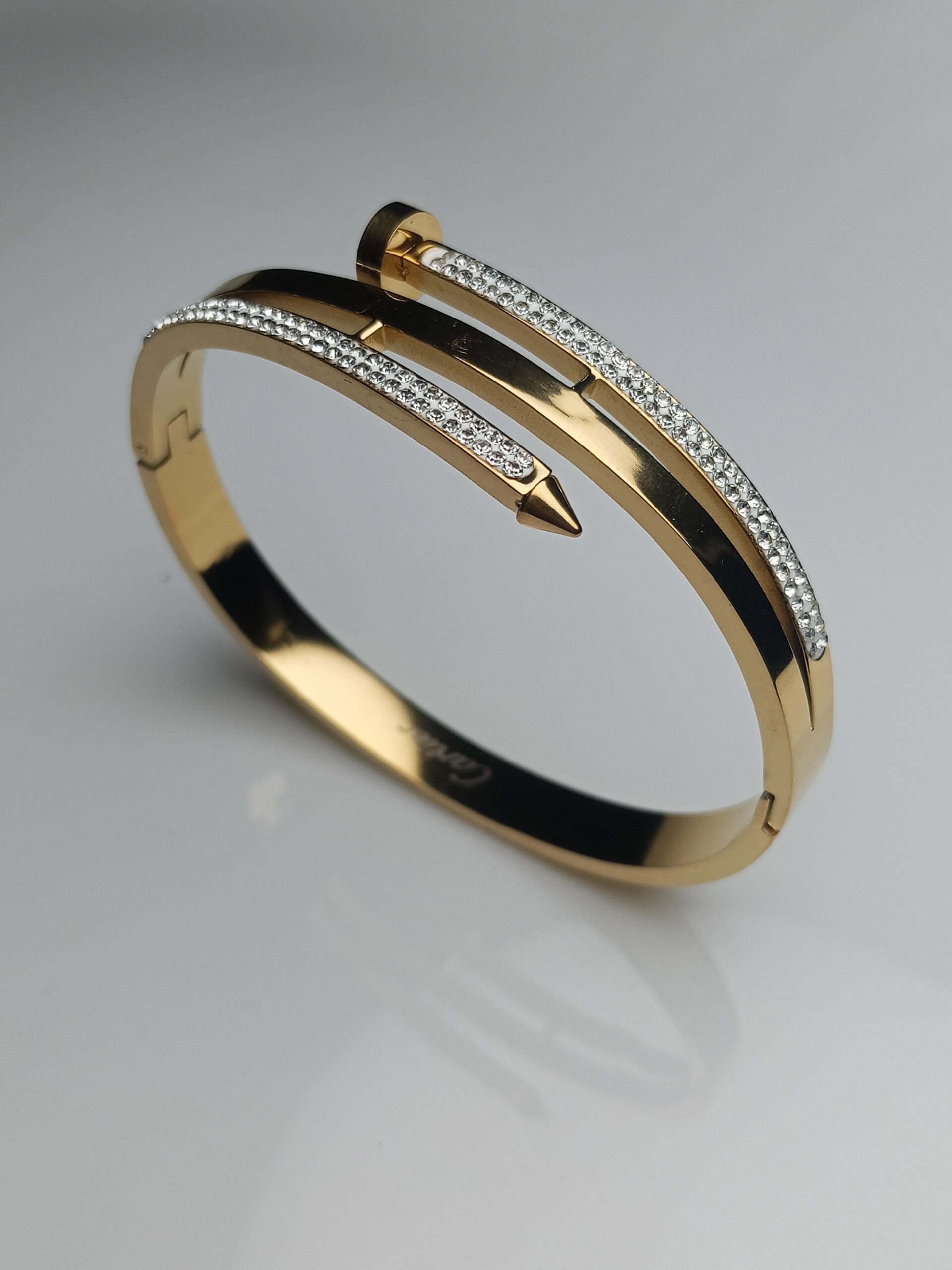 Both sides of the “nail” are meticulously lined with dazzling pave-set crystals, ensuring maximum brilliance and catching the light from every angle. Crafted from premium, durable stainless steel, this hinged bracelet offers a comfortable and secure fit, making it the perfect piece to showcase individuality and sophistication.