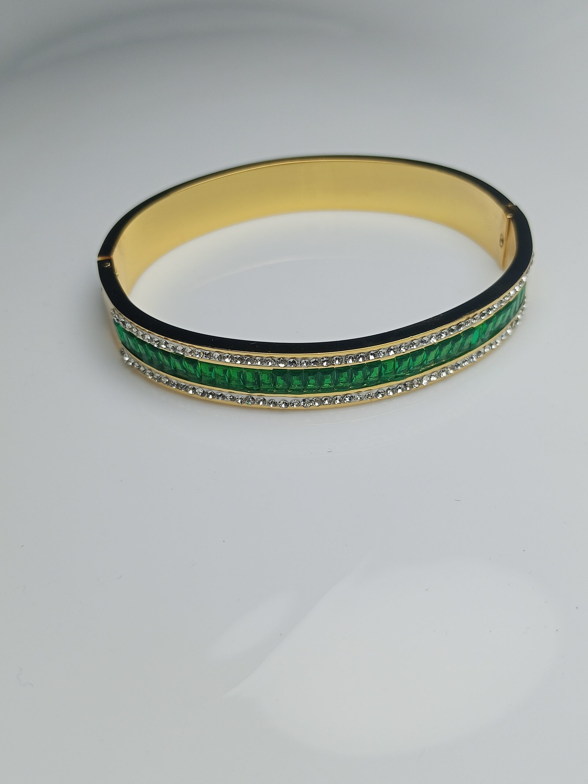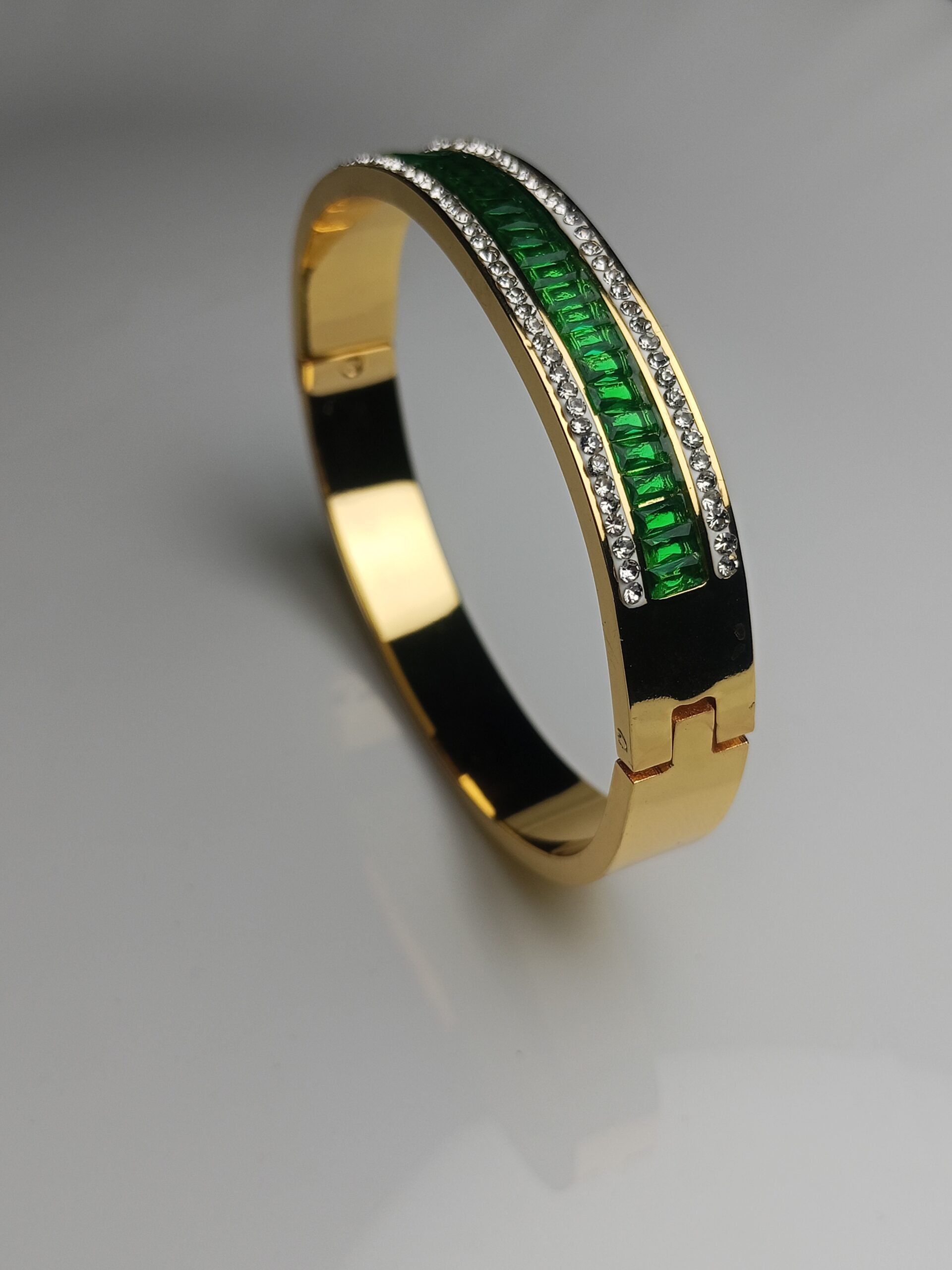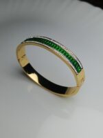 Luxury Gold Plated Bangle with Emerald Green Baguette Stones and Crystal Pavé