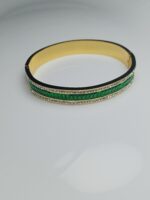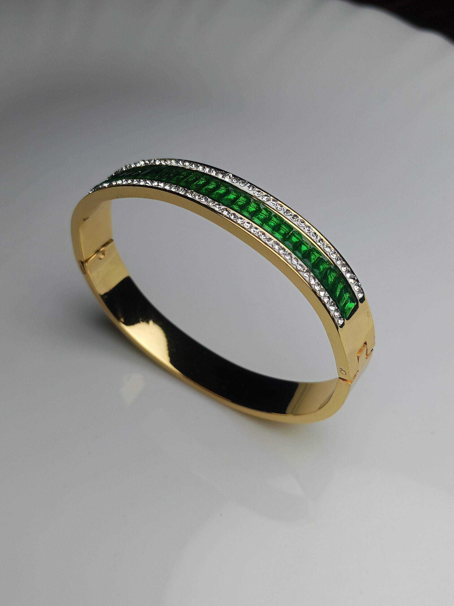 Add a touch of contemporary luxury to your wrist with this sophisticated bangle bracelet. This piece features a central row of vibrant Emerald green baguette-cut stones, perfectly aligned to create a seamless line of color. This stunning green is framed on both sides by dazzling rows of pavé-set clear crystals, all set in a sleek, highly polished gold-toned metal. With its secure clasp closure, this bangle is easy to wear and perfect for stacking or wearing as a single, elegant statement piece. It beautifully bridges traditional formal wear and modern Western elegance.
