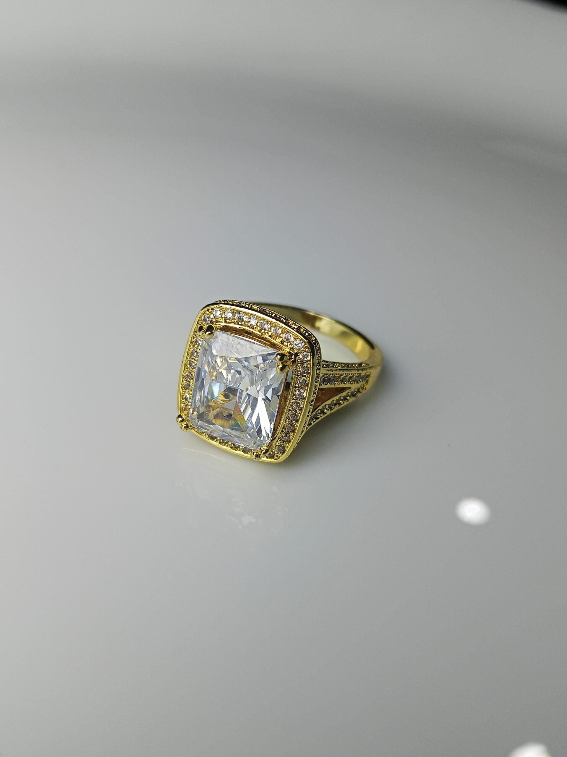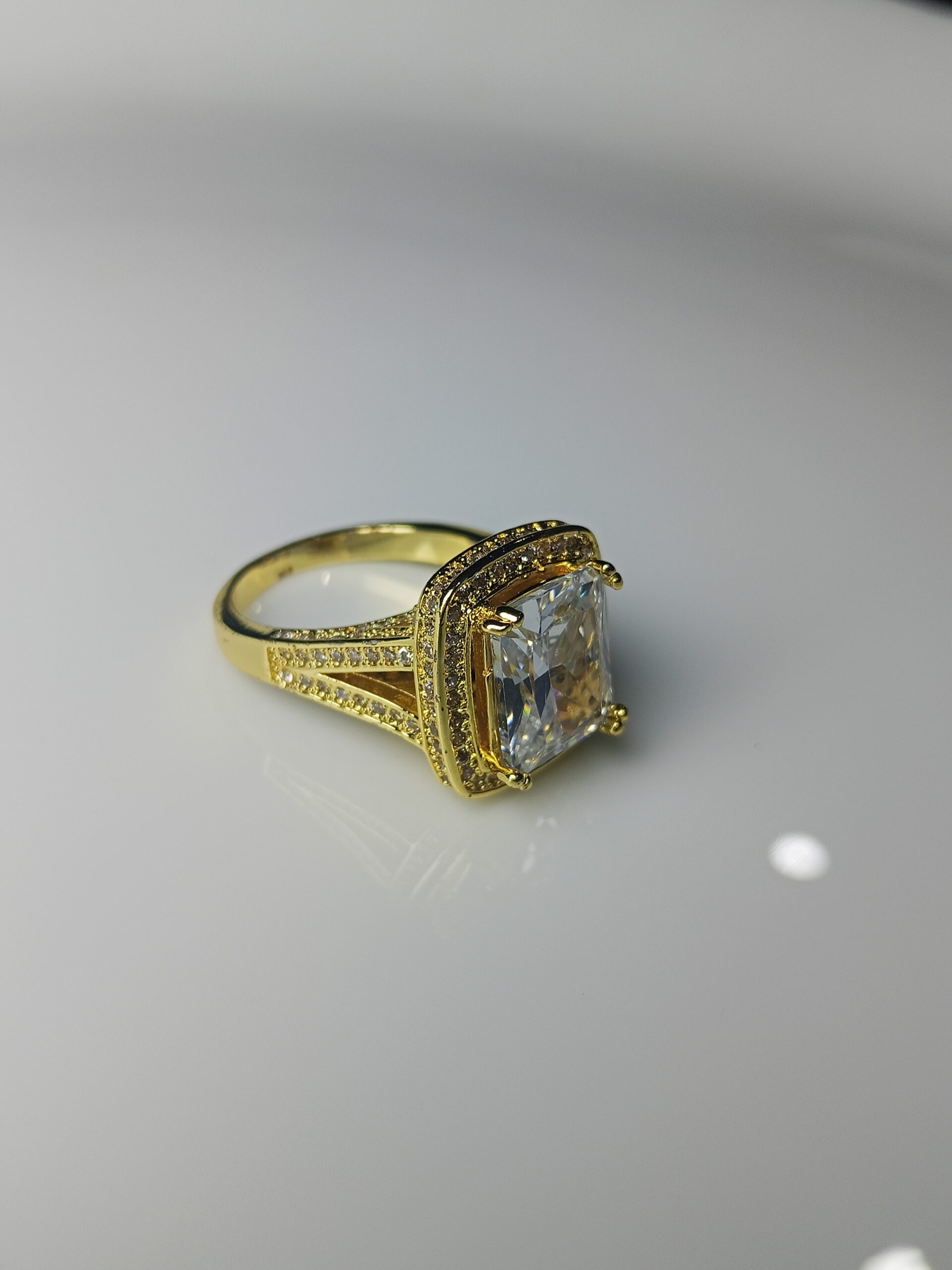 Make a dazzling statement with this luxurious Radiant Cut Halo Ring. This magnificent piece features a spectacular, large cubic zirconia (CZ) stone with the trendy, rectangular Radiant cut, known for its brilliant faceting and incredible sparkle.