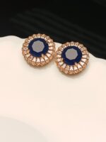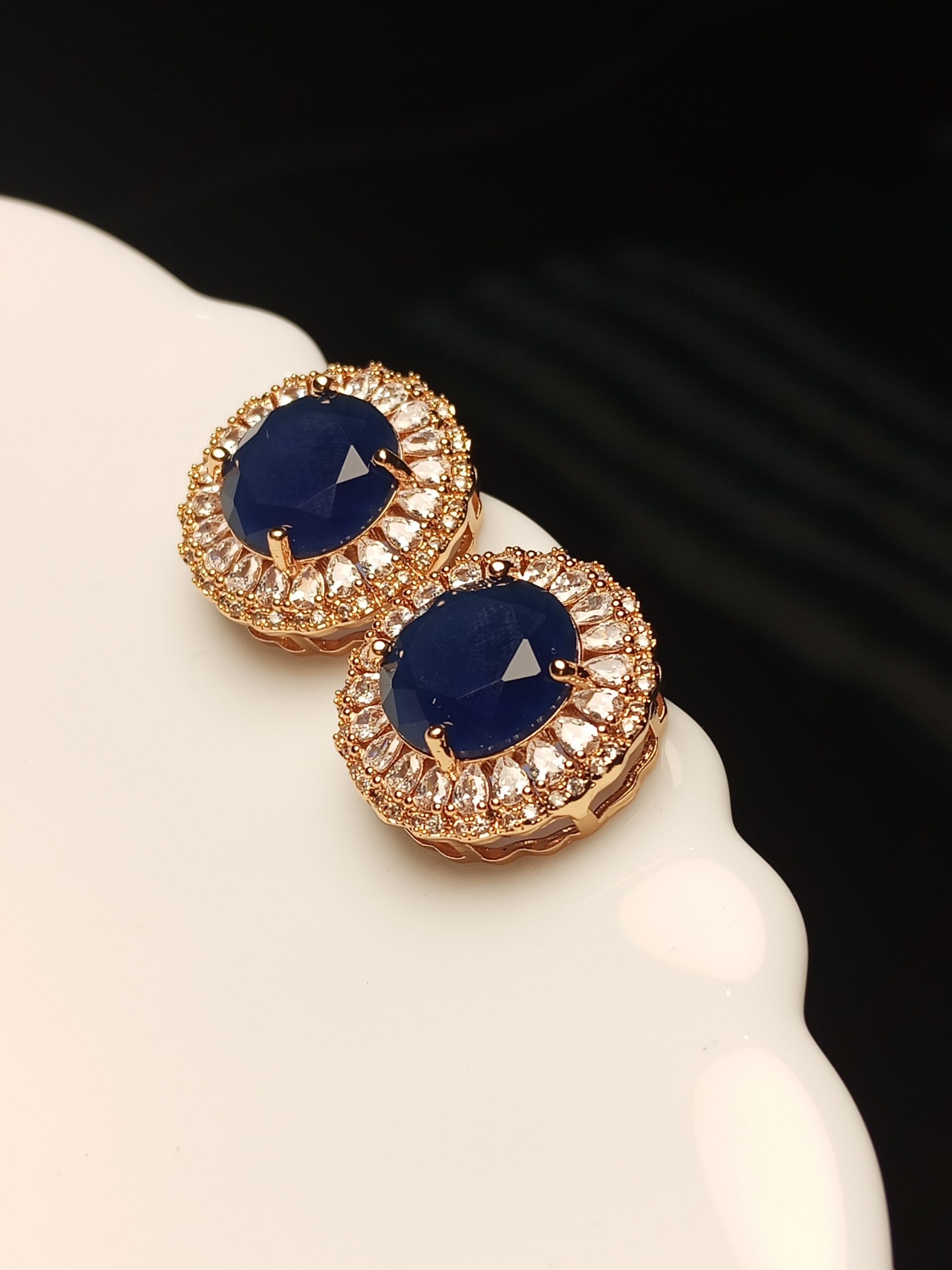 Exude majestic elegance with these stunning Deep Blue & Gold Oval Halo Stud Earrings. Each earring features a prominent oval-cut Royal Blue Sapphire (or Blue Zircon) center stone, radiating rich color and depth. The central stone is surrounded by a brilliant, multi-stone halo of white zircons, all set in a warm, luxurious Gold-Tone Finish. These studs are perfect for adding a touch of classic, opulent color to bridal ensembles, formal attire, or any grand occasion.