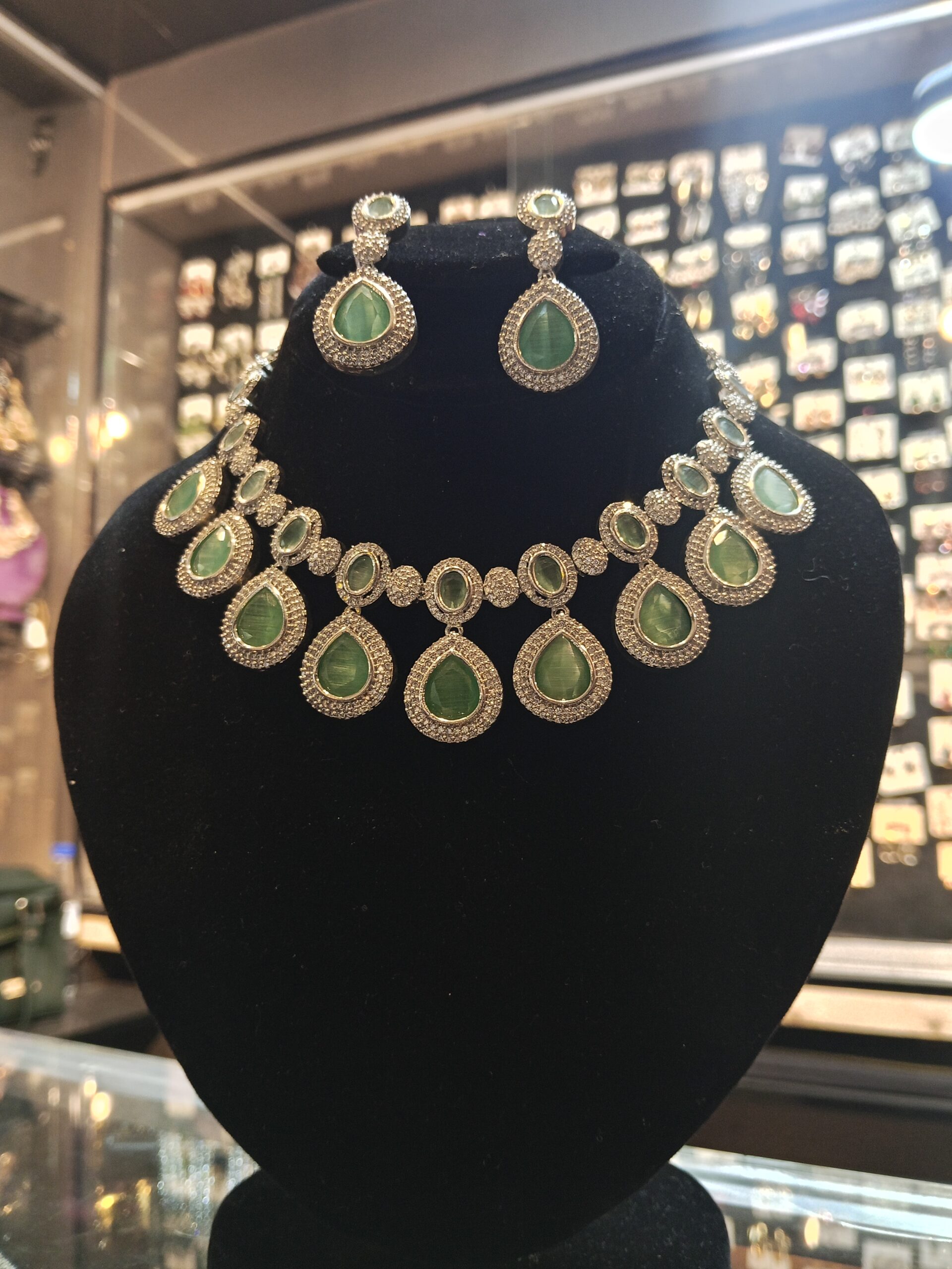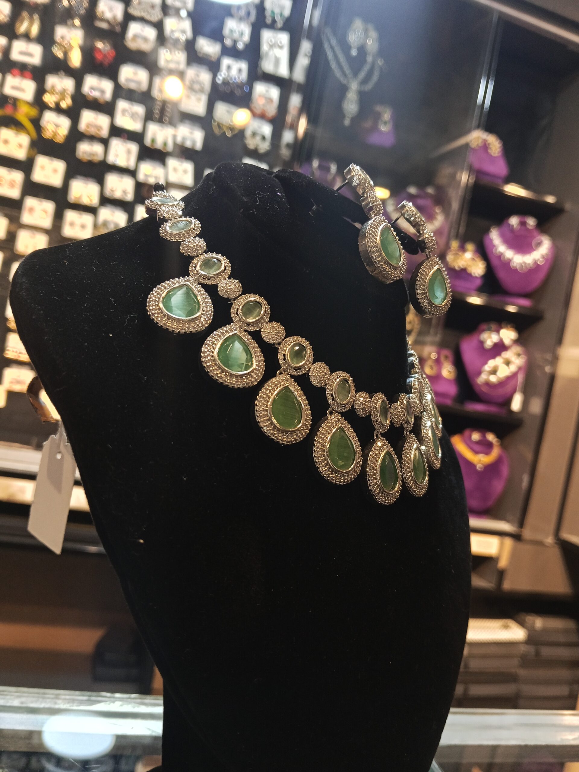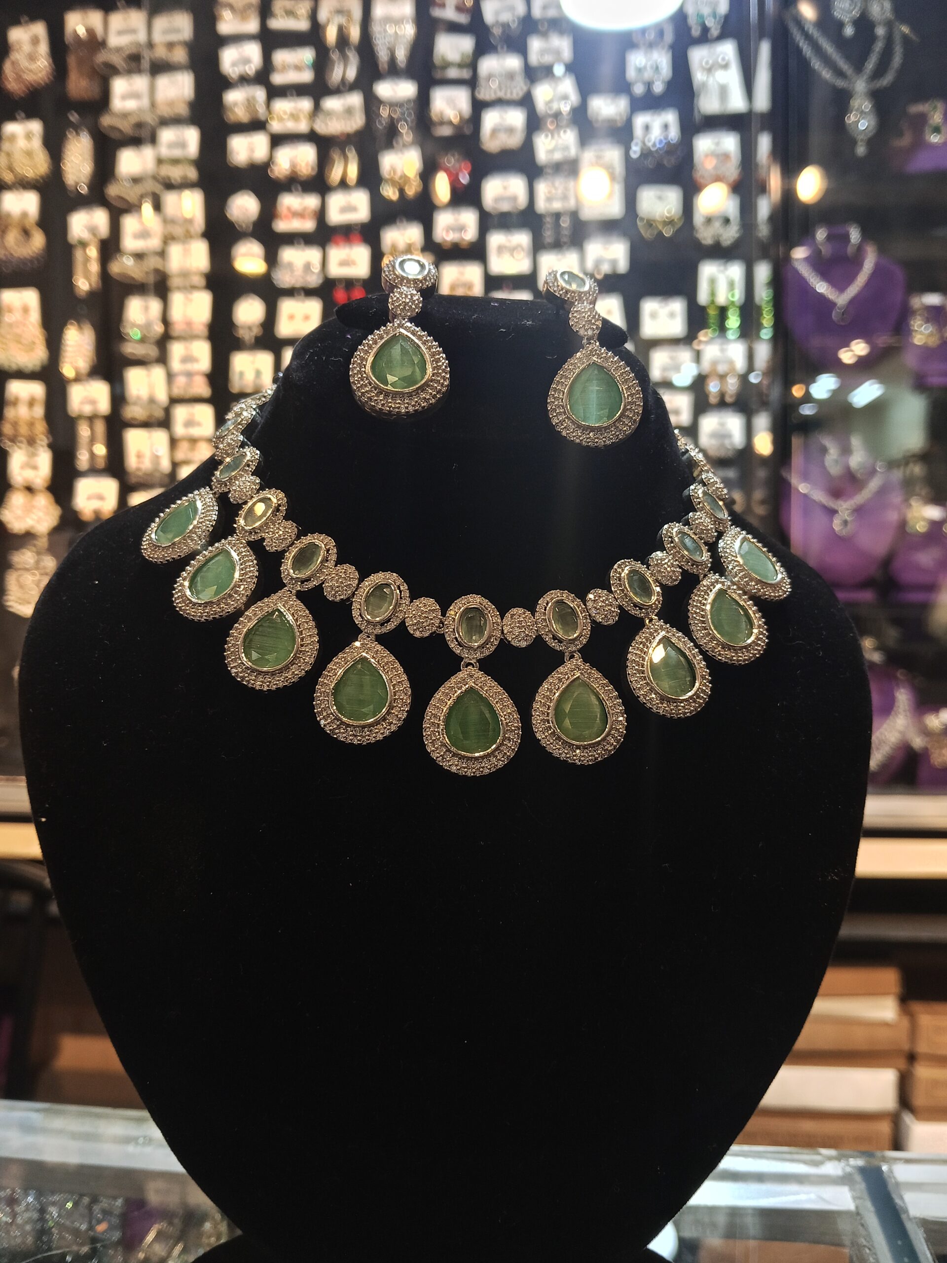 Capture the fresh essence of spring with this stunning Mint Green Tear Drop Jewelry Set. This eye-catching ensemble features a bold necklace with cascading pear-shaped, faceted Mint Green (or Light Peridot) gemstones. Each stone is framed by a shimmering halo of tiny clear rhinestones, all set in a luminous silver-toned metal. The matching drop earrings perfectly complete the look. The sophisticated design and delicate color make this set a beautiful choice for formal events, Mehndi ceremonies, Mayun functions, or adding a vibrant splash of color to bridal party attire.