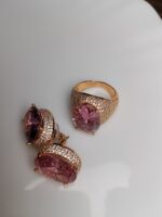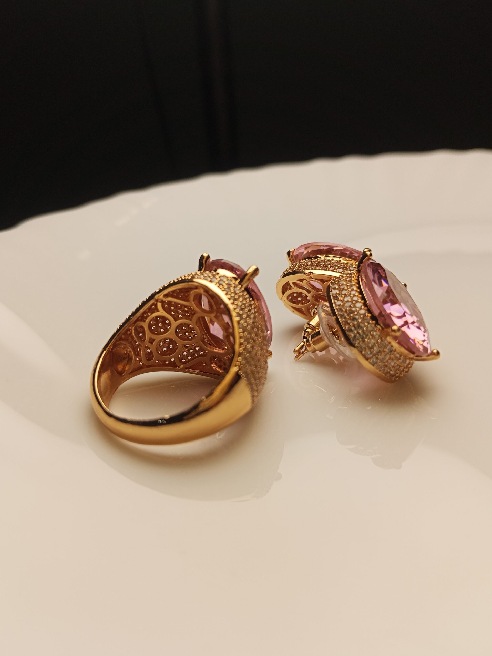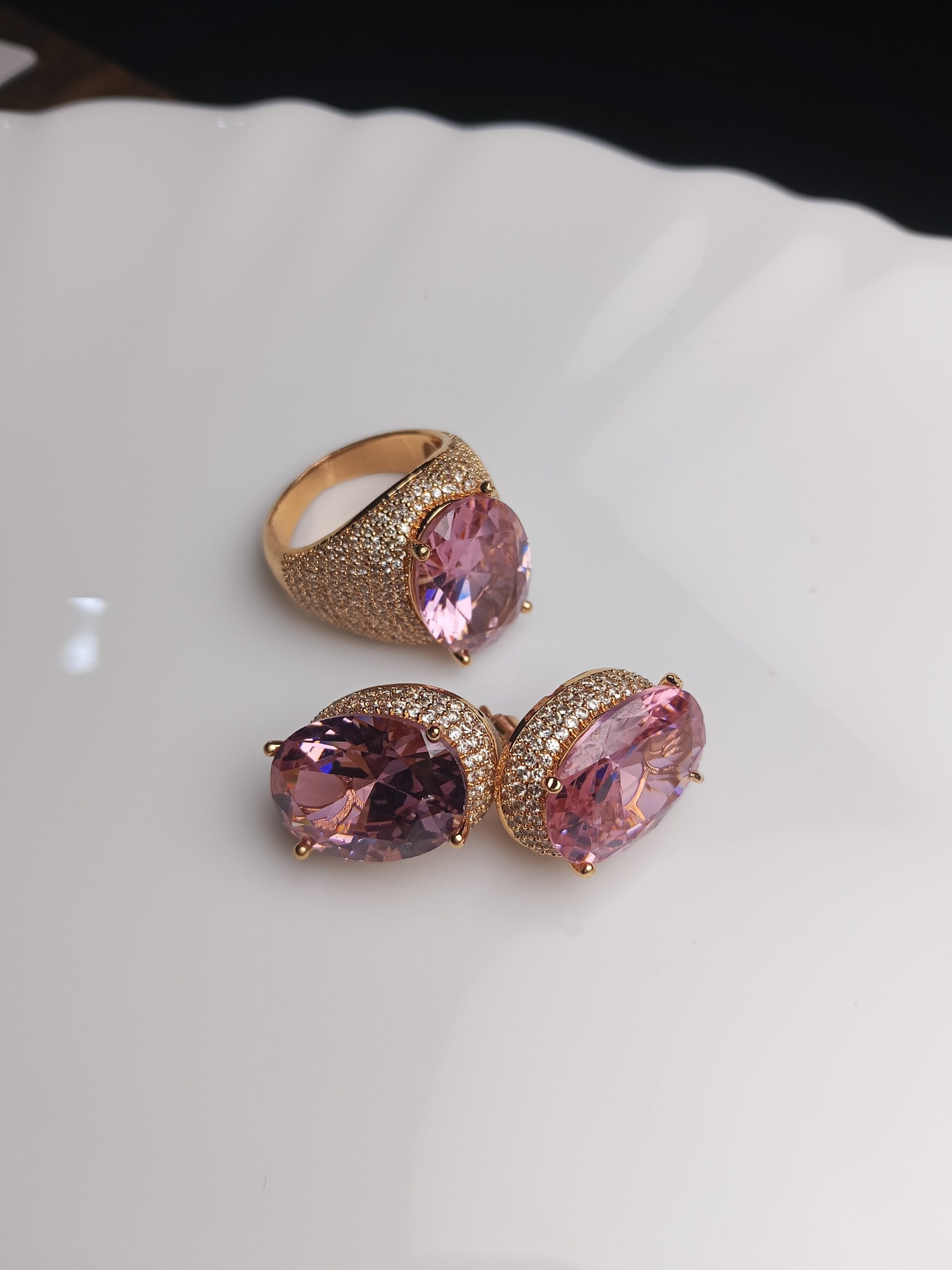 Oval Pink Zircon Rose Gold Plated Jewelry Set | Statement Ring & Stud Earrings