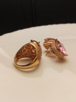 Embrace romantic elegance with the Rose Gold Pink Bloom Pave Set. This luxurious two-piece collection includes stunning stud earrings and a matching statement ring, both featuring a magnificent, large oval-cut pink zircon. The beautiful, soft hue of the stone captures light brilliantly, reminiscent of fine kunzite or rose quartz.