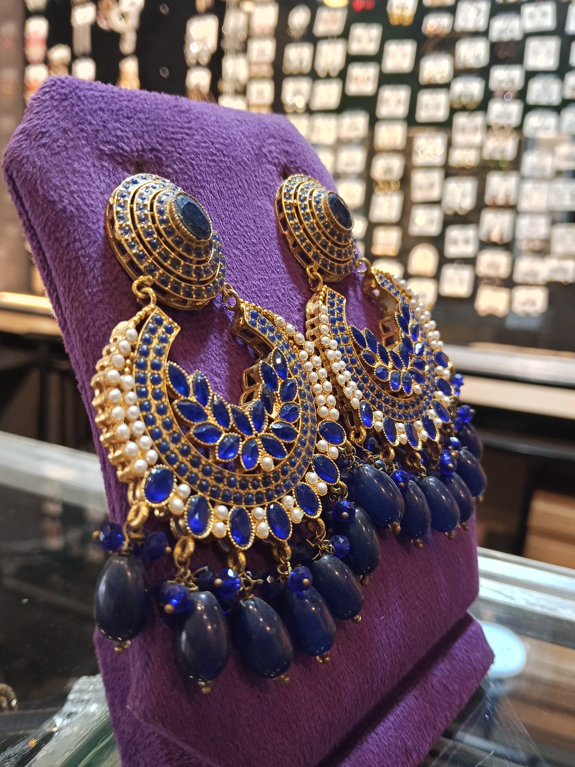 Regal Deep Blue Sapphire & Gold Chandbali Earrings with Beaded Drops