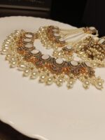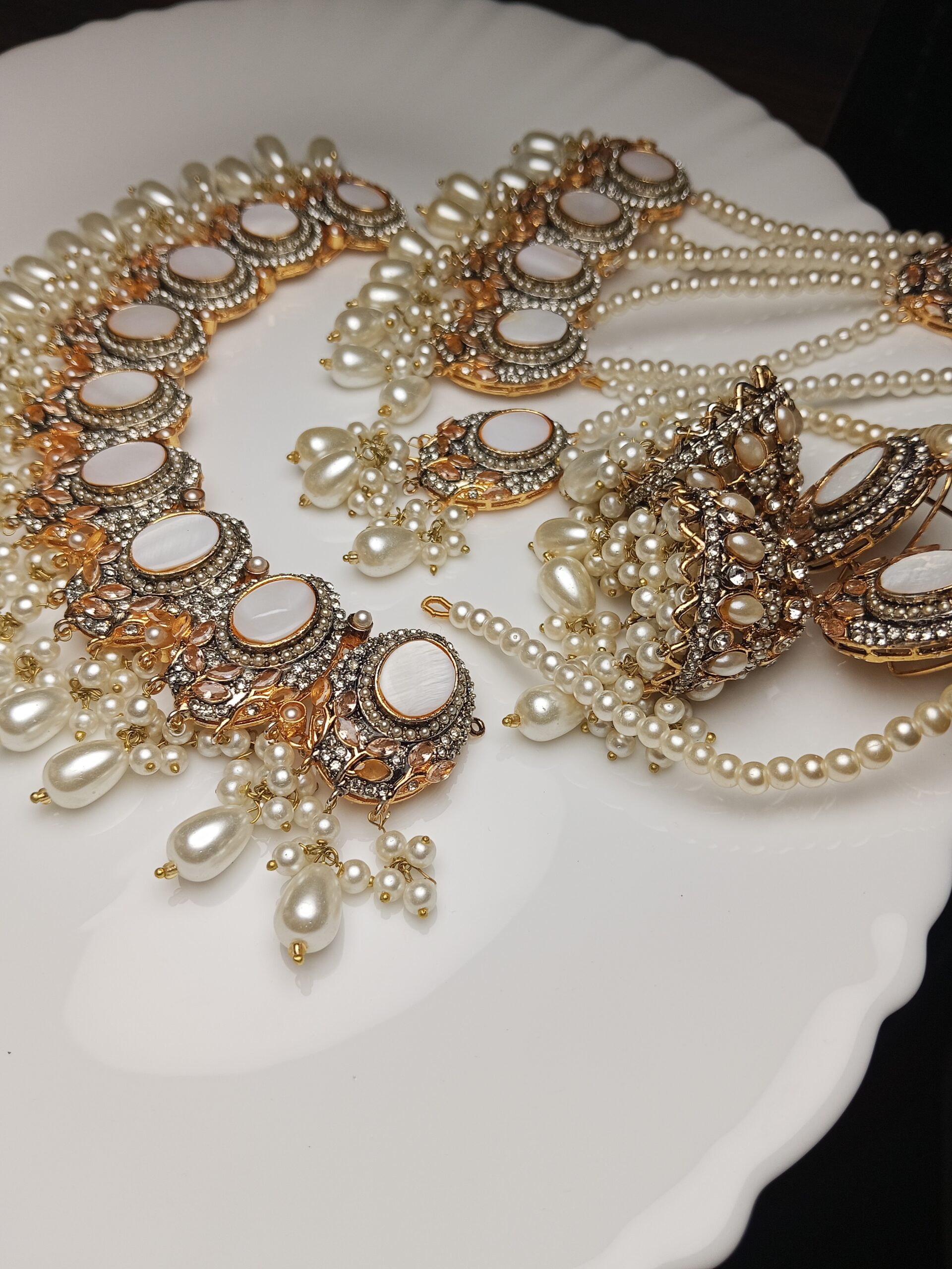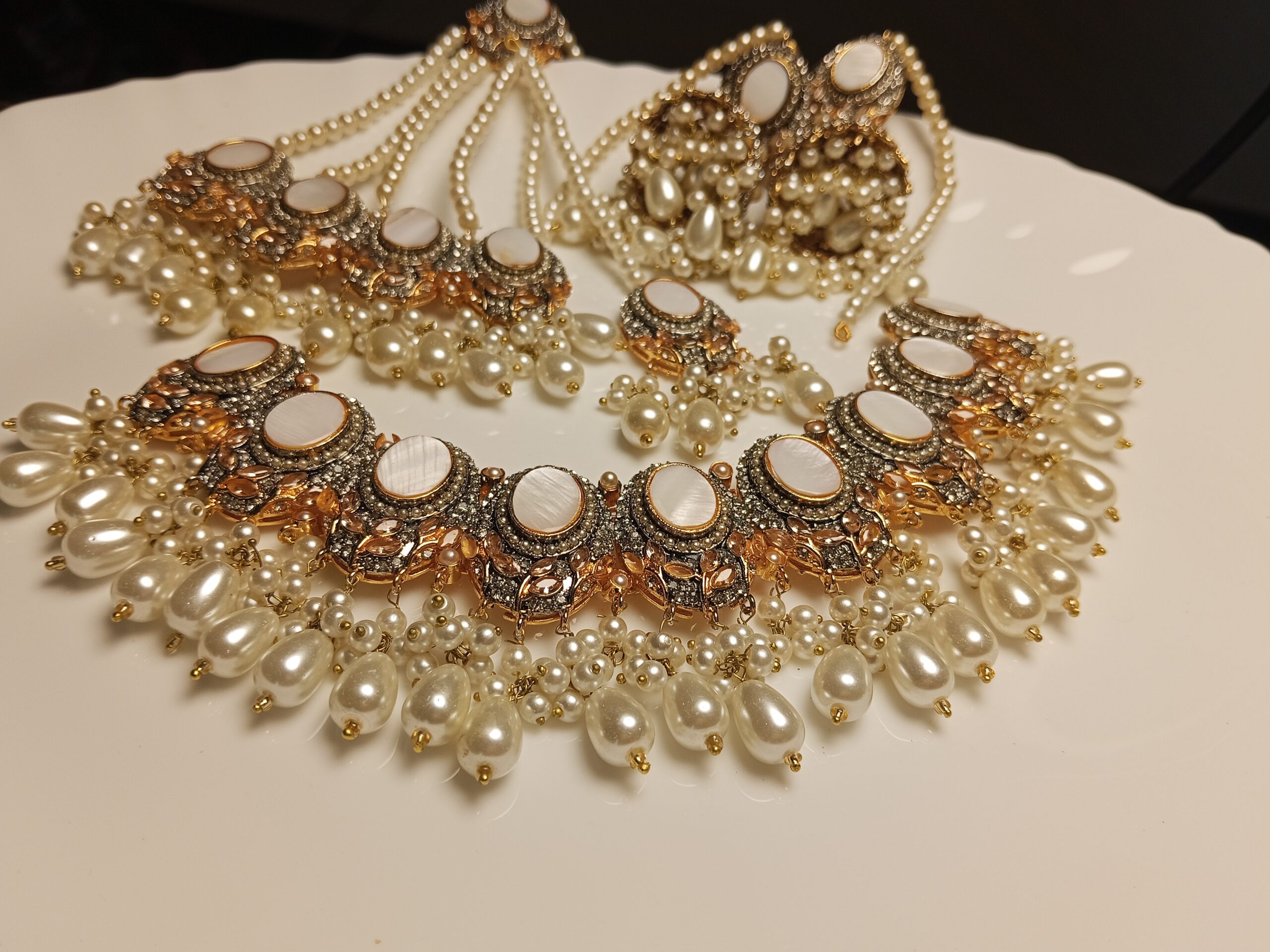• Design: Traditional Pakistani/Indian inspired design with heavy pearl detailing and an opulent gold-tone finish.