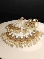 2. Matching Earrings (Jhumki/Kashmiri Style): Beautiful studs that mirror the necklace design, complete with multi-strand pearl saharas (chains) for added drama and traditional appeal.