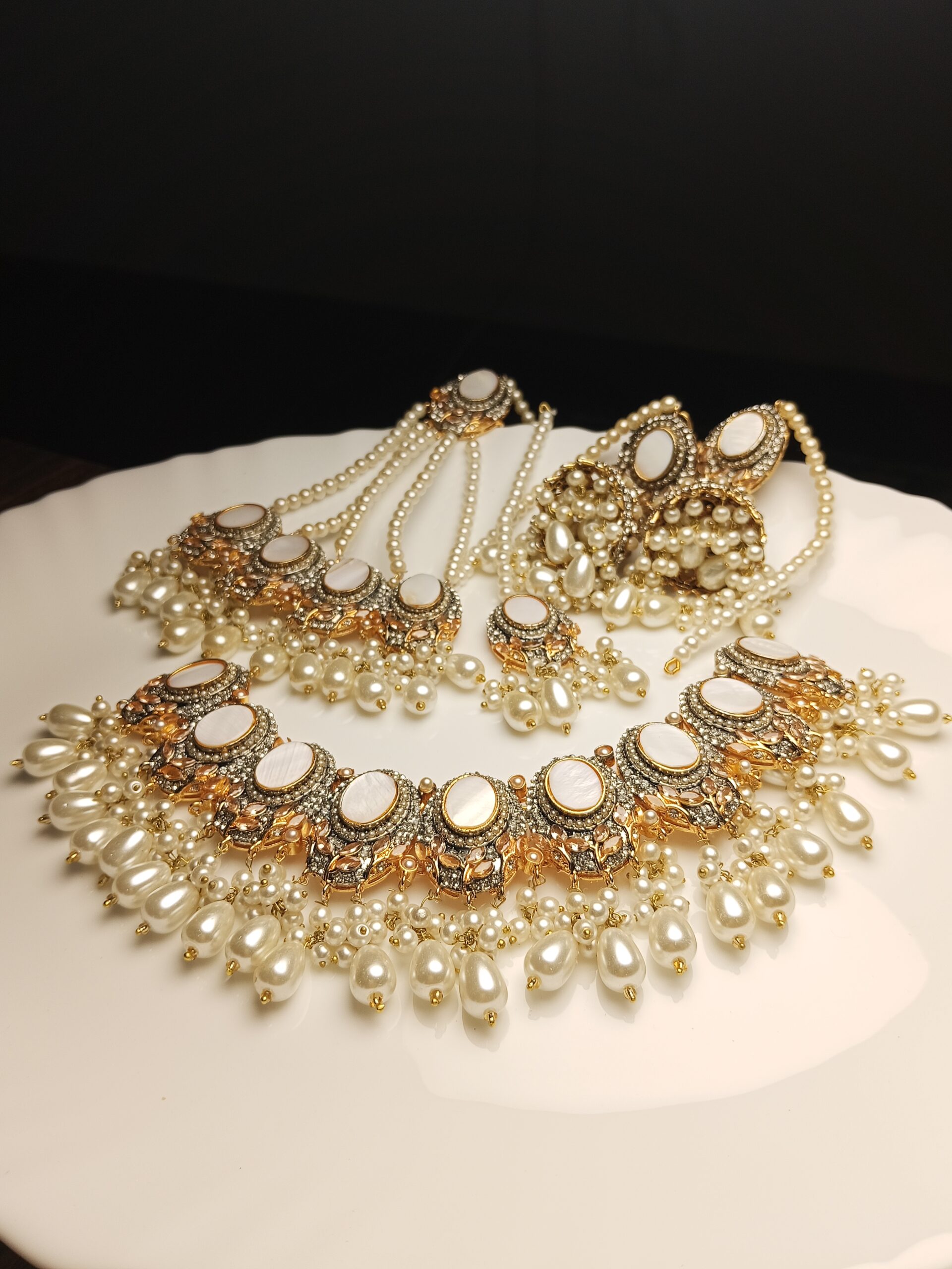 Step into timeless elegance with this breathtaking three-piece jewelry set, perfect for a bride, bridesmaids, or any grand festive occasion. The set features a stunning choker necklace and matching earrings, all dripping with lustrous pearl accents and set in a rich antique gold finish.
