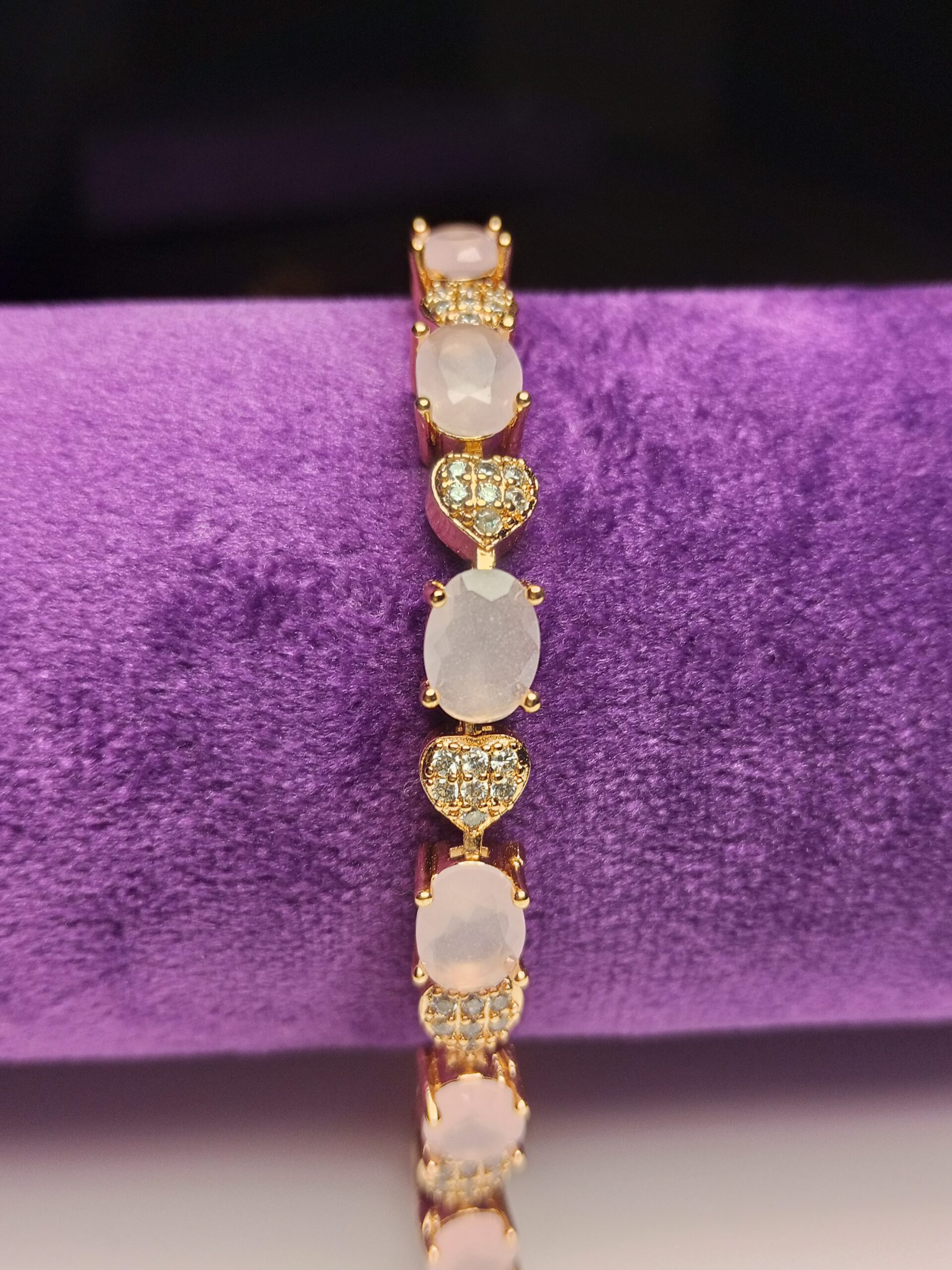 - Design: Linked bracelet featuring oval pink cabochon stones and heart-shaped accents.