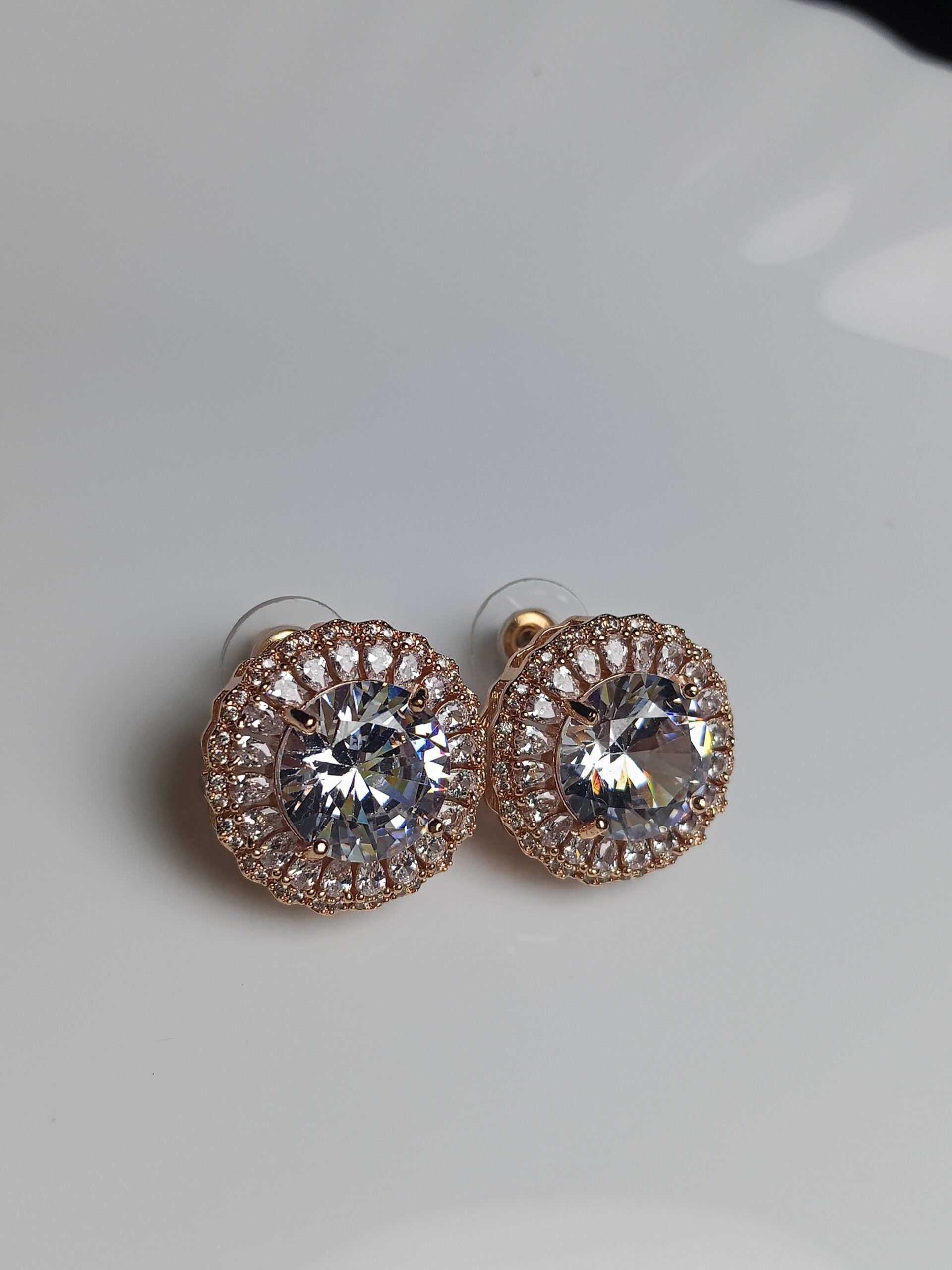 Rose Gold Plated Round Stud Earrings with Cubic Zirconia Halo