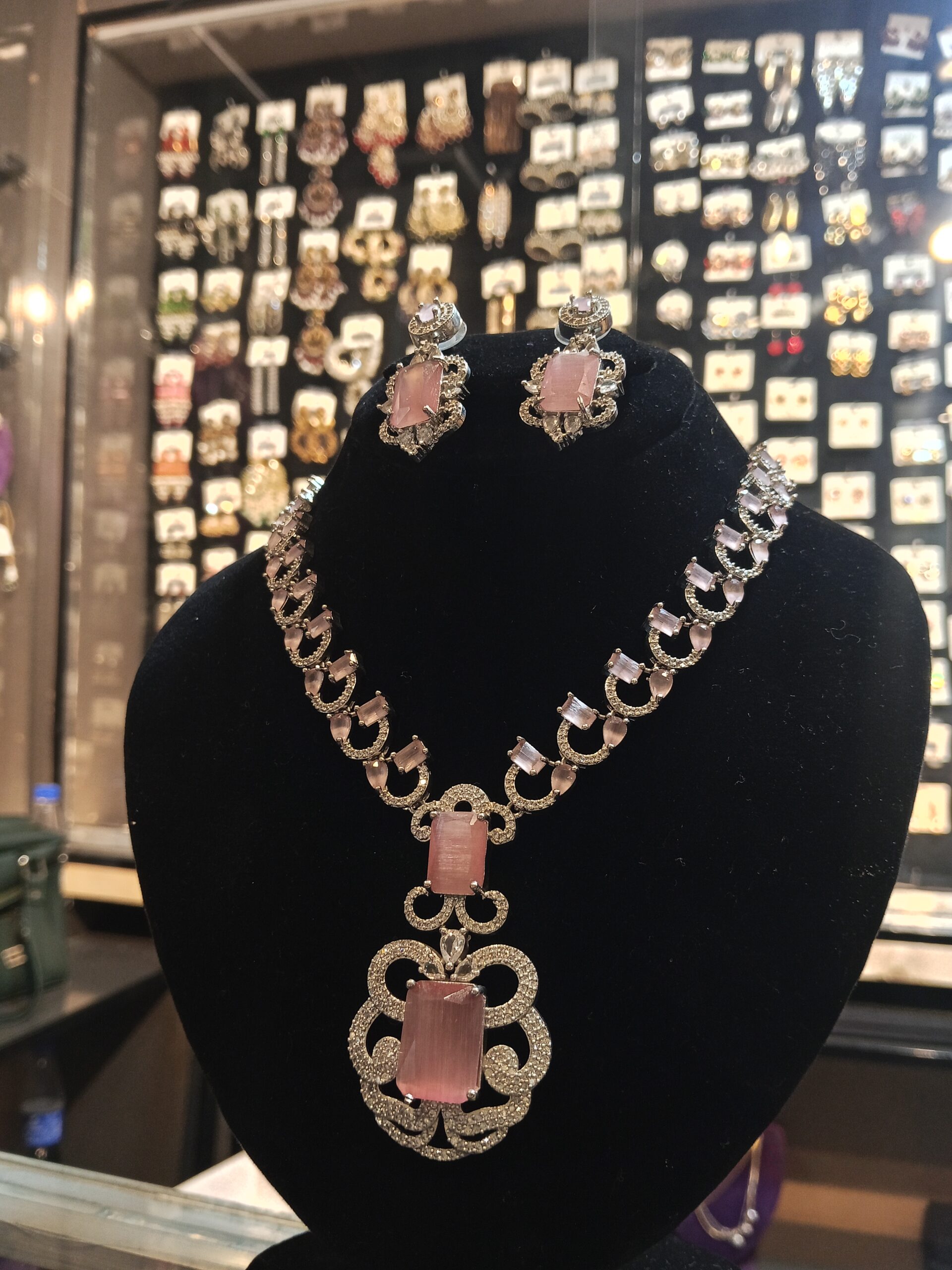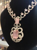 - Focal Point: Oversized central pendant with a large rectangular pink stone, framed by dazzling scrollwork.