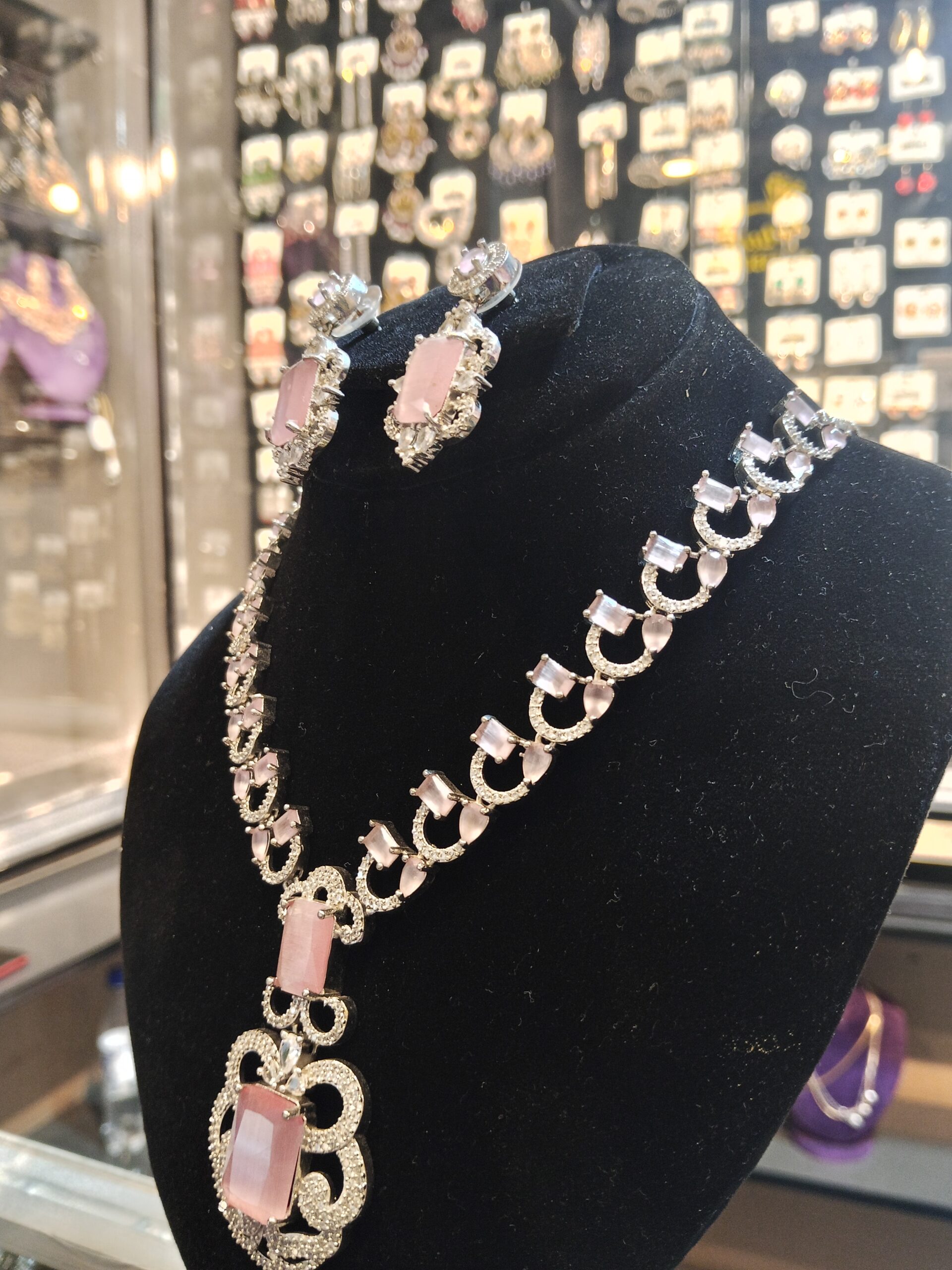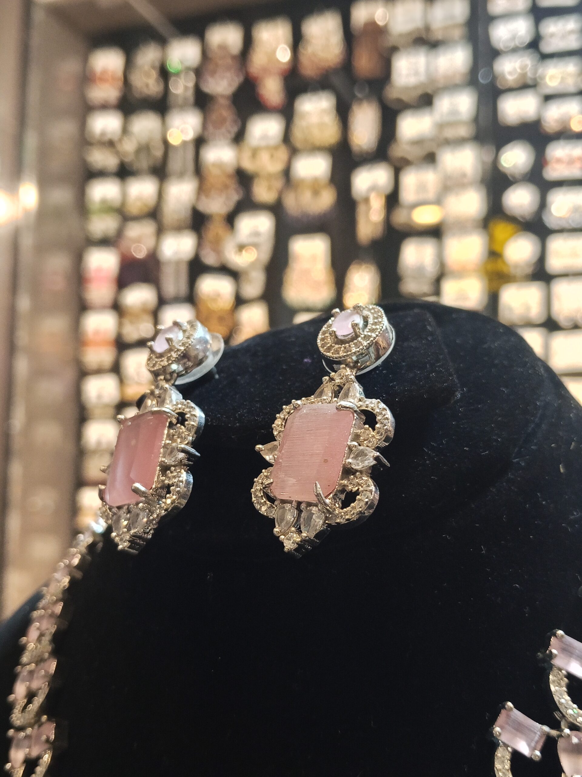 Indulge in soft romance with this exquisite Rose Quartz Pink Jewelry Set. This captivating statement necklace features a linked chain of soft pink, curved, and square-cut stones, leading to a majestic, intricate pendant. The large central pink rectangular stone is beautifully suspended within a dazzling, detailed silver-toned frame encrusted with brilliant micro-pave crystals. The matching drop earrings feature the same elegant rectangular pink stone. Perfect for engagements, Walima events, or any occasion demanding subtle color and high-wattage sparkle, this set offers a blend of vintage charm and modern luxury.