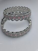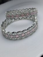 Rose Quartz Pink Zircon Luxury Bangle Set – Silver Pave Kada for Brides