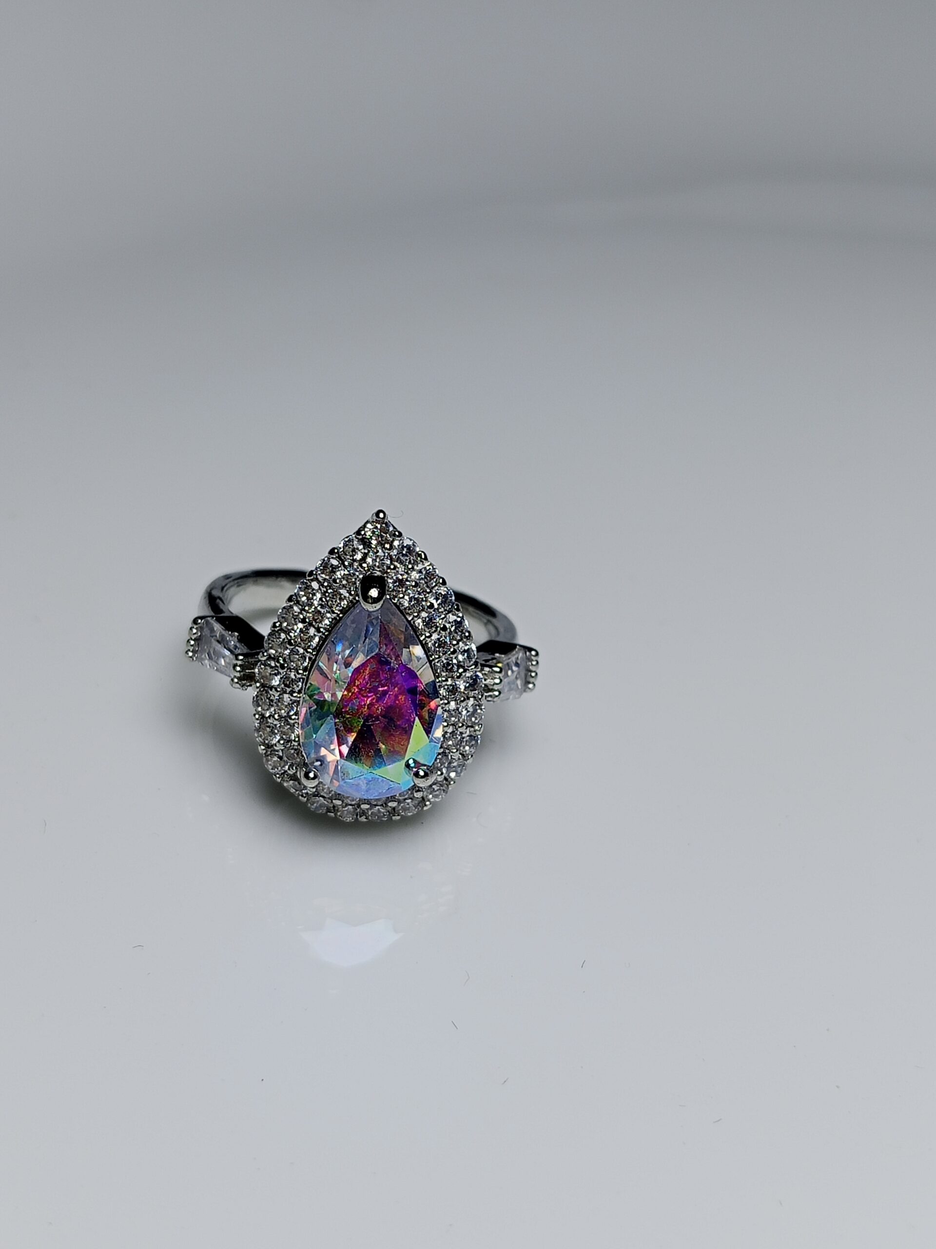 Capture the light and attention with the mesmerizing Silver Plated Pear Cut Halo Ring. This magnificent piece features a large, brilliant-cut central stone in a teardrop (pear) shape that exhibits a spectacular Aurora Borealis (AB) effect, reflecting a spectrum of rainbow colors as it moves.