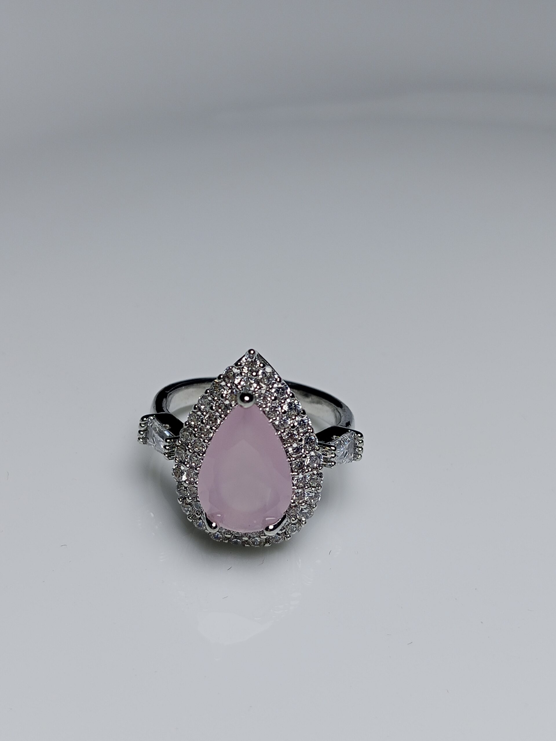 • Main Stone: Opaque, Cabochon-cut Pink Teardrop Stone (likely Rose Quartz or similar).