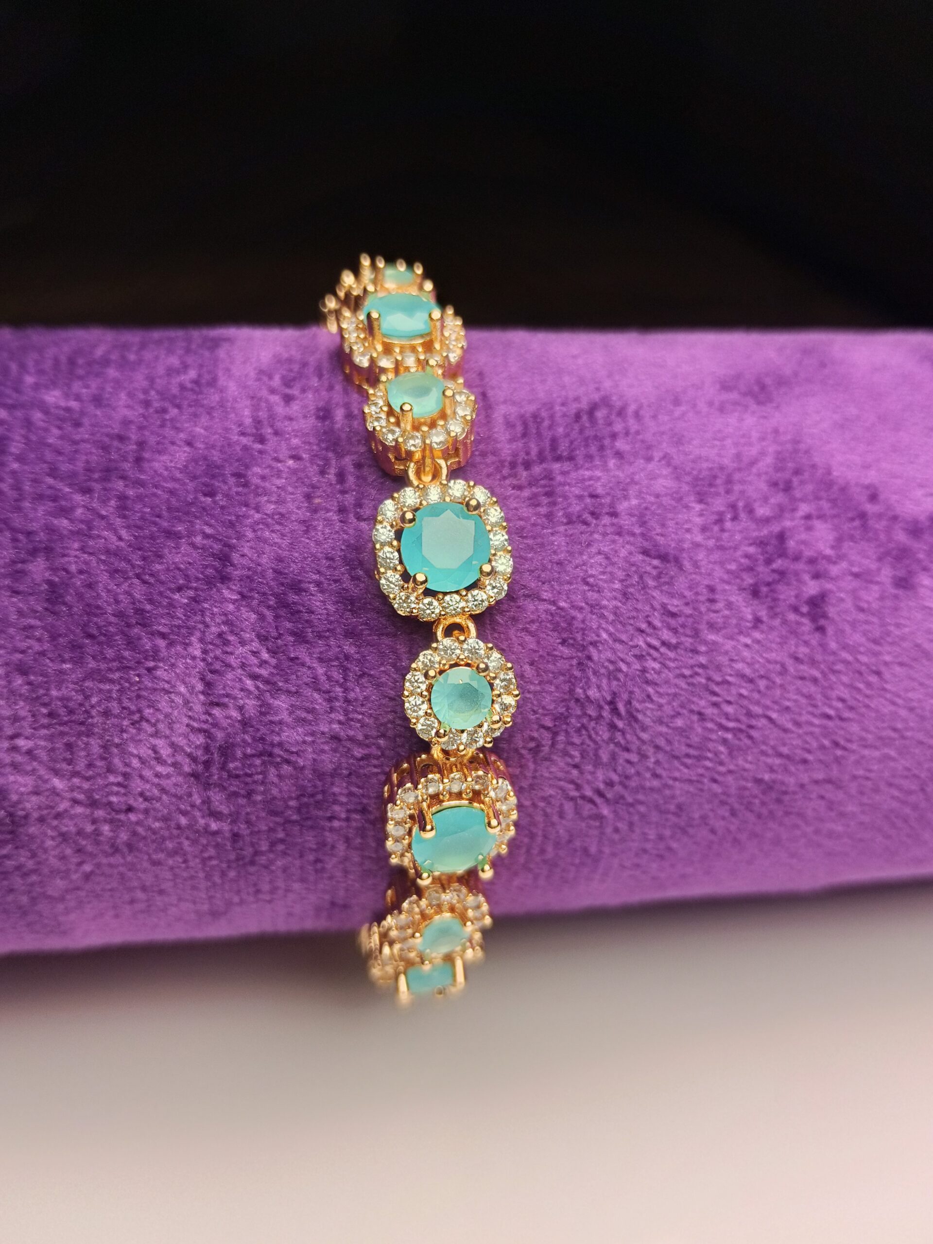 This exquisite tennis bracelet adds a touch of vibrant color and sparkle to your wrist. It features captivating aqua stones surrounded by a halo of micro-rhinestones, all set in a contemporary rose gold-tone finish. It’s the perfect statement piece for modern elegance.